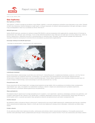 raport_pl_gaz_lupkowy_2012 Gaz łupkowy Gaz łupkowy w Polsce "Pas łupkowy" w Polsce rozciąga się od północy kraju (Słupsk, Gdańsk), w kierunku południowo-wschodnim przez Warszawę, aż po Lublin i Zamość. W 2012 roku Państwowy Instytut Geologiczny wydał raport, w którym oszacował, że wielkość niekonwencjonalnych złóż gazu ziemnego w naszym 3 kraju prawdopodobnie mieści się w przedziale od 346 do 768 mld m . ORLEN Upstream Spółka ORLEN Upstream, powołana do realizacji strategii PKN ORLEN w zakresie eksploatacji złóż węglowodorów, posiada obecnie 10 koncesji na poszukiwanie ropy naftowej i gazu ziemnego, w tym ze złóż niekonwencjonalnych (typu shale gas oraz tight gas) na terenie całego kraju: osiem na terenie Lubelszczyzny i Mazowsza oraz dwie w centralnej Polsce (w okolicach Łodzi i Sieradza). Łącznie Koncern posiada 10% powierzchni wszystkich obszarów koncesyjnych na terenie których prowadzone są poszukiwania węglowodorów. Koncesje należące do ORLEN Upstream - Koncesje na poszukiwanie i rozpoznawanie złóż węglowodorów Lokalizacja instalacji Powierzchnia obszaru zajmowanego na potrzeby prac wiertniczych i intensyfikacyjnych, w pojedynczej lokalizacji, wynosi ok. 1,5-3 ha. Na tym terenie montowane są urządzenia wiertnicze i szczelinujące, a po zakończeniu fazy poszukiwawczej, tworzona jest napowierzchniowa infrastruktura, służąca do oczyszczania i przesyłu pozyskiwanego gazu. Zwykle obszar zajmowany przez instalację wydobywczą jest około 10krotnie mniejszy od pierwotnego, wykorzystywanego na potrzeby poszukiwań (0,1- 0,3 ha). Poszukiwanie złóż Proces poszukiwań złóż jest długotrwały i wymaga przeprowadzenia szeregu badań, które są podstawą do określenia miejsc występowania nagromadzeń ropy i gazu, ich zasobów oraz opłacalności wydobycia. Jednym z etapów prac poszukiwawczych są badania sejsmiczne, wykorzystywane w przemyśle naftowo-gazowniczym od ponad 80 lat. Mapy geologiczne Gromadzenie danych sejsmicznych wymaga specjalistycznych urządzeń, w tym ciężarówek z aparaturą wzbudzającą wibracje oraz geofonów, czyli urządzeń rejestrujących fale. Zebrane w ten sposób dane, a następnie odpowiednio przetworzone i zinterpretowane, dostarczają informacji na temat budowy ziemi, co pozwala sporządzać mapy geologiczne obszarów perspektywicznych pod kątem występowania złóż Analiza danych Na podstawie analizy archiwalnych danych (otworowych i sejsmicznych) oraz nowych badań sejsmicznych, podejmowana jest decyzja o lokalizacji otworu poszukiwawczo-badawczego. Dopiero w chwili, gdy wyniki prac badawczych okazują się być obiecujące, realizowane są kolejne etapy działań. Próbki rdzenia W celu pobrania próbek skały łupkowej do analizy, wykonywany jest pionowy odwiert poszukiwawczo-badawczy. W przypadku pozytywnych wyników analiz pobranego rdzenia, podejmowana jest decyzja o kontynuacji prac na danym terenie. W tym celu wykonywany jest kolejny odwiert - horyzontalny, a w dalszej kolejności stosuje się zabiegi intensyfikacyjne, w tym tzw. szczelinowanie hydrauliczne, mające na celu uwolnienie gazu ze skały do otworu wiertniczego, tak aby możliwe było zbadanie przepływu surowca. Konstrukcja otworu wiertniczego Aby dosięgnąć gazonośnych skał ilasto-mułowcowych, tzw. skał łupkowych, znajdujących się kilka kilometrów pod ziemią, niezbędne jest wykonanie odwiertów. Wiercenie nie oznacza jednak wydobycia. Eksploatacja jest zależna od rezultatów prac poszukiwawczych. Rozróżnia się odwierty pionowe i kierunkowe (inaczej poziome, horyzontalne). W celu zachowania bezpieczeństwa wód podziemnych każdy odwiert zostaje orurowany kilkoma kolumnami rur oraz dodatkowo wzmocniony i uszczelniony cementem. Zapewnienie pełnej szczelności odwiertu jest technologicznym warunkiem dla późniejszego wydobycia węglowodorów, jak również gwarantuje bezpieczeństwo strefy przyodwiertowej, dlatego właściwe wykonanie konstrukcji, potwierdza się na kilku etapach prac za pomocą ciśnieniowych testów szczelności. Montaż wiertni Urządzenie wiertnicze umożliwia wykonanie otworu w ziemi za pomocą świdra wiertniczego przemieszczającego się wgłąb na tzw. przewodzie wiertniczym. Montaż wiertni następuje po odpowiednim przygotowaniu placu, poprzez wyłożenie go ochronną folią i płytami betonowymi. Prace z wykorzystaniem urządzenia wiertniczego trwają 24 godziny na dobę, 7 dni w tygodniu, przez około 6-8 tygodni. Monitorowanie Przebieg prac jest na bieżąco monitorowany i kontrolowany, zarówno przez samego operatora, jak i dedykowane do tego instytucje (np. Okręgowy Urząd Górniczy). Działalność poszukiwawczo- -wydobywczą szczegółowo reguluje również prawo. Dla przykładu hałas w ciągu dnia nie przekracza 55 decybeli, a w nocy 45 decybeli, co jest zgodne z rozporządzeniem Ministra Środowiska w sprawie dopuszczalnych poziomów hałasu w środowisku. Potężny dźwig Urządzenie wiertnicze/platforma wiertnicza (np. na morzu), to kilkudziesięciometrowy dźwig, wyposażony dodatkowo w generatory prądu, pompy, system płuczkowy oraz inne elementy konstrukcyjne. Po odwierceniu otworu instalacja zostaje zdemontowana i przewieziona na kolejną lokalizacj Ochrona środowiska Zgodnie z planem gospodarki odpadami, stałe odpady górnicze (zwierciny - czyli fragmenty skał), powstałe podczas wiercenia, są na bieżąco wywożone i utylizowane. Zużyte płyny pochodzenia górniczego są zwykle ponownie wykorzystywane przy kolejnym wierceniu, a nieczystości komunalne są oczyszczane. Plan gospodarki odpadami przygotowywany jest i zatwierdzany każdorazowo dla danej lokalizacji wiercenia. Produkcja gazu W Stanach Zjednoczonych gaz z samych łupków pokrywa około 14% całkowitej produkcji gazu ziemnego i może być on z powodzeniem eksportowany do Europy i innych części świata. Potencjał zatrudnienia W Stanach Zjednoczonych wydobycie gazu ziemnego i ropy naftowej ze