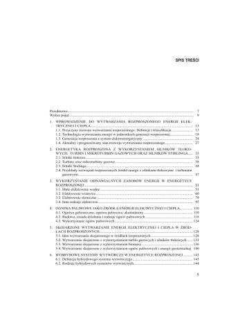 SPIS TREŚCI Przedmowa...................................................................................................................................... 7 Wykaz pojęć .................................................................................................................................... 9 1. WPROWADZENIE DO WYTWARZANIA ROZPROSZONEGO ENERGII ELEKTRYCZNEJ I CIEPŁA ............................................................................................................ 1.1. Przyczyny rozwoju wytwarzania rozproszonego. Definicje i klasyfikacja ...................... 1.2. Technologia wytwarzania energii w jednostkach generacji rozproszonej ........................ 1.3. Generacja rozproszona a system elektroenergetyczny ..................................................... 1.4. Aktualny i prognozowany stan rozwoju wytwarzania rozproszonego ............................. 2. ENERGETYKA ROZPROSZONA Z WYKORZYSTANIEM SILNIKÓW TŁOKOWYCH, TURBIN I MIKROTURBIN GAZOWYCH ORAZ SILNIKÓW STIRLINGA..... 2.1. Silniki tłokowe .................................................................................................................. 2.2. Turbiny oraz mikroturbiny gazowe .................................................................................. 2.3. Silniki Stirlinga ................................................................................................................. 2.4. Przykłady rozwiązań rozproszonych źródeł energii z silnikami tłokowymi i turbinami gazowymi.......................................................................................................................... 3. WYKORZYSTANIE ODNAWIALNYCH ZASOBÓW ENERGII W ENERGETYCE ROZPROSZONEJ ................................................................................................................... 3.1. Małe elektrownie wodne .................................................................................................. 3.2. Elektrownie wiatrowe ....................................................................................................... 3.3. Elektrownie słoneczne ...................................................................................................... 3.4. Inne rodzaje elektrowni .................................................................................................... 13 13 18 24 27 33 33 38 44 47 51 51 60 79 95 4. OGNIWA PALIWOWE JAKO ŹRÓDŁA ENERGII ELEKTRYCZNEJ I CIEPŁA.............. 110 4.1. Ogniwa galwaniczne, ogniwa paliwowe, akumulatory .................................................... 110 4.2. Budowa, zasada działania i rodzaje ogniw paliwowych .................................................. 118 4.3. Wykorzystanie ogniw paliwowych ................................................................................... 124 5. SKOJARZONE WYTWARZANIE ENERGII ELEKTRYCZNEJ I CIEPŁA W ŹRÓDŁACH ROZPROSZONYCH ................................................................................................... 128 5.1. Idea wytwarzania skojarzonego w źródłach rozproszonych ............................................ 128 5.2. Wytwarzanie skojarzone z wykorzystaniem turbin gazowych i silników tłokowych ...... 131 5.3. Wytwarzanie skojarzone z wykorzystaniem biomasy ...................................................... 136 5.4. Wytwarzanie skojarzone z wykorzystaniem ogniw paliwowych i energii geotermalnej 140 6. HYBRYDOWE SYSTEMY WYTWÓRCZE W ENERGETYCE ROZPROSZONEJ .......... 143 6.1. Definicja hybrydowego systemu wytwórczego ................................................................ 143 6.2. Rodzaje hybrydowych systemów wytwórczych............................................................... 144 5 6.3. Wykorzystanie zasobników energii w układach hybrydowych ........................................ 147 6.4. Przykłady rozwiązań układów hybrydowych ................................................................... 155 7. STEROWANIE I NADZÓR W ENERGETYCE ROZPROSZONEJ. UKŁADY ENERGOELEKTRONICZNE I MIKROSIECI ..................................................................................... 163 7.1. Problemy sterowania i nadzoru w układach rozproszonych źródeł energii elektrycznej i ciepła............................................................................................................................... 163 7.2. Urządzenia i układy energoelektroniczne stosowane w energetyce rozproszonej ........... 165 7.3. Wykorzystanie mikrosieci do integracji źródeł rozproszonych ........................................ 168 8. ASPEKTY FORMALNOPRAWNE ROZWOJU ENERGETYKI ROZPROSZONEJ .......... 177 8.1. Regulacje prawne ............................................................................................................. 177 8.2. System wsparcia i promocji OZE ..................................................................................... 183 8.3. System wsparcia i promocji wytwarzania skojarzonego .................................................. 187 9. ASPEKTY EKONOMICZNE ROZPROSZONEGO WYTWARZANIA ENERGII ELEKTRYCZNEJ I CIEPŁA ............................................................................................................ 192 9.1. Metodyka obliczania kosztów wytwarzania energii elektrycznej i/lub ciepła w źródłach rozproszonych ........................................................................................................... 192 9.2. Podstawowe dane i koszty wytwarzania wg Komisji Europejskiej ................................. 195 9.3. Metodyka oceny ekonomicznej projektów inwestycyjnych rozproszonych źródeł energii ...................................................................................................................................... 199 9.4. Propozycja zintegrowanej metodyki oceny efektywności odnawialnych źródeł energii 202 10. WYBRANE ZAGADNIENIA PRACY ROZPROSZONYCH ŹRÓDEŁ ENERGII W SYSTEMIE ELEKTROENERGETYCZNYM ............................