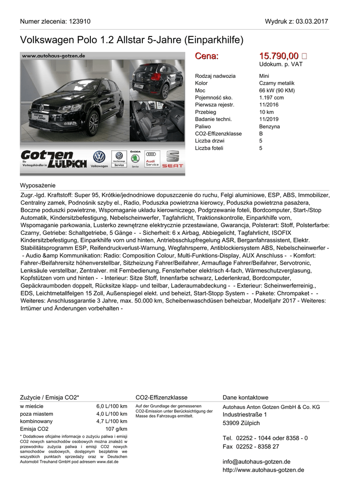 Numer zlecenia: 123910 Wydruk z: 03.03.2017 Volkswagen Polo 1.2 Allstar 5-Jahre (Einparkhilfe) Cena: 15.790,00 Rodzaj nadwozia Kolor Moc Pojemność sko. Pierwsza rejestr. Przebieg Badanie techni. Paliwo CO2-Effizenzklasse Liczba drzwi Liczba foteli Mini Czarny metalik 66 kW (90 KM) 1.197 ccm 11/2016 10 km 11/2019 Benzyna B 5 5 Udokum. p. VAT Wyposażenie Zugr.-lgd. Kraftstoff: Super 95, Krótkie/jednodniowe dopuszczenie do ruchu, Felgi aluminiowe, ESP, ABS, Immobilizer, Centralny zamek, Podnośnik szyby el., Radio, Poduszka powietrzna kierowcy, Poduszka powietrzna pasażera, Boczne poduszki powietrzne, Wspomaganie układu kierowniczego, Podgrzewanie foteli, Bordcomputer, Start-/Stop Automatik, Kindersitzbefestigung, Nebelscheinwerfer, Tagfahrlicht, Traktionskontrolle, Einparkhilfe vorn, Wspomaganie parkowania, Lusterko zewnętrzne elektrycznie przestawiane, Gwarancja, Polsterart: Stoff, Polsterfarbe: Czarny, Getriebe: Schaltgetriebe, 5 Gänge - - Sicherheit: 6 x Airbag, Abbiegelicht, Tagfahrlicht, ISOFIX Kindersitzbefestigung, Einparkhilfe vorn und hinten, Antriebsschlupfregelung ASR, Berganfahrassistent, Elektr. Stabilitätsprogramm ESP, Reifendruckverlust-Warnung, Wegfahrsperre, Antiblockiersystem ABS, Nebelscheinwerfer - Audio & Kommunikation: Radio: Composition Colour, Multi-Funktions-Display, AUX Anschluss - - Komfort: Fahrer-/Beifahrersitz höhenverstellbar, Sitzheizung Fahrer/Beifahrer, Armauflage Fahrer/Beifahrer, Servotronic, Lenksäule verstellbar, Zentralver. mit Fernbedienung, Fensterheber elektrisch 4-fach, Wärmeschutzverglasung, Kopfstützen vorn und hinten - - Interieur: Sitze Stoff, Innenfarbe schwarz, Lederlenkrad, Bordcomputer, Gepäckraumboden doppelt, Rücksitze klapp- und teilbar, Laderaumabdeckung - - Exterieur: Scheinwerferreinig., EDS, Leichtmetallfelgen 15 Zoll, Außenspiegel elekt. und beheizt, Start-Stopp System - - Pakete: Chrompaket - Weiteres: Anschlussgarantie 3 Jahre, max. 50.000 km, Scheibenwaschdüsen beheizbar, Modelljahr 2017 - Weiteres: Irrtümer und Änderungen vorbehalten - Zużycie / Emisja CO2* w mieście poza miastem kombinowany Emisja CO2 6,0 L/100 km 4,0 L/100 km 4,7 L/100 km 107 g/km * Dodatkowe oficjalne informacje o zużyciu paliwa i emisji CO2 nowych samochodów osobowych można znaleźć w przewodniku zużycia paliwa i emisji CO2 nowych samochodów osobowych, dostępnym bezpłatnie we wszystkich punktach sprzedaży oraz w Deutschen Automobil Treuhand GmbH pod adresem www.dat.de CO2-Effizenzklasse Dane kontaktowe Auf der Grundlage der gemessenen CO2-Emission unter Berücksichtigung der Masse des Fahrzeugs ermittelt. Autohaus Anton Gotzen GmbH & Co. KG Industriestraße 1 53909 Zülpich Tel. 02252 - 1044 oder 8358 - 0 Fax 02252 - 8358 27 [email protected] http://www.autohaus-gotzen.de Numer zlecenia: 123910 Volkswagen Polo 1.2 Allstar 5-Jahre (Einparkhilfe) Wydruk z: 03.03.2017 Numer zlecenia: 123910 Volkswagen Polo 1.2 Allstar 5-Jahre (Einparkhilfe) Wydruk z: 03.03.2017