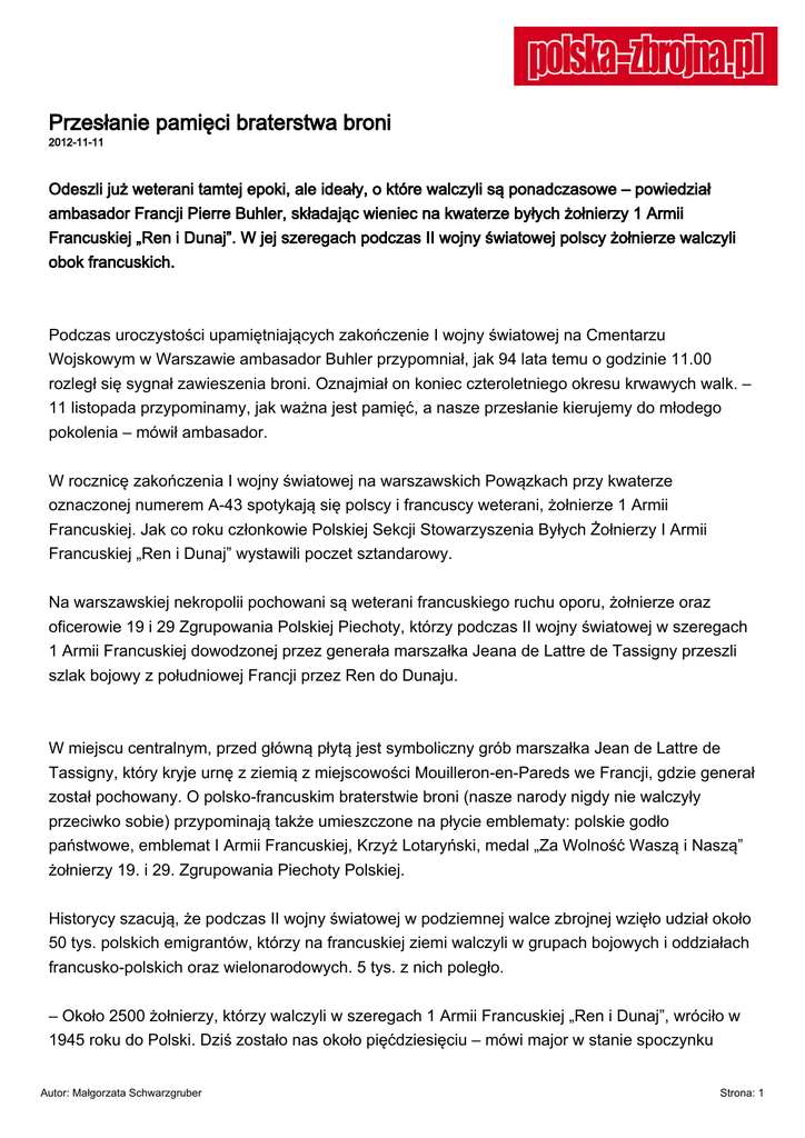 Przesłanie pamięci braterstwa broni 2012-11-11 Odeszli już weterani tamtej epoki, ale ideały, o które walczyli są ponadczasowe – powiedział ambasador Francji Pierre Buhler, składając wieniec na kwaterze byłych żołnierzy 1 Armii Francuskiej „Ren i Dunaj”. W jej szeregach podczas II wojny światowej polscy żołnierze walczyli obok francuskich. Podczas uroczystości upamiętniających zakończenie I wojny światowej na Cmentarzu Wojskowym w Warszawie ambasador Buhler przypomniał, jak 94 lata temu o godzinie 11.00 rozległ się sygnał zawieszenia broni. Oznajmiał on koniec czteroletniego okresu krwawych walk. – 11 listopada przypominamy, jak ważna jest pamięć, a nasze przesłanie kierujemy do młodego pokolenia – mówił ambasador. W rocznicę zakończenia I wojny światowej na warszawskich Powązkach przy kwaterze oznaczonej numerem A-43 spotykają się polscy i francuscy weterani, żołnierze 1 Armii Francuskiej. Jak co roku członkowie Polskiej Sekcji Stowarzyszenia Byłych Żołnierzy I Armii Francuskiej „Ren i Dunaj” wystawili poczet sztandarowy. Na warszawskiej nekropolii pochowani są weterani francuskiego ruchu oporu, żołnierze oraz oficerowie 19 i 29 Zgrupowania Polskiej Piechoty, którzy podczas II wojny światowej w szeregach 1 Armii Francuskiej dowodzonej przez generała marszałka Jeana de Lattre de Tassigny przeszli szlak bojowy z południowej Francji przez Ren do Dunaju. W miejscu centralnym, przed główną płytą jest symboliczny grób marszałka Jean de Lattre de Tassigny, który kryje urnę z ziemią z miejscowości Mouilleron-en-Pareds we Francji, gdzie generał został pochowany. O polsko-francuskim braterstwie broni (nasze narody nigdy nie walczyły przeciwko sobie) przypominają także umieszczone na płycie emblematy: polskie godło państwowe, emblemat I Armii Francuskiej, Krzyż Lotaryński, medal „Za Wolność Waszą i Naszą” żołnierzy 19. i 29. Zgrupowania Piechoty Polskiej. Historycy szacują, że podczas II wojny światowej w podziemnej walce zbrojnej wzięło udział około 50 tys. polskich emigrantów, którzy na francuskiej ziemi walczyli w grupach bojowych i oddziałach francusko-polskich oraz wielonarodowych. 5 tys. z nich poległo. – Około 2500 żołnierzy, którzy walczyli w szeregach 1 Armii Francuskiej „Ren i Dunaj”, wróciło w 1945 roku do Polski. Dziś zostało nas około pięćdziesięciu – mówi major w stanie spoczynku Autor: Małgorzata Schwarzgruber Strona: 1 Zygmunt Włodarczyk, członek Polskiej Sekcji Stowarzyszenia Byłych Żołnierzy I Armii Francuskiej „Ren i Dunaj”. Autor: Małgorzata Schwarzgruber Strona: 2