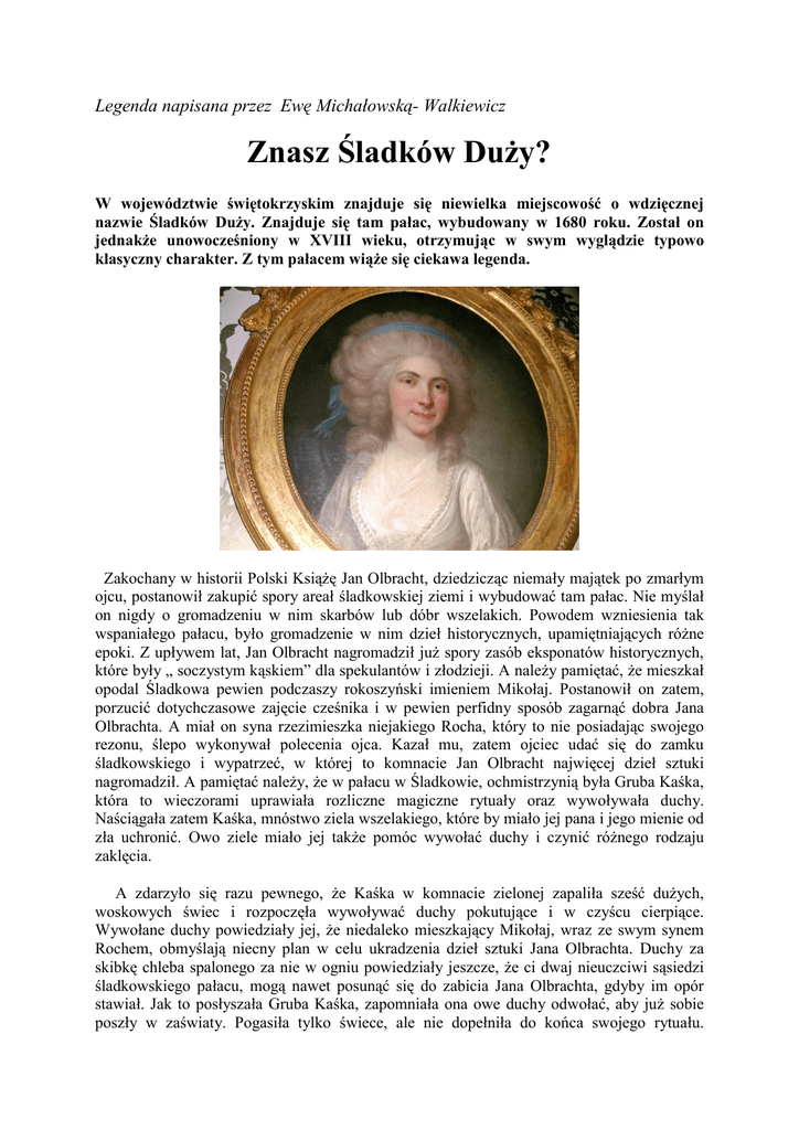 Legenda napisana przez Ewę Michałowską- Walkiewicz Znasz Śladków Duży? W województwie świętokrzyskim znajduje się niewielka miejscowość o wdzięcznej nazwie Śladków Duży. Znajduje się tam pałac, wybudowany w 1680 roku. Został on jednakże unowocześniony w XVIII wieku, otrzymując w swym wyglądzie typowo klasyczny charakter. Z tym pałacem wiąże się ciekawa legenda. Zakochany w historii Polski Książę Jan Olbracht, dziedzicząc niemały majątek po zmarłym ojcu, postanowił zakupić spory areał śladkowskiej ziemi i wybudować tam pałac. Nie myślał on nigdy o gromadzeniu w nim skarbów lub dóbr wszelakich. Powodem wzniesienia tak wspaniałego pałacu, było gromadzenie w nim dzieł historycznych, upamiętniających różne epoki. Z upływem lat, Jan Olbracht nagromadził już spory zasób eksponatów historycznych, które były „ soczystym kąskiem” dla spekulantów i złodzieji. A należy pamiętać, że mieszkał opodal Śladkowa pewien podczaszy rokoszyński imieniem Mikołaj. Postanowił on zatem, porzucić dotychczasowe zajęcie cześnika i w pewien perfidny sposób zagarnąć dobra Jana Olbrachta. A miał on syna rzezimieszka niejakiego Rocha, który to nie posiadając swojego rezonu, ślepo wykonywał polecenia ojca. Kazał mu, zatem ojciec udać się do zamku śladkowskiego i wypatrzeć, w której to komnacie Jan Olbracht najwięcej dzieł sztuki nagromadził. A pamiętać należy, że w pałacu w Śladkowie, ochmistrzynią była Gruba Kaśka, która to wieczorami uprawiała rozliczne magiczne rytuały oraz wywoływała duchy. Naściągała zatem Kaśka, mnóstwo ziela wszelakiego, które by miało jej pana i jego mienie od zła uchronić. Owo ziele miało jej także pomóc wywołać duchy i czynić różnego rodzaju zaklęcia. A zdarzyło się razu pewnego, że Kaśka w komnacie zielonej zapaliła sześć dużych, woskowych świec i rozpoczęła wywoływać duchy pokutujące i w czyścu cierpiące. Wywołane duchy powiedziały jej, że niedaleko mieszkający Mikołaj, wraz ze swym synem Rochem, obmyślają niecny plan w celu ukradzenia dzieł sztuki Jana Olbrachta. Duchy za skibkę chleba spalonego za nie w ogniu powiedziały jeszcze, że ci dwaj nieuczciwi sąsiedzi śladkowskiego pałacu, mogą nawet posunąć się do zabicia Jana Olbrachta, gdyby im opór stawiał. Jak to posłyszała Gruba Kaśka, zapomniała ona owe duchy odwołać, aby już sobie poszły w zaświaty. Pogasiła tylko świece, ale nie dopełniła do końca swojego rytuału. Pognała, czym prędzej do swego pana, aby mu o wszystkim oznajmić. Jan zaś, był pragmatykiem z krwi i kości, toteż w żaden sposób nie chciał uwierzyć w to, co opowiadała mu ochmistrzyni. W tym to momencie, Roch postanowił okraść z kretesem swego sąsiada. Wdrapał się on do komnaty, która to posiadała najniżej osadzone okna. Tą komnatą była komnata zielona, w której znajdowały się wywołane duchy. Gdy wdrapał się tam Roch, duchy zaczęły mu wielce przeszkadzać w złodziejskim rzemiośle. Na koniec tych nieziemskich sztuczek, wsadziły owe duszki Rocha na żyrandol, znajdujący się na wysokości czterech i pół metra od podłogi. Skamlający Roch wołał o pomoc tak głośno, że było go słychać w innych komnatach pałacu. Szybko zaraz wbiegła tam ochmistrzyni, jak również i Jan Olbracht. Gruba Kaśka, gdy zaczęła odwoływać duchy w zaświaty, porosiła ich, aby tylko znieśli na dół osobliwą dekorację żyrandola. Od tej pory, ani Roch, ani jego ojciec nie łakomił się na historyczne skarby śladkowskiego pałacu. Z chwilą śmierci Jana Olbrachta, duchy na dobre osiedliły się w jego posiadłości. Nawet, obecne były w nim podczas powstania styczniowego, gdy chcieli go zająć na główną kwaterę Moskale. Okoliczna ludność widziała, jak pierzchali oni nie wiadomo z jakiej przyczyny z majątku Jana Olbrachta. Można się było jedynie domyślać takiej reakcji żołdaków carskich. Ewa Michałowska – Walkiewicz Tekst : źródło: http://polonijka.com/legenda12.htm