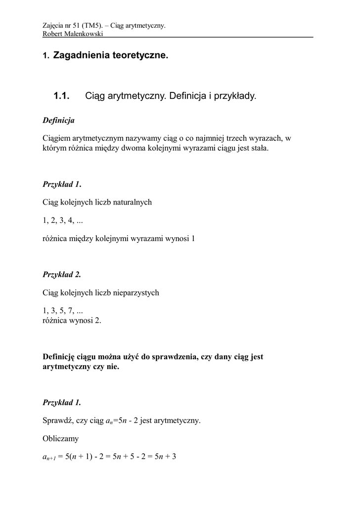 Zajęcia nr 51 (TM5). – Ciąg arytmetyczny. Robert Malenkowski 1. Zagadnienia teoretyczne. 1.1. Ciąg arytmetyczny. Definicja i przykłady. Definicja Ciągiem arytmetycznym nazywamy ciąg o co najmniej trzech wyrazach, w którym różnica między dwoma kolejnymi wyrazami ciągu jest stała. Przykład 1. Ciąg kolejnych liczb naturalnych 1, 2, 3, 4, ... różnica między kolejnymi wyrazami wynosi 1 Przykład 2. Ciąg kolejnych liczb nieparzystych 1, 3, 5, 7, ... różnica wynosi 2. Definicję ciągu można użyć do sprawdzenia, czy dany ciąg jest arytmetyczny czy nie. Przykład 1. Sprawdź, czy ciąg an=5n - 2 jest arytmetyczny. Obliczamy an+1 = 5(n + 1) - 2 = 5n + 5 - 2 = 5n + 3 Zajęcia nr 51 (TM5). – Ciąg arytmetyczny. Robert Malenkowski Teraz liczymy różnicę r = an+1 - a n = 5n + 3 - (5n - 2) = 5n + 3 - 5n + 2 = 5 Widzimy, że r = 5 nie zależy od wartości indeksu n. Jest stałą liczbą 5, więc nasz ciąg (an) jest ciągiem arytmetycznym. Przykład 2. Sprawdź, czy ciąg an = n2 jest arytmetyczny. an+1 = (n + 1)2 = n2 + 2n + 1 Sprawdzamy teraz różnicę r = an+1 - an = (n + 1)2 - n2 = n2 + 2n + 1 - n2 = 2n + 1 I teraz r = 2n+1. Różnica r zależy od wartości n. Dla n = 1 r= 2 ∙ 1 + 1 = 3 dla n = 2 r= 2 ∙ 2 +1 = 5 Zatem różnica nie jest stała dla dowolnych dwóch kolejnych wyrazów ciągu a n = n 2. Czyli ciąg ten nie jest ciągiem arytmetycznym. 1.2. Wzór ogólny ciągu arytmetycznego Łatwo jest zauważyć, że w ciągu arytmetycznym wyrazy ciągu powstają przez dodawanie różnicy r do poprzedniego wyrazu. Zatem a1 = a 1 a 2 = a 1+ r a3 = a2+ r = a1+ r + r = a1 + 2r a4 = a3+ r = a1 + 2r + r = a1 + 3r Zajęcia nr 51 (TM5). – Ciąg arytmetyczny. Robert Malenkowski aby dostać czwarty wyraz dodajemy 3r, czyli o jedną różnicę mniej niż numer wyrazu. Zatem ogólnie an = a1 + (n - 1)r. Aby uzyskać wyraz an musimy do wyrazu a1 dodać n - 1 różnic r. Otrzymujemy w ten sposób wzór ogólny ciągu arytmetycznego an = a1 + (n - 1)r Widzimy, że aby obliczyć dowolny wyraz potrzebuję znać tylko dwie wielkości: a1 i r. Oznacza to tylko dwie zmienne i w konkretnych zadaniach będzie oznaczało, że potrzebujemy ułożyć dwa równania. Zajęcia nr 51 (TM5). – Ciąg arytmetyczny. Robert Malenkowski Zadania do samodzielnego rozwiązania: 1. Jakie liczby należy wstawić między 5 i 17, aby wraz z danymi liczbami tworzyły ciąg arytmetyczny? a. b. c. d. 3i4 10 i 13 9 i 13 11 i13 2. Liczby 2,6,10,14 są kolejnymi początkowymi wyrazami ciągu arytmetycznego a n . Wyrazem tego ciągu nie jest liczba: a. b. c. d. 90 150 160 170 3. Ciągiem arytmetycznym an jest ciąg, którego kolejnymi wyrazami są liczby: 1 a. 3,1,2 5 b. log 2 4, log 2 2 ,8 c. 3,6,12 d. log 5 5,5,8 4. Ciąg arytmetyczny ciągu jest równa: 3 a. 2 b. 2 c. 3 d. 4 3 an jest określony wzorem an 4n 1 . Różnica r tego 3 Zajęcia nr 51 (TM5). – Ciąg arytmetyczny. Robert Malenkowski 5. Piłka, odbijając się od ziemi osiągała za każdym razem wysokość o 12 cm mniejszą od poprzedniej. Jak wysoko wzniosła się piłka po drugim uderzeniu, jeśli po czwartym odbiła się na wysokość 27 cm? a. 15 cm b. 39 cm c. 73 cm d. 51 cm