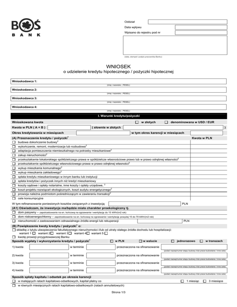 Oddział Data wpływu Wpisano do rejestru pod nr (data, stempel i podpis pracownika Banku) WNIOSEK o udzielenie kredytu hipotecznego / pożyczki hipotecznej Wnioskodawca 1: (imię i nazwisko , PESEL) Wnioskodawca 2: (imię i nazwisko , PESEL) Wnioskodawca 3: (imię i nazwisko , PESEL) Wnioskodawca 4: (imię i nazwisko , PESEL) I. Warunki kredytu/pożyczki Wnioskowana kwota w złotych Kwota w PLN ( A + B ) denominowana w USD / EUR ( słownie w złotych Okres kredytowania w miesiącach (A) Przeznaczenie kredytu / pożyczki ) w tym okres karencji w miesiącach 1 Kwota w PLN 2 budowa dokończenie budowy wykończenie, remont, modernizacja lub rozbudowa2 adaptacja pomieszczenia niemieszkalnego na potrzeby mieszkaniowe2 zakup nieruchomości2 przekształcenie lokatorskiego spółdzielczego prawa w spółdzielcze własnościowe prawo lub w prawo odrębnej własności2 przekształcenie spółdzielczego własnościowego prawa w prawo odrębnej własności2 wykup mieszkania komunalnego2 wykup mieszkania zakładowego2 spłata kredytu mieszkaniowego w innym banku lub instytucji spłata kredytów i pożyczek innych niż kredyt mieszkaniowy koszty sądowe i opłaty notarialne, inne koszty i opłaty urzędowe, 2 koszt projektu rozwiązań ekologicznych, koszt audytu energetycznego2 prowizja należna podmiotom pośredniczącym w zawieraniu transakcji2 cele konsumpcyjne W tym refinansowanie poniesionych kosztów związanych z inwestycją PLN (A1) Oświadczam, że inwestycja ma/będzie miała charakter proekologiczny tj. dom pasywny – zapotrzebowanie na en. końcową na ogrzewanie i wentylację do 15 kWh/(m2 rok) dom niskoenergochłonny – zapotrzebowanie na en. końcową na ogrzewanie i wentylację powyżej 15 do 70 kWh/(m2 rok) nieruchomość z zastosowaniem odnawialnego źródła energii lub rekuperacji PLN 1 (B) Powiększenie kwoty kredytu / pożyczki o: składkę z tytułu ubezpieczenia fakultatywnego nieruchomości i/lub od utraty stałego źródła dochodu lub hospitalizacji: wariant 1 wariant 2 wariant 3 wariant 4 wariant 5 kwotę prowizji przygotowawczej Banku Sposób wypłaty i wykorzystania kredytu / pożyczki 1 w PLN w walucie 1) kwota w terminie przeznaczona na sfinansowanie 2) kwota w terminie przeznaczona na sfinansowanie 3) kwota w terminie przeznaczona na sfinansowanie 4) kwota w terminie przeznaczona na sfinansowanie jednorazowo w transzach (podać nazwę/numer etapu budowy i/lub prace budowlane / inne cele) (podać nazwę/numer etapu budowy i/lub prace budowlane / inne cele) (podać nazwę/numer etapu budowy i/lub prace budowlane / inne cele) (podać nazwę/numer etapu budowy i/lub prace budowlane / inne cele) Sposób spłaty kapitału i odsetek po okresie karencji w malejących ratach kapitałowo-odsetkowych, kapitał płatny co 1 miesiąc w równych miesięcznych ratach kapitałowo-odsetkowych (ratach annuitetowych) Strona 1/3 3 miesiące Spłata rat w dniu miesiąca dniu miesiąca ustalonym przez Bank w złotych w walucie kredytu / pożyczki4 gotówka/przelew z r-ku w BOŚ S.A. o NRB: 2 II. Charakterystyka realizowanej przez Wnioskodawcę inwestycji / informacja o przedmiocie kredytowania 1. Przedmiot kredytowania Typ nieruchomości Miejscowość Kod pocztowy Ulica Nr domu Nr lokalu/garażu/miejsca postojowego Działka nr /Udział w działce nr Powierzchnia użytkowa Księga wieczysta KW nr KW prowadzona w Prawo do nieruchomości Wartość rynkowa Planowany termin zakończenia inwestycji Planowany termin przeniesienia własności 2. Całkowite koszty inwestycji/ cena przedmiotu kredytowania 3. Udział środków własnych PLN PLN w tym wniesione dotychczas środki własne (pomniejszone o koszty refinansowane kredytem) środki własne przewidywane na realizację inwestycji: premii gwarancyjnej 1 PLN (w tym środki zgromadzone na książeczce mieszkaniowej wraz z uwzględnieniem PLN) PLN, do dnia 2 PLN, do dnia 3 PLN, do dnia III. Informacja o nieruchomości stanowiącej docelowy przedmiot zabezpieczenia kredytu 1. Przedmiot zabezpieczenia przedmiot kredytowania inny niż przedmiot kredytowania (poniższą część wypełnić tylko gdy inny niż przedmiot kredytowania) Typ nieruchomości Miejscowość Kod pocztowy Ulica Nr domu Nr lokalu/garażu/miejsca postojowego Działka nr / Udział w działce nr Powierzchnia użytkowa Księga wieczysta KW nr KW prowadzona w Prawo do nieruchomości Wartość rynkowa IV. Proponowane zabezpieczenie docelowe weksel własny in blanco cesja z praw umowy ubezpieczenia na życie hipoteka na nieruchomości wskazanej w pkt. III cesja z praw umowy ubezpieczenia nieruchomości, na której ustanowiona jest hipoteka V. Proponowane zabezpieczenia pomostowe weksel własny in blanco środki pieniężne ubezpieczenie kredytu/pożyczki1 ubezpieczenie niskiego wkładu własnego2 Strona 2/3 1 VI. Oświadczam / Oświadczamy , że 1 1) proponowane w pkt. IV i V zabezpieczenie jest/nie jest obciążone prawami osób trzecich, 2) przeciwko mnie / nam1 było / nie było1 w okresie ostatnich 4 lat prowadzone postępowanie sądowe lub postępowanie egzekucyjne w administracji. 1 VII. Oświadczam / Oświadczamy , że Posiadam / Posiadamy1 pełną zdolność do czynności prawnych i potwierdzam / potwierdzamy1 prawdziwość danych zawartych we wniosku. 1 VIII. Oświadczam / Oświadczamy , że została mi / nam1 przedstawiona przez Bank Ochrony Środowiska S.A. informacja o kosztach obsługi wnioskowanego/ej kredytu hipotecznego / pożyczki hipotecznej1, przy: - aktualnym poziomie stopy procentowej, od której zależy jej oprocentowanie, - wzroście stopy procentowej, od której zależy jej oprocentowanie o 400pb., - wzroście stopy procentowej, od której zależy jej oprocentowanie w skali odpowiadającej różnicy między maksymalnym i minimalnym poziomem stopy procentowej w ciągu ostatnich 12 miesięcy. 4 1 IX. Oświadczam / Oświadczamy ,że 1 została mi / nam przedstawiona przez Bank Ochrony Środowiska S.A. informacja o kosztach obsługi wnioskowanego/ej kredytu hipotec