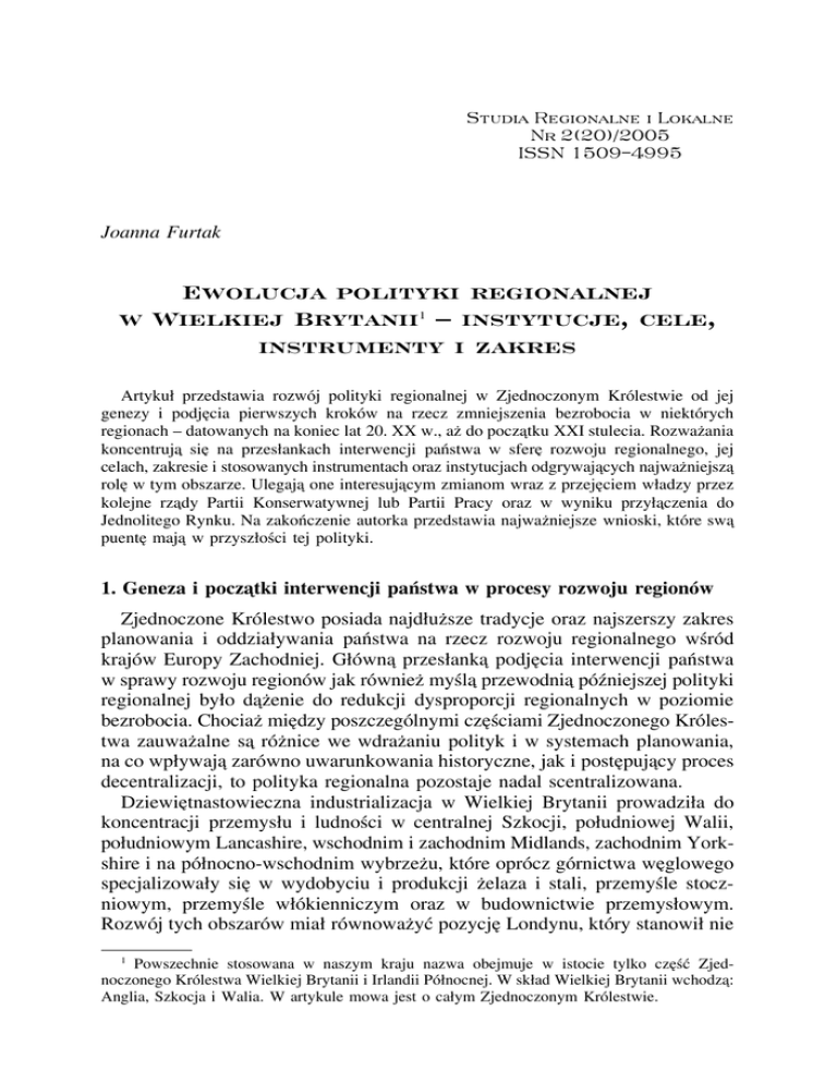 Studia Regionalne i Lokalne Nr 2(20)/2005 ISSN 1509–4995 Joanna Furtak Ewolucja polityki regionalnej w Wielkiej Brytanii – instytucje, cele, instrumenty i zakres 1 Artykuł przedstawia rozwój polityki regionalnej w Zjednoczonym Królestwie od jej genezy i podjeþcia pierwszych kroków na rzecz zmniejszenia bezrobocia w niektórych regionach – datowanych na koniec lat 20. XX w., azú do poczaþtku XXI stulecia. Rozwazú ania koncentrujaþ sieþ na przesłankach interwencji państwa w sfereþ rozwoju regionalnego, jej celach, zakresie i stosowanych instrumentach oraz instytucjach odgrywajaþcych najwazú niejszaþ roleþ w tym obszarze. Ulegajaþ one interesujaþcym zmianom wraz z przejeþciem władzy przez kolejne rzaþdy Partii Konserwatywnej lub Partii Pracy oraz w wyniku przyłaþczenia do Jednolitego Rynku. Na zakończenie autorka przedstawia najwazú niejsze wnioski, które swaþ puenteþ majaþ w przyszłości tej polityki. 1. Geneza i poczaþtki interwencji państwa w procesy rozwoju regionów Zjednoczone Królestwo posiada najdłuzú sze tradycje oraz najszerszy zakres planowania i oddziaływania państwa na rzecz rozwoju regionalnego wśród krajów Europy Zachodniej. Głównaþ przesłankaþ podjeþcia interwencji państwa w sprawy rozwoju regionów jak równiezú myślaþ przewodniaþ późniejszej polityki regionalnej było daþzú enie do redukcji dysproporcji regionalnych w poziomie bezrobocia. Chociazú mieþdzy poszczególnymi czeþ ściami Zjednoczonego Królestwa zauwazú alne saþ rózú nice we wdrazú aniu polityk i w systemach planowania, na co wpływajaþ zarówno uwarunkowania historyczne, jak i posteþpujaþcy proces decentralizacji, to polityka regionalna pozostaje nadal scentralizowana. Dziewieþtnastowieczna industrializacja w Wielkiej Brytanii prowadziła do koncentracji przemysłu i ludności w centralnej Szkocji, południowej Walii, południowym Lancashire, wschodnim i zachodnim Midlands, zachodnim Yorkshire i na północno-wschodnim wybrzezú u, które oprócz górnictwa weþglowego specjalizowały sieþ w wydobyciu i produkcji zú elaza i stali, przemyśle stoczniowym, przemyśle włókienniczym oraz w budownictwie przemysłowym. Rozwój tych obszarów miał równowazú yć pozycjeþ Londynu, który stanowił nie 1 Powszechnie stosowana w naszym kraju nazwa obejmuje w istocie tylko czeþść Zjednoczonego Królestwa Wielkiej Brytanii i Irlandii Północnej. W skład Wielkiej Brytanii wchodzaþ: Anglia, Szkocja i Walia. W artykule mowa jest o całym Zjednoczonym Królestwie. 24 JOANNA FURTAK tylko centrum zú ycia politycznego, lecz takzú e i gospodarczego. Pełniaþc specyficzne funkcje jako stolica i beþdaþc najwieþkszym portem w kraju, stał sieþ dominujaþcym centrum przemysłowym i handlowym. Jednak bliskość i łatwość pozyskania surowców naturalnych zaczeþły usteþpować pola dosteþpności do chłonnych lub wyspecjalizowanych rynków zbytu oraz do dostawców dóbr i usług niezbeþdnych do coraz bardziej skomplikowanej produkcji. Dosteþpność ta jest zdeterminowana przez infrastruktureþ transportowaþ i nowe środki transportu, która to dziedzina zaczynała sieþ wówczas dynamicznie rozwijać. Do wazú nych czynników, decydujaþcych o atrakcyjności regionu i lokalizacji dwudziestowiecznej produkcji przemysłowej, nalezú y zaliczyć równiezú istnienie odpowiednio wykwalifikowanych pracowników, rózú norodność naturalnych udogodnień oraz rosnaþcaþ roleþ innowacji i przedsieþbiorczości. Zarówno udogodnienia transportowe, jak i inne z wyzú ej wymienionych, były skoncentrowane w południowej Anglii, a zwłaszcza na obszarze Wielkiego Londynu i Zachodniego Midlands. Przyczyniły sieþ one do lokalizacji na tych obszarach nowoczesnych wówczas przemysłów (m.in. chemicznego, samochodowego, lotniczego czy inzú ynierii elektrycznej). Dzieþki temu istniały tam lepsze mozú liwości zatrudnienia, co z kolei wpływało na rozmieszczenie ludności i jej migracje z obszarów zdominowanych przez tradycyjny przemysł do Londynu i Midlands (Manners i in. 1972, s. 5 i nast.). Panujaþca w XIX i na poczaþtku XX w. doktryna nieinterwencji państwa w procesy gospodarcze opierała sieþ na załozú eniu, zú e wzrost gospodarczy zostaje niejako automatycznie transmitowany poprzez gospodarkeþ zarówno w ujeþciu sektorowym, jak i przestrzennym. Zgodnie z tym podejściem, rozwojowe przemysły przyciaþgajaþ pracowników, którzy w poszukiwaniu lepszych warunków zatrudnienia migrujaþ z obszarów schyłkowych. Jednak w praktyce w niektórych regionach nasteþpowała koncentracja niekorzystnych zjawisk. Pogłeþbiało sieþ w szczególności bezrobocie i zrózú nicowanie w przestrzennym rozwoju regionów. Przełomowym momentem dla podjeþcia interwencji państwa w sfereþ gospodarki stał sieþ Wielki Kryzys. Narodziny polityki regionalnej w Wielkiej Brytanii wiaþzú aþ sieþ z działaniami państwa na rzecz ograniczania wysokiego bezrobocia, które pod koniec lat 20. XX w. dotkneþło szczególnie te regiony, gdzie koncentrował sieþ tradycyjny przemysł i gdzie nastaþpiło załamanie dotychczas wiodaþcych w eksporcie branzú . Ministerstwo Pracy utworzyło w 1928 r. Biuro ds. Przemieszczania Pracowników Przemysłowych (Industrial Transference Board), którego celem było ułatwienie, głównie przez wsparcie finansowe, przenoszenia pracowników (w szczególności górników) z terenów, gdzie nie mogli znaleźć zatrudnienia 2. Jednak poczaþtkowe sukcesy tej instytucji, która udzielała wsparcia około 20 tys. pracowników rocznie (co oznaczało pomoc dla 200 tys. ludzi do 1938 r.), wobec ogromnej skali problemu, dotykajaþcego w 1933 r. około 3 mln Niektórzy autorzy uwazú ajaþ ten fakt i rok 1928 za poczaþtek polityki regionalnej w Wielkiej Brytanii. Por. Armstrong, Taylor 2000, s. 214. 2 EWOLUCJA POLITYKI REGIONALNEJ W WIELKIEJ BRYTANII... 25 ludzi, nie wpłyneþły zasadniczo na zmniejszenie regionalnych dys