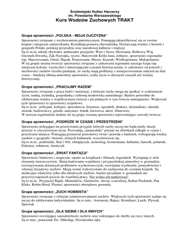 Śródmiejski Hufiec Harcerzy im. Powstania Warszawskiego Kurs Wodzów Zuchowych TRAKT Grupa sprawności „POLSKA - MOJA OJCZYZNA” Sprawności związane z wychowaniem patriotycznym. Pomagają identyfikować się ze swoim krajem i miejscem zamieszkania. Kształtują postawę obywatelską. Dostarczają wiedzy o historii i geografii Polski, polskiej przyrodzie oraz narodowej kulturze i tradycji. Są to m.in. młody obywatel, ambasador przyjaźni, Wars i Sawa, Słowianin, Bolkowy Woj, Giermek-Dworka, Żak-Nawojka, rycerz, Harcownik Króla Jana, żołnierz, sprawności regionalne (np. Mazowszanin, Góral, Ślązak, Pomorzanin, Mazur, Kaszub, Wielkopolanin, Małopolanin). W tej grupie można tworzyć sprawności związane z ciekawymi regionami naszego kraju (np. miejscem kolonii, wycieczki) i interesującymi czasami historycznymi, w zależności od potrzeb i możliwości zuchów (trzeba pamiętać, że zuchy mają problemy z umiejscowieniem zdarzeń na linii czasu – bardziej chłoną atmosferę sprawności, realia życia w dawnych czasach niż wiedzę historyczną). Grupa sprawności „PRACUJMY RAZEM” Sprawności związane z pracą ludzi i instytucji, z którymi zuchy mogą się spotkać w codziennym życiu, nauką, techniką, gospodarką i ochroną środowiska naturalnego. Bardzo potrzebne do zdobywania wiedzy o współczesnym świecie i przydatnych w tym świecie umiejętności. Większość tych sprawności to sprawności zespołowe. Są to m.in.: policjant, kolejarz, sprzedawca, listonosz, ogrodnik, drukarz, dziennikarz, chemik, strażak, budowniczy, górnik, marynarz, lotnik, kierowca, aktor, filmowiec. W nowym regulaminie dodane do tej grupy zostaną sprawności reprezentujące zawody twórcze. Grupa sprawności „PODRÓŻE W CZASIE I PRZESTRZENI” Sprawności polegające na przeżywaniu przygód, których zuchy raczej nie będą miały okazji przeżyć w rzeczywistym życiu. Pozwalają „namacalnie” poznać na zbiórkach odległe w czasie i przestrzeni miejsca. Pomagają poznawać prawdziwy świat i prawdę o ludziach, wzbogacają wiedzę zuchów o geografii i historii, różnych kulturach, wszechświecie itp. Są to m.in.: podróżnik, Staś i Nel, olimpijczyk, archeolog, kosmonauta, Indianin, Janosik, polarnik, Eskimos, robinson, Ateńczyk. Grupa sprawności „ŚWIAT FANTAZJI” Sprawności baśniowe i magiczne, oparte na książkach i filmach, legendach. Występują w nich elementy nierzeczywiste. Służą budowaniu wspólnoty i przyjacielskiej atmosfery w gromadzie, rozwiązywaniu doraźnych problemów wychowawczych, rozwijaniu wyobraźni, pomysłowości i własnej inicjatywy zuchów. Mogą zostać wykorzystane do zachęcenia do czytania książek. Są atrakcyjne właściwie tylko dla młodszych zuchów, bardzo przydatne w gromadach nie przyzwyczajonych jeszcze do wspólnej pracy. Nie wolno ich nadużywać! Są to m.in.: Przyjaciel Bajek, Muminków, Gumisiów, skrzat, czarodziej, Kubuś Puchatek, Pan Kleks, Robin Hood, Plastuś, sprawności obrzędowe gromady. Grupa sprawności „ZUCH HOBBISTA” Sprawności związane z różnymi zainteresowaniami zuchów. Większość tych sprawności nadaje się raczej do zdobywania indywidualnie. Są to min.: Astronom, Bajarz, Kronikarz, Łazik, Pływak, Śpiewak Grupa sprawności „DLA SIEBIE I DLA INNYCH” Sprawności rozwijające samodzielność zuchów oraz wdrażające do służby na rzecz innych. Są to min.: pomocnik Św. Mikołaja, Niwidzialna ręka
