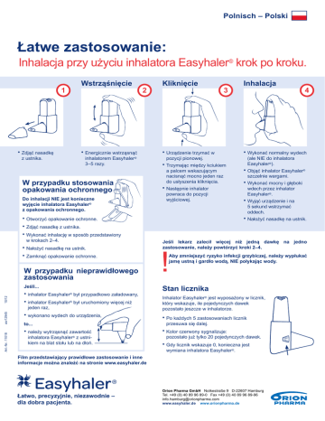 Polnisch – Polski Łatwe zastosowanie: Inhalacja przy użyciu inhalatora Easyhaler® krok po kroku. 1 • Zdjąć nasadkę z ustnika. Wstrząśnięcie 2 • Energicznie wstrząsnąć inhalatorem Easyhaler® 3–5 razy. W przypadku stosowania opakowania ochronnego Do inhalacji NIE jest konieczne wyjęcie inhalatora Easyhaler® z opakowania ochronnego. Kliknięcie 3 • Urządzenie trzymać w pozycji pionowej. • Trzymając między kciukiem a palcem wskazującym nacisnąć mocno jeden raz do usłyszenia kliknięcia. • Następnie inhalator powraca do pozycji wyjściowej. w krokach 2–4. W przypadku nieprawidłowego zastosowania 10/12 Jeśli... • inhalator Easyhaler® był przypadkowo załadowany, • inhalator Easyhaler® był uruchomiony więcej niż Art.-Nr.: 11018 acr12945 jeden raz, • wykonano wydech do urządzenia, to... • należy wytrząsnąć zawartość inhalatora Easyhaler® z ustnikiem na blat stołu lub na dłoń. • Wykonać normalny wydech (ale NIE do inhalatora Easyhaler®). • Objąć inhalator Easyhaler® szczelnie wargami. • Wykonać mocny i głęboki wdech przez inhalator Easyhaler®. • Wyjąć urządzenie i na • Nałożyć nasadkę na ustnik. Jeśli lekarz zalecił więcej niż jedną dawkę na jedno zastosowanie, należy powtórzyć kroki 2–4. ! Aby zmniejszyć ryzyko infekcji grzybiczej, należy wypłukać jamę ustną i gardło wodą, NIE połykając wody. Stan licznika Inhalator Easyhaler® jest wyposażony w licznik, który wskazuje, ile pojedynczych dawek pozostało jeszcze w inhalatorze. • Po każdych 5 zastosowaniach licznik przesuwa się dalej. • Kolor czerwony sygnalizuje: pozostało już tylko 20 pojedynczych dawek. • Gdy licznik wskazuje 0, konieczna jest wymiana inhalatora Easyhaler®. Film przedstawiający prawidłowe zastosowanie i inne informacje można znaleźć na stronie www.easyhaler.de Łatwo, precyzyjnie, niezawodnie– – Einfach, präzise, zuverlässig dla dobra pacjenta. dem Patienten zuliebe. 4 5 sekund wstrzymać oddech. • Otworzyć opakowanie ochronne. • Zdjąć nasadkę z ustnika. • Wykonać inhalację w sposób przedstawiony • Nałożyć nasadkę na ustnik. • Zamknąć opakowanie ochronne. Inhalacja Orion Pharma GmbH Notkestraße 9 D-22607 Hamburg Tel. +49 (0) 40 89 96 89-0 Fax +49 (0) 40 89 96 89-96 [email protected] www.easyhaler.de www.orionpharma.de