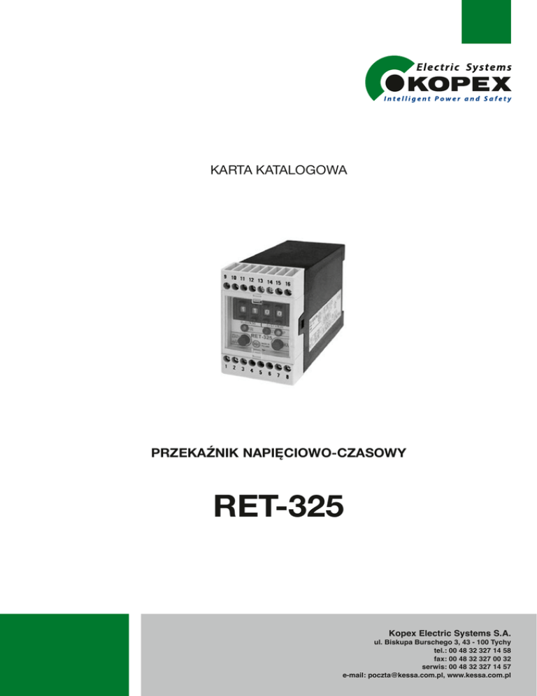 KARTA KATALOGOWA PRZEKAŹNIK NAPIĘCIOWO-CZASOWY RET-325 Kopex Electric Systems S.A. ul. Biskupa Burschego 3, 43 - 100 Tychy tel.: 00 48 32 327 14 58 fax: 00 48 32 327 00 32 serwis: 00 48 32 327 14 57 e-mail: [email protected], www.kessa.com.pl KARTA KATALOGOWARET-325 RET-325 Przekaźnik napięciowo - czasowy RET- 325 ZASTOSOWANIE Przekaźniki napięciowo-czasowe, typu RET-325, przeznaczone są głównie do stosowania w układach automatyki przemysłowej oraz elektroenergetycznej automatyki zabezpieczeniowej jako napieciowo-czasowe elementy kontrolujące wartość skuteczną napięcia sinusoidalnie przemiennego o częstotliwości 50 Hz lub wartość napięcia stałego. Ich podstawowe właściwości eksploatacyjne to : - szeroki zakres nastawczy napięcia rozruchowego DC/AC - zakres nastawczy przekaźnika czasowego: 0 ...9,9 s - klasa dokładności przekaźnika napięciowego: 1,5 - klas dokładności przekaźnika czasowego: 2,5 - dwa tryby pracy: praca podnapięciowa i nadnapięciowa - mały pobór mocy: < 4 VA/W - szeroki zakres pomocniczego napięcia zasilającego: Up = (88 ... 253) V DC/AC - obudowa typu KO do montażu na szynie TS 35. Schemat połączeń zewnętrznych przekaźnika RET-325 przedstawiono na rys. 1. BUDOWA Przekaźnik napięciowo-czasowy, typu RET-325, jest urządzeniem statycznym wykonanym w technice analogowej. Jego układ elektroniczny może być zasilany ze źródła napięcia pomocniczego lub pomiarowego. W schemacie blokowym tego przekaźnika można wyróżnić: układ wejściowy w postaci rezystancyjnego dzielnika pomiarowego, prostownik liniowy, komparator amplitudy, układ nastawczy napięcia rozruchowego, układ czasowy wraz z nastawnikiem czasu zadziałania, układ wykonawczy, układ sygnalizacji i kasowania oraz układ zasilający. Na płycie czołowej przekaźnika umieszczone są: nastawnik kołowy napięcia rozruchowego, przełącznik rodzaju pracy (praca nadnapięciowa lub podnapięciowa), nastawnik kołowy przekaźnika czasowego, diody LED sygnalizujące załączenie napięcia zasilającego (zielona), stan pobudzenia (żółta) i stan zadziałania (czerwona) urządzenia. Elementy konstrukcyjne przekaźnika umieszczone zostały w obudowie typu KO, przystosowanej do montażu na szynie typu TS 35, wyposażonej w śrubowe zaciski umożliwiające przyłączenie przewodów o przekroju do 2,5 mm2. Szkic wymiarowy urządzenia przedstawiono na rys.2. Przekaźnik wyposażono w dwa wejścia pomiarowe (wejście AC - zaciski 1-2 lub wejście DC - zaciski 1-3). Napięcie kontrolowane AC lub DC, poprzez układ wejściowy i prostownik liniowy, doprowadzane jest do komparatora amplitudy. Do drugiego wejścia tego komparatora doprowadzane jest napięcie odniesienia formowane w układzie nastawczym napięcia rozruchowego. W trybie pracy nadnapięciowej, gdy wartość napięcia kontrolowanego jest większa od wartości nastawczej napięcia rozruchowego, następuje pobudzenie układu wykonawczego i układu czasowego. Po nastawionym czasie zadziałania następuje zadziałanie układu wykonawczego. W trybie pracy podnapięciowej, gdy wartość skuteczna napięcia kontrolowanego jest mniejsza od wartości nastawczej napięcia rozruchowego, następuje pobudzenie i po nastawionym czasie - zadziałanie przekaźnika. Pobudzenie i zadziałanie układu wykonawczego urządzenia jest sygnalizowane optycznie z podtrzymaniem. Stan pobudzenia i zadziałania przekaźników wyjściowych układu wykonawczego RET-325 nie jest podtrzymywany po zaniku przyczyny zadziałania. Po włączeniu pomocniczego napięcia zasilającego Up (zaciski 7-8, biegunowość dowolna) zestyki układu wykonawczego pracują w następujący sposób (tabela 1: O - otwarte, Z – zamknięte). Tabela 1. stan zestyków przekaźników wykonawczych RET-325 stan przekaźnika brak pobudzenia pobudzenie zadziałanie praca nadnapięciowa praca podnapięciowa L9-L10 L10-L11 L13-L14 L14-L15 L9-L10 L10-L11 L13-L14 L14-L15 O Z Z Z O O O O Z Z Z O Z O O O Z Z O O Z Z Z O -22 EE 426067 KARTA KATALOGOWARET-325 RET-325 DANE TECHNICZNE Tabela 2 Znamionowe napięcie pomiarowe Un (AC/DC) Częstotliwość znamionowa dla wejścia AC Impedancja wejściowa obwodów pomiarowych Zakres nastawczy napięcia rozruchowego przy zasilaniu napięciem pomocniczym 48 V lub 100 V , lub 110 V, lub 220-230 V, lub 400 V 47,5 ... 52,5 Hz > 300 kΩ (1-2, wejście AC; 1-3, wejście DC) U = (1 ... 99)V co 1V dla RET-325-48 U = (2 ... 198)V co 2V dla RET-325-100 U = (3 ... 297)V co 3V dla RET-325-110 U = (4 ... 396)V co 4V dla RET-325-220 U = (5 ... 495)V co 5V dla RET-325-380 (88 ... Urmax*) V ze skokiem jak wyżej Zakres nastawczy napięcia rozruchowego przy zasilaniu napięciem pomiarowym Pomocnicze napięcie zasilające Up Znamionowy pobór mocy w obwodach pomiarowych Pobór mocy ze źródła napięcia pomocniczego Klasa dokładności przekaźnika napięciowego Zakres działania przekaźnika w klasie Współczynnik powrotu Czas własny zadziałania Czas powrotu Zakres nastawczy przekaźnika czasowego (funkcja układu czasowego nie jest realizowana po zaniku napięcia Up) Klasa dokładności przekaźnika czasowego Wytrzymałość elektryczna izolacji Przekaźniki wykonawcze: - bezzwłoczny - zwłoczny zdolność łączenia zestyków: - obciążalność prądowa trwała - zamykanie obwodu przy obciążeniu rezystancyjnym - otwieranie obwodu przy obciążeniu ind. (L/R = 40 ms) Normalne środowiskowe warunki pracy: - temperatura otoczenia podczas pracy - wilgotność względna w temp. 20 oC Stopień ochrony obudowy Wymiary Masa 88 ... 253 V DC/AC (zaciski 7-8) < 0,5 VA/W < 4 VA/W 1,5 (0,1 ... 1,0)•Urmax 0,94 < Kp < 0,98 praca nadnapięciowa 1,02 < Kp < 1,06 praca podnapięciowa < 100 ms < 100 ms t = ( 0 ..... 9,9 ) s co 0,1 s 2,5 2kV/50Hz/1min. 1 przełączny (RM96) – (zaciski 9-10-11) 1 przełączny (RM96) – (zaciski 13-14-15) 8A 5 A/250 V 0,12 A/250 V DC 268...313K ( -5 °C ... +40 °C) < 80 % IP40 (zaciski IP20) 45x75x120 mm. ok. 0,35 kg Urmax* - maksy