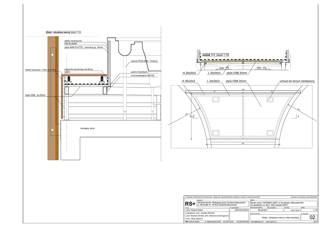 Detal - obudowa wanny skala 1:10 płytka ceramiczna klej do płytek płyta WIM PLATTE - nacinana gr. 30mm widok 1-1, skala 1:10 wanna POOLSPA - Victoria deska tarasowa - iroko gr.21mm kątownik aluminiowy 9x18mm epdm min. 1% min. 1% profil Z 50x50x45 rura prostokątna 50x100 rk 20x20x2 L 30x30x3 płyta OSB 25mm rk 20x20x2 L 30x30x3 płyta OSB 25mm uchwyt do skrzyń nierdzewny 1495 75 75 płyta OSB - gr.25mm 13 0 595 0 13 1 1 istniejący strop 955 WYMIARY SPRAWDZIĆ NA BUDOWIE. WSZELKIE NIEZGODNOŚCI SKONSULTOWAĆ Z PROJEKTANTEM. RS+ Ośrodek Sportu i Rekreacji gminy Grodzisk Mazowiecki ul. Montwiłła 41, 05-825 Grodzisk Mazowiecki nr uprawnień: autor: arch. Robert Skitek 60/03/SLOKK/II współpraca: arch. Jarosław Zieliński, stud. Wojciech Zientek, arch. Martyna Lenart-Zygmunt arch. Jakub Zygmunt RS+ Robert Skitek PRAWA AUTORSKIE ZASTRZEŻONE obiekt: inwestor: ul. Nałkowskiej 4a/49 43-100 Tychy Basen kryty "WODNIK 2000" w Grodzisku Mazowieckim na dzialkach nr 55/2, 58/2 (obréb 0057) data opracowania: faza projektu: 04.2016 branża: skala: arch.-bud. temat rysunku: 1:10 nr rysunku: Detal - obudowa wanny i wlaz rewizijny +48 605 636 683 [email protected] www.rsplus.pl 02. 2016