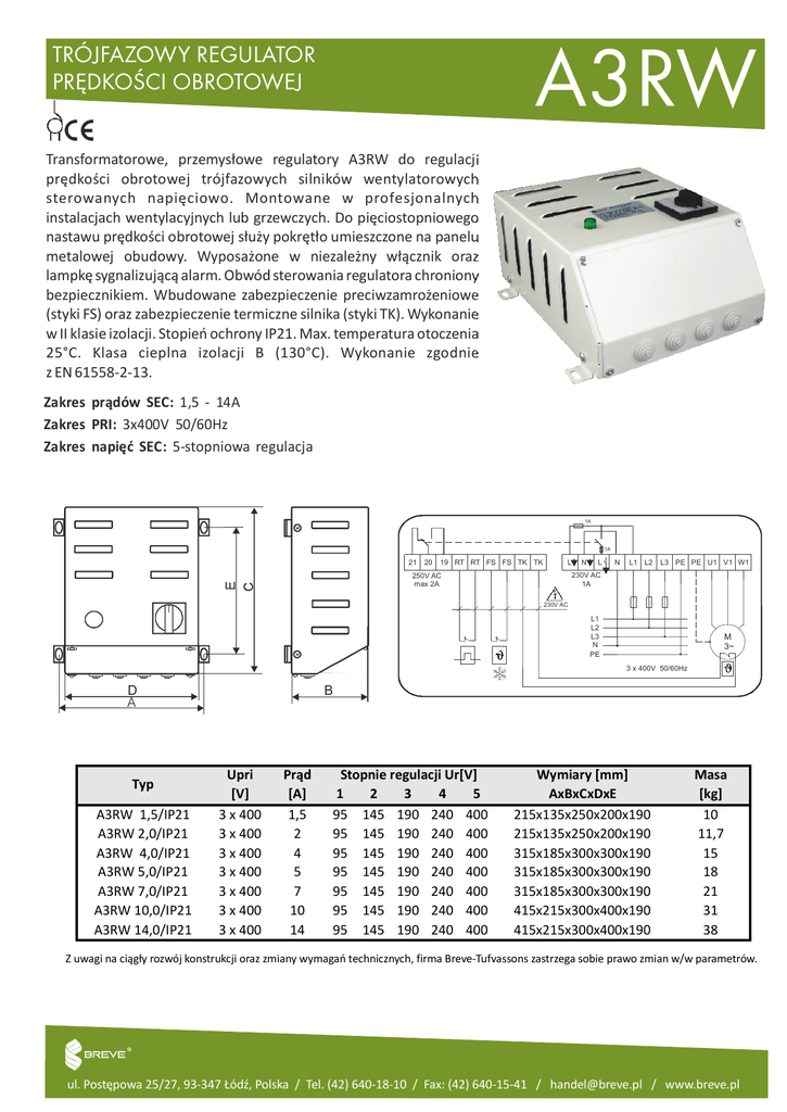 A3RW TRÓJFAZOWY REGULATOR PRĘDKOŚCI OBROTOWEJ Transformatorowe, przemysłowe regulatory A3RW do regulacji prędkości obrotowej trójfazowych silników wentylatorowych sterowanych napięciowo. Montowane w profesjonalnych instalacjach wentylacyjnych lub grzewczych. Do pięciostopniowego nastawu prędkości obrotowej służy pokrętło umieszczone na panelu metalowej obudowy. Wyposażone w niezależny włącznik oraz lampkę sygnalizującą alarm. Obwód sterowania regulatora chroniony bezpiecznikiem. Wbudowane zabezpieczenie preciwzamrożeniowe (styki FS) oraz zabezpieczenie termiczne silnika (styki TK). Wykonanie w II klasie izolacji. Stopień ochrony IP21. Max. temperatura otoczenia 25°C. Klasa cieplna izolacji B (130°C). Wykonanie zgodnie z EN 61558-2-13. Zakres prądów SEC: 1,5 - 14A Zakres PRI: 3x400V 50/60Hz Zakres napięć SEC: 5-stopniowa regulacja 1A 1A 21 20 19 RT RT FS FS TK TK L N L N L1 L2 L3 PE PE U1 V1 W1 230V AC 1A 250V AC max 2A 230V AC L1 L2 L3 N PE M 3~ 3 x 400V 50/60Hz D A Typ A3RW 1,5/IP21 A3RW 2,0/IP21 A3RW 4,0/IP21 A3RW 5,0/IP21 A3RW 7,0/IP21 A3RW 10,0/IP21 A3RW 14,0/IP21 B Upri [V] 3 x 400 3 x 400 3 x 400 3 x 400 3 x 400 3 x 400 3 x 400 Prąd [A] 1,5 2 4 5 7 10 14 Stopnie regulacji Ur[V] 1 2 3 4 5 95 145 190 240 400 95 145 190 240 400 95 145 190 240 400 95 145 190 240 400 95 145 190 240 400 95 145 190 240 400 95 145 190 240 400 Wymiary [mm] AxBxCxDxE 215x135x250x200x190 215x135x250x200x190 315x185x300x300x190 315x185x300x300x190 315x185x300x300x190 415x215x300x400x190 415x215x300x400x190 Masa [kg] 10 11,7 15 18 21 31 38 Z uwagi na ciągły rozwój konstrukcji oraz zmiany wymagań technicznych, firma Breve-Tufvassons zastrzega sobie prawo zmian w/w parametrów. ul. Postępowa 25/27, 93-347 Łódź, Polska / Tel. (42) 640-18-10 / Fax: (42) 640-15-41 / [email protected] / www.breve.pl