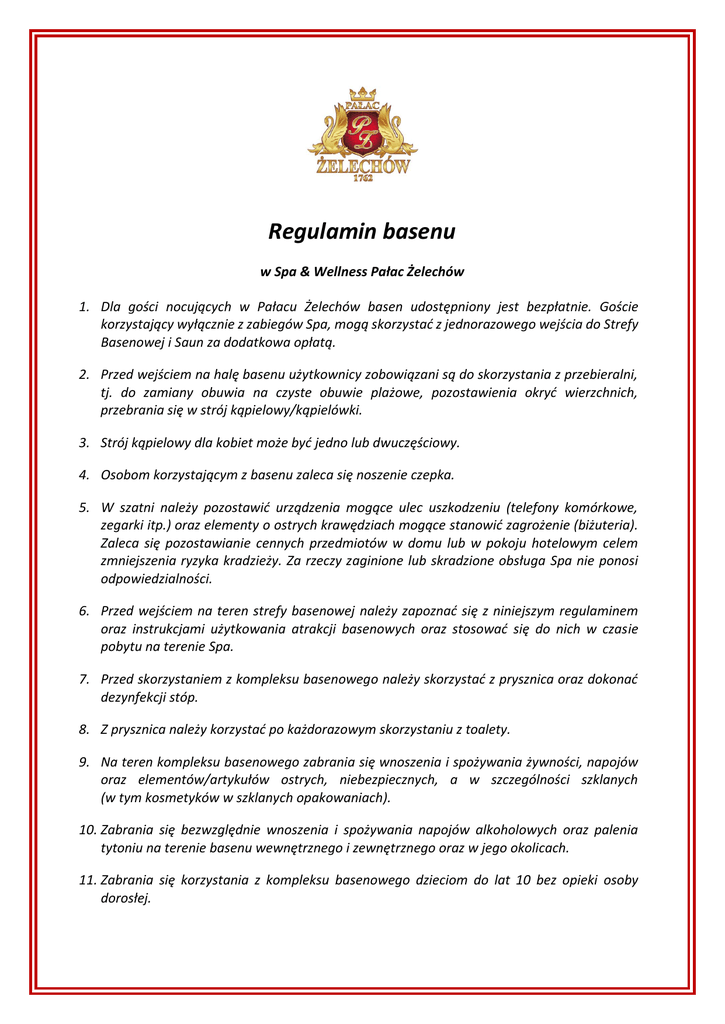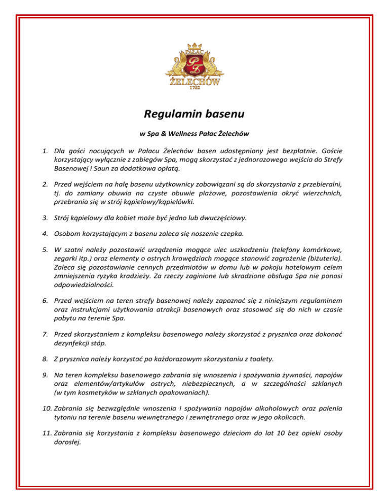 Regulamin basenu w Spa & Wellness Pałac Żelechów 1. Dla gości nocujących w Pałacu Żelechów basen udostępniony jest bezpłatnie. Goście korzystający wyłącznie z zabiegów Spa, mogą skorzystać z jednorazowego wejścia do Strefy Basenowej i Saun za dodatkowa opłatą. 2. Przed wejściem na halę basenu użytkownicy zobowiązani są do skorzystania z przebieralni, tj. do zamiany obuwia na czyste obuwie plażowe, pozostawienia okryć wierzchnich, przebrania się w strój kąpielowy/kąpielówki. 3. Strój kąpielowy dla kobiet może być jedno lub dwuczęściowy. 4. Osobom korzystającym z basenu zaleca się noszenie czepka. 5. W szatni należy pozostawić urządzenia mogące ulec uszkodzeniu (telefony komórkowe, zegarki itp.) oraz elementy o ostrych krawędziach mogące stanowić zagrożenie (biżuteria). Zaleca się pozostawianie cennych przedmiotów w domu lub w pokoju hotelowym celem zmniejszenia ryzyka kradzieży. Za rzeczy zaginione lub skradzione obsługa Spa nie ponosi odpowiedzialności. 6. Przed wejściem na teren strefy basenowej należy zapoznać się z niniejszym regulaminem oraz instrukcjami użytkowania atrakcji basenowych oraz stosować się do nich w czasie pobytu na terenie Spa. 7. Przed skorzystaniem z kompleksu basenowego należy skorzystać z prysznica oraz dokonać dezynfekcji stóp. 8. Z prysznica należy korzystać po każdorazowym skorzystaniu z toalety. 9. Na teren kompleksu basenowego zabrania się wnoszenia i spożywania żywności, napojów oraz elementów/artykułów ostrych, niebezpiecznych, a w szczególności szklanych (w tym kosmetyków w szklanych opakowaniach). 10. Zabrania się bezwzględnie wnoszenia i spożywania napojów alkoholowych oraz palenia tytoniu na terenie basenu wewnętrznego i zewnętrznego oraz w jego okolicach. 11. Zabrania się korzystania z kompleksu basenowego dzieciom do lat 10 bez opieki osoby dorosłej. 12. Dzieci do lat 3 mogą korzystać z basenu tylko w specjalnych pielucho-majtkach. 13. Woda w nieckach basenowych Pałacu Żelechów posiada stężenie chloru wolnego powyżej 0,4 mg/l. Dzieci do lat 3 mogą korzystać z wodnych kąpieli wyłącznie na odpowiedzialność rodziców. 14. Z basenu nie wolno korzystać osobom, które: są nietrzeźwe lub są pod pływem środków odurzających są w złym stanie zdrowia, który może stanowić zagrożenie dla nich lub dla innych chorują na górne drogi oddechowe lub posiadają trudności w oddychaniu posiadają niezagojone rany lub choroby skóry np. grzybica, liszaje są uczulone na środki dezynfekujące posiadają choroby układu wydalania cierpią na choroby związane z niewydolnością układu krążenia cierpią na padaczkę chorują na choroby zakaźne 15. Osoby znajdujące się w złym stanie zdrowia, sprawności bądź samopoczucia, a także kobiety w ciąży, powinny korzystać z basenu i jego urządzeń ze szczególną ostrożnością, stosownie do ich stanu zdrowia. 16. Na terenie kompleksu basenowego kategorycznie zabrania się: biegania, skoków do wody, spożywania żywności oraz żucia gumy, wszczynania fałszywych alarmów, pozostawiania małych dzieci bez opieki. 17. W przypadku grup zorganizowanych za skutki zachowań uczestników odpowiedzialność ponosi opiekun grupy. 18. Osoba, która celowo lub mimowolnie zanieczyściła basen będzie obciążona kosztami wymiany wody w basenie. W przypadku dzieci odpowiedzialność poniesie opiekun dziecka. Dorota Podolak Właściciel Spa & Wellness Pałac Żelechów
