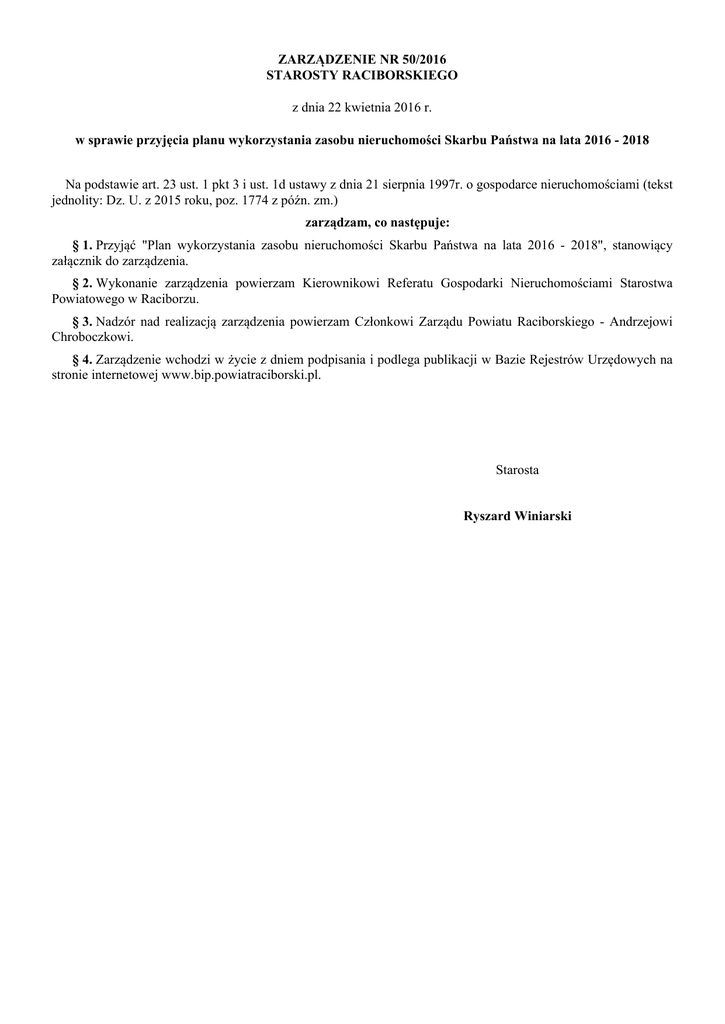 ZARZĄDZENIE NR 50/2016 STAROSTY RACIBORSKIEGO z dnia 22 kwietnia 2016 r. w sprawie przyjęcia planu wykorzystania zasobu nieruchomości Skarbu Państwa na lata 2016 - 2018 Na podstawie art. 23 ust. 1 pkt 3 i ust. 1d ustawy z dnia 21 sierpnia 1997r. o gospodarce nieruchomościami (tekst jednolity: Dz. U. z 2015 roku, poz. 1774 z późn. zm.) zarządzam, co następuje: § 1. Przyjąć "Plan wykorzystania zasobu nieruchomości Skarbu Państwa na lata 2016 - 2018", stanowiący załącznik do zarządzenia. § 2. Wykonanie zarządzenia powierzam Kierownikowi Referatu Gospodarki Nieruchomościami Starostwa Powiatowego w Raciborzu. § 3. Nadzór nad realizacją zarządzenia powierzam Członkowi Zarządu Powiatu Raciborskiego - Andrzejowi Chroboczkowi. § 4. Zarządzenie wchodzi w życie z dniem podpisania i podlega publikacji w Bazie Rejestrów Urzędowych na stronie internetowej www.bip.powiatraciborski.pl. Starosta Ryszard Winiarski Załącznik do Zarządzenia nr 50/2016 Starosty Raciborskiego z dnia 22 kwietnia 2016 r. PLAN WYKORZYSTANIA ZASOBU NIERUCHOMOŚCI SKARBU PAŃSTWA NA LATA 2016 – 2018 I. PODSTAWĘ PRAWNĄ sporządzonego planu wykorzystania zasobu stanowią przepisy art. 4 pkt 2 i pkt 9b, art. 11 ust.1, art. 12, art. 21, art. 23 ust.1, 1a, 1b, 1c, 1d ustawy z dnia 21 sierpnia 1997 roku o gospodarce nieruchomościami (tekst jednolity: Dz. U. z 2015 roku, poz. 1774 z późn. zm.). 1. Na podstawie wyżej wymienionych przepisów organem reprezentującym Skarb Państwa w sprawach gospodarowania nieruchomościami jest starosta wykonujący zadania z zakresu administracji rządowej. 2. Zasobem nieruchomości Skarbu Państwa na terenie Powiatu Raciborskiego gospodaruje Starosta Raciborski, wykonujący zadania z zakresu administracji rządowej. 3. Plan wykorzystania zasobu opracowany na okres 3 lat, tj. na lata 2016 – 2018 nakreśla główne kierunki działań, których realizacja jest uzgadniana z Wojewodą Śląskim jako organem nadzorującym. Wpływy z tytułu sprzedaży, opłat za użytkowanie wieczyste, opłat z tytułu trwałego zarządu, użytkowania, czynszu dzierżawnego, a także wpływy osiągane z tytułu odsetek za nieterminowe wnoszenie tych należności stanowią dochód. Środki w wysokości 25% uzyskanego dochodu stanowią dochód Powiatu Raciborskiego, a pozostała ich część tj. 75% zostaje przekazywana Wojewodzie. II. ZESTAWIENIE POWIERZCHNI NIERUCHOMOŚCI 1. Zasób nieruchomości Skarbu Państwa. Na dzień 1 stycznia 2016 r. zgodnie z zapisami operatu ewidencyjnego, w skład zasobu wchodzą grunty o łącznej powierzchni 16 956,2715 ha. 1 2. Nieruchomości Skarbu Państwa oddane w użytkowanie wieczyste. Na dzień 1 stycznia 2016 r. 674,1066 ha gruntów Skarbu Państwa (tj. 1294 działek) jest oddanych w użytkowanie wieczyste. Program i sposób ich zagospodarowania wynika z obowiązujących przepisów prawa, ustaleń zawartych w miejscowych planach zagospodarowania przestrzennego, decyzjach ustalających warunki zabudowy. III. PROGNOZY DOTYCZĄCE WYKORZYSTANIA ZASOBU NIERUCHOMOŚCI SKARBU PAŃSTWA 1. Prognoza dotycząca udostępniania nieruchomości zasobu oraz nabywania nieruchomości do zasobu. Udostępnianie nieruchomości następować będzie poprzez sprzedaż, zamianę, oddanie w użytkowanie wieczyste, trwały zarząd, dzierżawę, najem, użyczenie, a także przekazanie w formie darowizny – zgodnie z obowiązującymi w tym zakresie przepisami prawa. Nabywanie nieruchomości na rzecz Skarbu Państwa następuje w drodze kupna, darowizny, zamiany lub w innych formach przewidzianych prawem w związku z koniecznością realizacji zadań własnych, obowiązkami wynikającymi z przepisów szczególnych oraz realizacją celów publicznych. Nieruchomości zasobu Skarbu Państwa udostępniane są ponadto dla potrzeb związanych z czasowym zajęciem terenu na realizację nowych lub modernizację istniejących sieci uzbrojenia podziemnego lub nadziemnego, a także pozostałej infrastruktury technicznej. Przewiduje się, że w wyniku systematycznie prowadzonej regulacji stanów prawnych nieruchomości prowadzonej przez jednostki samorządu terytorialnego i Wojewodę Śląskiego, powierzchnia gruntów wchodzących w skład zasobu Skarbu Państwa będzie się zmniejszać. Trudne do określenia jest, o ile zmniejszy się powierzchnia zasobu w ciągu najbliższych trzech lat obowiązywania planu – zależy to od czasu trwania postępowań w sprawie uregulowania stanu prawnego. 2 Regulacją stanów prawnych, które mają wpływ na stan zasobu nieruchomości Skarbu Państwa, zajmują się także inne jednostki jak np. Polskie Koleje Państwowe, Lasy Państwowe, czy Agencja Nieruchomości Rolnych. Na udostępnianie i gospodarowanie nieruchomościami Skarbu Państwa duży wpływ ma także nieuregulowany stan prawny nieruchomości. Duża część nieruchomości Skarbu Państwa ma ciągle nieuregulowany stan prawny, trwa proces komunalizacji nieruchomości, znaczna część działek o nieuregulowanym stanie prawnym stanowi drogi publiczne, dojazdu rolniczego, itp. Ponadto, w trakcie sporządzania wykazu (zgodnie z ustawą z dnia 7 września 2007r. o ujawnieniu w księgach wieczystych prawa własności nieruchomości Skarbu Państwa oraz jednostek samorządu terytorialnego), okazało się, że w wielu przypadkach istnieją poważne rozbieżności pomiędzy danymi widniejącymi w ewidencji gruntów i w księgach wieczystych, które trzeba wyjaśnić. Rozbieżności te są w miarę możliwości wyjaśniane i usuwane. Nabywanie nieruchomości do zasobu może następować między innymi poprzez: 1) zakup nieruchomości, 2) zamianę nieruchomości, 3) przyjęcie darowizny nieruchomości, 4) inne czynności, np. zasiedzenie, spadkobranie. W Powiecie Raciborskim realizowana jest inwestycja, mająca na celu budowę Zbiornika przeciwpowodziowego „Racibórz Dolny”. Wojewoda Śląski w dniu 26 listopada 2012 roku wydał decyzję nr IFXIII.7820.38.2012 o pozwoleniu na realizację inwest