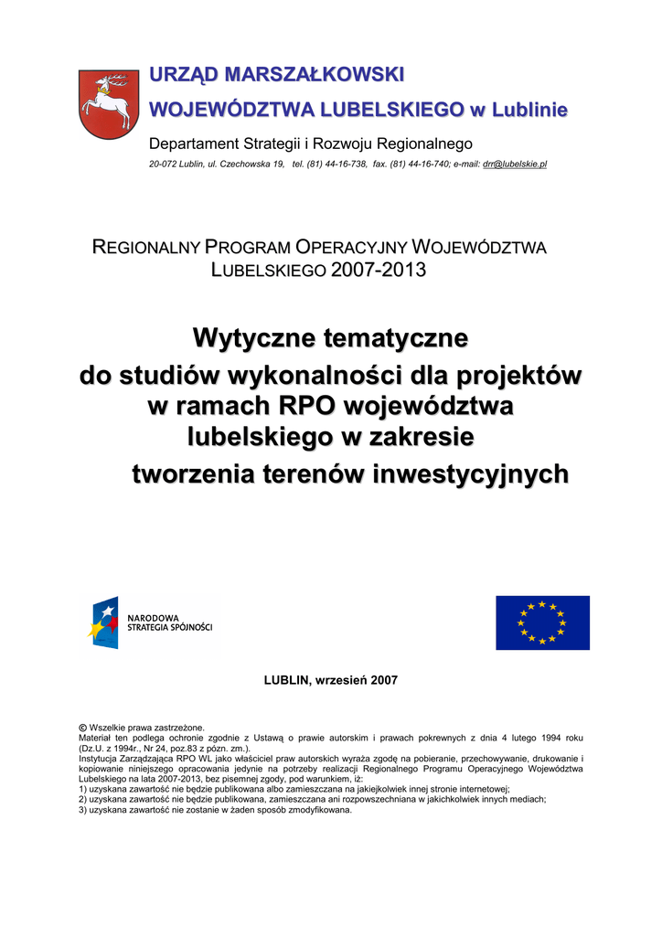 URZĄD MARSZAŁKOWSKI WOJEWÓDZTWA LUBELSKIEGO w Lublinie Departament Strategii i Rozwoju Regionalnego 20-072 Lublin, ul. Czechowska 19, tel. (81) 44-16-738, fax. (81) 44-16-740; e-mail: [email protected] REGIONALNY PROGRAM OPERACYJNY WOJEWÓDZTWA LUBELSKIEGO 2007-2013 Wytyczne tematyczne do studiów wykonalności dla projektów w ramach RPO województwa lubelskiego w zakresie tworzenia terenów inwestycyjnych LUBLIN, wrzesień 2007 © Wszelkie prawa zastrzeŜone. Materiał ten podlega ochronie zgodnie z Ustawą o prawie autorskim i prawach pokrewnych z dnia 4 lutego 1994 roku (Dz.U. z 1994r., Nr 24, poz.83 z pózn. zm.). Instytucja Zarządzająca RPO WL jako właściciel praw autorskich wyraŜa zgodę na pobieranie, przechowywanie, drukowanie i kopiowanie niniejszego opracowania jedynie na potrzeby realizacji Regionalnego Programu Operacyjnego Województwa Lubelskiego na lata 2007-2013, bez pisemnej zgody, pod warunkiem, iŜ: 1) uzyskana zawartość nie będzie publikowana albo zamieszczana na jakiejkolwiek innej stronie internetowej; 2) uzyskana zawartość nie będzie publikowana, zamieszczana ani rozpowszechniana w jakichkolwiek innych mediach; 3) uzyskana zawartość nie zostanie w Ŝaden sposób zmodyfikowana. Niniejsze wytyczne zostały przygotowane na zamówienie Urzędu Marszałkowskiego Województwa Lubelskiego przez grupę WYG International Sp. z o.o. w Warszawie, w ramach projektu kierowanego przez Renatę Mordak. Autorem wytycznych jest dr inŜ. Korneliusz Pylak. Ekspertyza współfinansowana ze środków Pomocy Technicznej Europejskiego Funduszu Rozwoju Regionalnego w ramach Regionalnego Programu Operacyjnego Województwa Lubelskiego 2 Wytyczne do zastosowania w: Działaniu 3.1. Tworzenie terenów inwestycyjnych Wprowadzenie Niniejsze wytyczne zostały przygotowane na zamówienie Urzędu Marszałkowskiego Województwa Lubelskiego przez grupę WYG International sp. z o.o. w ramach projektu kierowanego przez Renatę Mordak i są przeznaczone dla osób piszących studia wykonalności dla projektów w ramach Regionalnego Programu Operacyjnego Województwa Lubelskiego na lata 2007-2013. Celem wytycznych jest ujednolicenie zasad przygotowywania i pisania studiów wykonalności, w szczególności przyjmowania załoŜeń, parametrów, a takŜe metodologii prowadzenia obliczeń. Z jednej strony ma to za zadanie ułatwić ocenę i porównywalność wykonalności poszczególnych projektów, ale z drugiej – ułatwić pracę projektodawcom, którzy będą mogli krok po kroku przygotować stosowne warianty inwestycji, wybrać optymalny wariant projektu i wyliczyć korzyści dla społeczności województwa z tytułu jego realizacji. Wytyczne są przygotowane w formie podręcznika, w którym projektodawca po kolei zapoznaje się ze strukturą studium, dowiaduje się na co musi zwrócić uwagę, co będzie brane pod uwagę przy ocenie projektów, a takŜe ma do dyspozycji gotową metodologię, z której moŜe i powinien skorzystać. Dodatkowym ułatwieniem są ramki: ۞ ‘Pamiętaj’, w której wskazuje się na elementy podlegające ocenie lub wpływające na pozytywną ocenę; ۞ ‘Sprawdź’, w której jeszcze raz podsumowuje się elementy, które muszą być zawarte w studium lub pytania, na które naleŜy w opisie odpowiedzieć oraz ۞ ‘Do poprawy!’, w której moŜemy dowiedzieć się, kiedy projekt będzie zwrócony do poprawy (jakich elementów brakuje, co moŜe być nie tak itd.) Wytyczne dla kaŜdego rodzaju inwestycji są podzielone na dwie części: ogólne ‘Wytyczne Ogólne’, w którym moŜemy odnaleźć wspólne dla wszystkich inwestycji elementy studium oraz ‘Wytyczne Tematyczne’ – charakterystyczne dla danego rodzaju inwestycji. Praca nad 3 ! studium powinna rozpocząć się zatem od przestudiowania ‘Wytycznych Ogólnych’, a następnie podąŜać za zapisami ‘Wytycznych Tematycznych’. W punktach, w których znajduje się odesłanie do ‘Wytycznych Ogólnych’ naleŜy odszukać odpowiedni punkt w tym ogólnym dokumencie i zastosować się do jego zapisów. Niniejsze wytyczne w duŜej mierze opierają się na wytycznych do studiów wykonalności w ramach Zintegrowanego Programu Operacyjnego Rozwoju Regionalnego, ale mimo tego studia wykonalności przygotowane w okresie 2004-2006 wymagają aktualizacji z kilku powodów: ۞ nieco innej struktury studium i innego podziału dokumentu; ۞ innych załoŜeń wynikających z dokumentów unijnych; ۞ konieczności liczenia ‘luki finansowej’; ۞ stosowania innych dyskontowych); załoŜeń finansowych i ekonomicznych (m.in. innych stóp ۞ większego nacisku na badanie wariantowości inwestycji. Mamy nadzieję, Ŝe niniejsze wytyczne będą przy tym bardzo pomocne i przyczynią się do sukcesu wszystkich projektów zmieniających województwo lubelskie w dynamicznie rozwijający się region. Powodzenia! 4 Spis zawartości STRESZCZENIE STUDIUM.....................................................................................................................7 I. WYKONALNOŚĆ TECHNICZNO-TECHNOLOGICZNA ...................................................................8 I.1. STAN AKTUALNY .............................................................................................................................8 I.1.1. Opis stanu aktualnego (przed realizacją projektu) .........................................................................................8 I.1.2. Potrzeba realizacji projektu w kontekście wykonalności technicznej............................................................13 I.1.3. Cele projektu...............................................................................................................................................14 I.2. MOśLIWE WARIANTY .....................................................................................................................14 I.2.1. Opis najwaŜniejszych wariantów realizacji projektu (innych moŜliwych sposobów osiągnięcia celu proj
