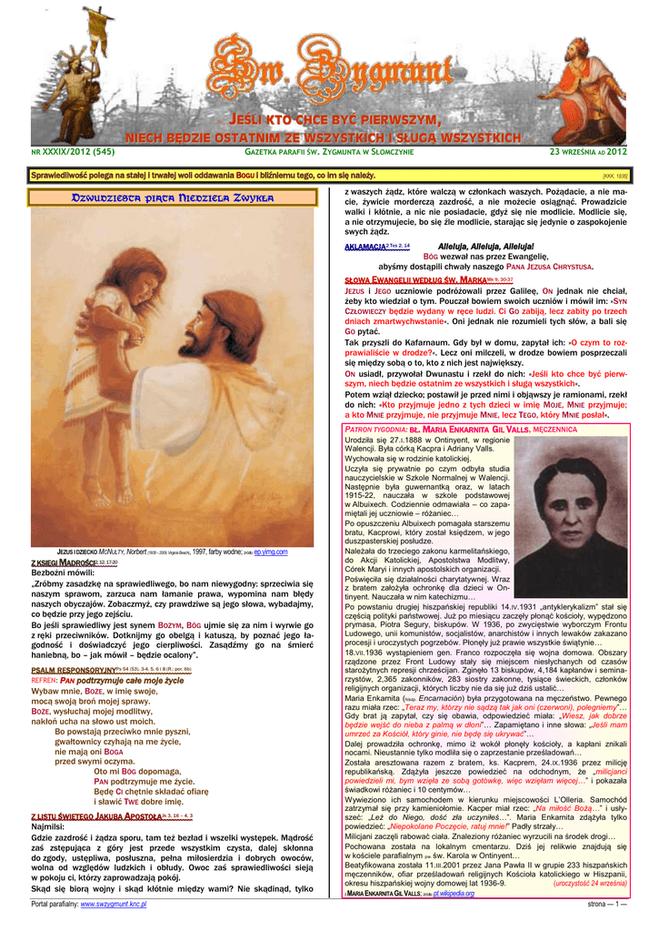 JEŚLI KTO CHCE BYĆ PIERWSZYM, »… NIECH BĘDZIE OSTATNIM ZE WSZYSTKICH I SŁUGĄ WSZYSTKICH…« NR XXXIX/2012 (545) GAZETKA PARAFII ŚW. ZYGMUNTA W SŁOMCZYNIE 23 WRZEŚNIA AD 2012 Sprawiedliwość polega na stałej i trwałej woli oddawania BOGU i bliźniemu tego, co im się należy. DZWUDZIESTA PIĄTA NIEDZIELA ZWYKŁA [KKK, 1836] z waszych żądz, które walczą w członkach waszych. Pożądacie, a nie macie, żywicie morderczą zazdrość, a nie możecie osiągnąć. Prowadzicie walki i kłótnie, a nic nie posiadacie, gdyż się nie modlicie. Modlicie się, a nie otrzymujecie, bo się źle modlicie, starając się jedynie o zaspokojenie swych żądz. Alleluja, Alleluja, Alleluja! BÓG wezwał nas przez Ewangelię, abyśmy dostąpili chwały naszego PANA JEZUSA CHRYSTUSA. AKLAMACJA2 Tes 2, 14 SŁOWA EWANGELII WEDŁUG ŚW. MARKAMk 9, 30-37 JEZUS i JEGO uczniowie podróżowali przez Galileę, ON jednak nie chciał, żeby kto wiedział o tym. Pouczał bowiem swoich uczniów i mówił im: »SYN CZŁOWIECZY będzie wydany w ręce ludzi. Ci GO zabiją, lecz zabity po trzech dniach zmartwychwstanie«. Oni jednak nie rozumieli tych słów, a bali się GO pytać. Tak przyszli do Kafarnaum. Gdy był w domu, zapytał ich: »O czym to rozprawialiście w drodze?«. Lecz oni milczeli, w drodze bowiem posprzeczali się między sobą o to, kto z nich jest największy. ON usiadł, przywołał Dwunastu i rzekł do nich: »Jeśli kto chce być pierwszym, niech będzie ostatnim ze wszystkich i sługą wszystkich«. Potem wziął dziecko; postawił je przed nimi i objąwszy je ramionami, rzekł do nich: »Kto przyjmuje jedno z tych dzieci w imię MOJE, MNIE przyjmuje; a kto MNIE przyjmuje, nie przyjmuje MNIE, lecz TEGO, który MNIE posłał«. PATRON TYGODNIA: BŁ. MARIA ENKARNITA GIL VALLS, MĘCZENNICA JEZUS I DZIECKO MCNULTY, Norbert (1938 – 2009, Virginia Beach), 1997, farby wodne; źródło: ep.yimg.com Z KSIĘGI MĄDROŚCI2, 12. 17-20 Bezbożni mówili: „Zróbmy zasadzkę na sprawiedliwego, bo nam niewygodny: sprzeciwia się naszym sprawom, zarzuca nam łamanie prawa, wypomina nam błędy naszych obyczajów. Zobaczmyż, czy prawdziwe są jego słowa, wybadajmy, co będzie przy jego zejściu. Bo jeśli sprawiedliwy jest synem BOŻYM, BÓG ujmie się za nim i wyrwie go z ręki przeciwników. Dotknijmy go obelgą i katuszą, by poznać jego łagodność i doświadczyć jego cierpliwości. Zasądźmy go na śmierć haniebną, bo – jak mówił – będzie ocalony”. PSALM RESPONSORYJNYPs 54 (53), 3-4. 5. 6 i 8 (R.: por. 6b) PAN podtrzymuje całe moje życie Wybaw mnie, BOŻE, w imię swoje, mocą swoją broń mojej sprawy. BOŻE, wysłuchaj mojej modlitwy, nakłoń ucha na słowo ust moich. Bo powstają przeciwko mnie pyszni, gwałtownicy czyhają na me życie, nie mają oni BOGA przed swymi oczyma. Oto mi BÓG dopomaga, PAN podtrzymuje me życie. Będę CI chętnie składać ofiarę i sławić TWE dobre imię. REFREN: Z LISTU ŚWIĘTEGO JAKUBA APOSTOŁAJk 3, 16 – 4, 3 Najmilsi: Gdzie zazdrość i żądza sporu, tam też bezład i wszelki występek. Mądrość zaś zstępująca z góry jest przede wszystkim czysta, dalej skłonna do zgody, ustępliwa, posłuszna, pełna miłosierdzia i dobrych owoców, wolna od względów ludzkich i obłudy. Owoc zaś sprawiedliwości sieją w pokoju ci, którzy zaprowadzają pokój. Skąd się biorą wojny i skąd kłótnie między wami? Nie skądinąd, tylko Portal parafialny: www.swzygmunt.knc.pl Urodziła się 27.I.1888 w Ontinyent, w regionie Walencji. Była córką Kacpra i Adriany Valls. Wychowała się w rodzinie katolickiej. Uczyła się prywatnie po czym odbyła studia nauczycielskie w Szkole Normalnej w Walencji. Następnie była guwernantką oraz, w latach 1915-22, nauczała w szkole podstawowej w Albuixech. Codziennie odmawiała – co zapamiętali jej uczniowie – różaniec… Po opuszczeniu Albuixech pomagała starszemu bratu, Kacprowi, który został księdzem, w jego duszpasterskiej posłudze. Należała do trzeciego zakonu karmelitańskiego, do Akcji Katolickiej, Apostolstwa Modlitwy, Córek Maryi i innych apostolskich organizacji. Poświęciła się działalności charytatywnej. Wraz z bratem założyła ochronkę dla dzieci w Ontinyent. Nauczała w nim katechizmu… Po powstaniu drugiej hiszpańskiej republiki 14.IV.1931 „antyklerykalizm” stał się częścią polityki państwowej. Już po miesiącu zaczęły płonąć kościoły, wypędzono prymasa, Piotra Segury, biskupów. W 1936, po zwycięstwie wyborczym Frontu Ludowego, unii komunistów, socjalistów, anarchistów i innych lewaków zakazano procesji i uroczystych pogrzebów. Płonęły już prawie wszystkie świątynie… 18.VII.1936 wystąpieniem gen. Franco rozpoczęła się wojna domowa. Obszary rządzone przez Front Ludowy stały się miejscem niesłychanych od czasów starożytnych represji chrześcijan. Zginęło 13 biskupów, 4,184 kapłanów i seminarzystów, 2,365 zakonników, 283 siostry zakonne, tysiące świeckich, członków religijnych organizacji, których liczby nie da się już dziś ustalić… Maria Enkarnita (hiszp. Encarnación) była przygotowana na męczeństwo. Pewnego razu miała rzec: „Teraz my, którzy nie sądzą tak jak oni (czerwoni), polegniemy”… Gdy brat ją zapytał, czy się obawia, odpowiedzieć miała: „Wiesz, jak dobrze będzie wejść do nieba z palmą w dłoni”… Zapamiętano i inne słowa: „Jeśli mam umrzeć za Kościół, który ginie, nie będę się ukrywać”… Dalej prowadziła ochronkę, mimo iż wokół płonęły kościoły, a kapłani znikali nocami. Nieustannie tylko modliła się o zaprzestanie prześladowań… Została aresztowana razem z bratem, ks. Kacprem, 24.IX.1936 przez milicję republikańską. Zdążyła jeszcze powiedzieć na odchodnym, że „milicjanci powiedzieli mi, bym wzięła ze sobą gotówkę, więc wzięłam więcej…” i pokazała świadkowi różaniec i 10 centymów… Wywieziono ich s