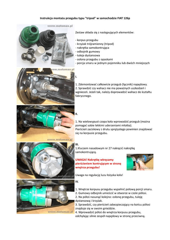 Instrukcja montażu przegubu typu "tripod" w samochodzie FIAT 126p Zestaw składa się z następujących elementów: - korpus przegubu - krzyżak trójramienny (tripod) - nakrętka samokontrująca - odbojnik gumowy - tuleja dystansowa - osłona przegubu z opaskami - porcja smaru w jednym pojemniku lub dwóch mniejszych I. 1. Zdemontować całkowicie przegub (łącznik) napędowy. 2. Sprawdzić czy wahacz nie ma poważnych uszkodzeń i wgnieceń. Jeżeli tak, należy doprowadzić wahacz do kształtu fabrycznego. II. 1. Na wielowypust czopa koła wprowadzić przegub (można pomagać sobie lekkimi uderzeniami młotka). Pierścień zaciskowy z drutu sprężystego powinien znajdować się na korpusie przegubu. III. 1.Kluczem nasadowym nr 27 nakręcić nakrętkę samokontrującą. UWAGA! Nakrętkę wkręcamy pierścieniem kontrującym w stronę wnętrza przegubu! Uwaga na regulację luzu łożyska koła! IV. 1. Wnętrze korpusu przegubu wypełnić połową porcji smaru. 2. Gumowy odbojnik umieścić w otworze w czole półosi. 2. Na półoś nasunąć kolejno: osłonę przegubu, tuleję dystansową i krzyżak. 3. Sprawdzić, czy pierścień zabezpieczający na końcu półosi znajduje się w swoim gnieździe. 4. Wprowadzić półoś do wnętrza korpusu przegubu, odchylając silnie zespół napędowy w stronę przeciwną. V. 1. Wprowadzić pierścienie krzyżaka w kanały korpusu przegubu i dosunąć półoś do oporu. 2. Dosunąć tuleję dystansową. 3. Osłonę przegubu wypełnić pozostałą połową porcji smaru i również dosunąć do korpusu. VI. 1. Osłonę elastyczną nasunąć na korpus przegubu tak, aby pierścień ustalający położenie osłony znalazł się w swoim gnieździe. VII. 1. Sprężystą opaskę zaciskową nasunąć na osłonę przy pomocy drugiej (mniejszej) opaski, wprowadzając zwój drutu sprężystego na osłonę poprzez obracanie kołem samochodu. VIII. 1. Zapiąć mniejszą opaskę osłony na oczko odpowiednie dla średnicy osłony. 2. Docisnąć wąski koniec osłony w kierunku koła tak, aby poprzez tuleję dystansową blokowała położenie krzyżaka. 3. Szczypcami czołowymi zacisnąć zamek opaski. IX. 1. Obracając kołem sprawdzić, czy osłona nie ociera o elementy wahacza. Prawidłowo zamontowany przegub wraz z osłoną powinien zachowywać dystans ok. 5mm od powierzchni wahacza o prawidłowym kształcie.
