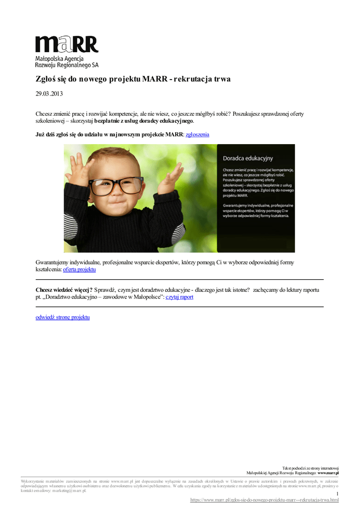 Zgłoś się do nowego projektu MARR - rekrutacja trwa 29.03.2013 Chcesz zmienić pracę i rozwijać kompetencje, ale nie wiesz, co jeszcze mógłbyś robić? Poszukujesz sprawdzonej oferty szkoleniowej – skorzystaj bezpłatnie z usług doradcy edukacyjnego. Już dziś zgłoś się do udziału w najnowszym projekcie MARR: zgłoszenia Gwarantujemy indywidualne, profesjonalne wsparcie ekspertów, którzy pomogą Ci w wyborze odpowiedniej formy kształcenia: oferta projektu Chcesz wiedzieć więcej? Sprawdź, czym jest doradztwo edukacyjne - dlaczego jest tak istotne? zachęcamy do lektury raportu pt. „Doradztwo edukacyjno – zawodowe w Małopolsce”: czytaj raport odwiedź stronę projektu Tekst pochodzi ze strony internetowej Małopolskiej Agencji Rozwoju Regionalnego: www.marr.pl Wykorzystanie m ateriałów zam ieszczonych na stronie www.m arr.pl jest dopuszczalne wyłącznie na zasadach określonych w Ustawie o prawie autorskim i prawach pokrewnych, w zakresie odpowiadającym własnem u użytkowi osobistem u oraz dozwolonem u użytkowi publicznem u. W celu uzyskania zgody na korzystanie z m ateriałów udostępnionych na stronie www.m arr.pl, prosim y o kontakt e-m ailowy: m arketing@m arr.pl. 1 https://www.marr.pl/zglos-sie-do-nowego-projektu-marr---rekrutacja-trwa.html