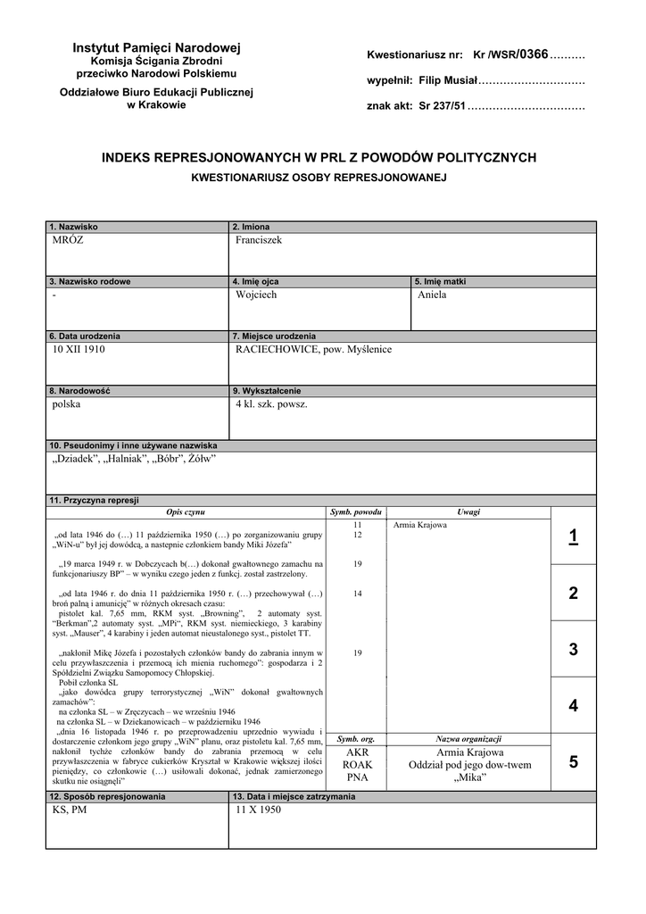 ,QVW\WXW3DPL FL1DURGRZHM Kwestionariusz nr: Kr /WSR/0366 .......... .RPLVMDFLJDQLD=EURGQL przeciwko Narodowi Polskiemu Z\SHáQLá)LOLS0XVLDá .............................. 2GG]LDáRZH%LXUR(GXNDFML3XEOLF]QHM w Krakowie znak akt: Sr 237/51 ................................. INDEKS REPRESJONOWANYCH W PRL Z POWODÓW POLITYCZNYCH KWESTIONARIUSZ OSOBY REPRESJONOWANEJ 1. Nazwisko 2. Imiona MRÓZ Franciszek ,PL RMFD 3. Nazwisko rodowe - ,PL PDWNL Wojciech 6. Data urodzenia Aniela 7. Miejsce urodzenia 5$&,(&+2:,&(SRZ0\OHQLFH 10 XII 1910 1DURGRZRü :\NV]WDáFHQLH polska 4 kl. szk. powsz. 3VHXGRQLP\LLQQHX*\ZDQHQD]ZLVND Ä']LDGHN´Ä+DOQLDN´Ä%yEU´)yáZ´ 11. Przyczyna represji Opis czynu Symb. powodu 11 „od lata 1946 do (…) 11 pa(G]LHUQLND « SR ]RUJDQL]RZDQLX JUXS\ 12 „WiN-X´E\áMHMGRZyGFDQDVWHSQLHF]áRQNLHPEDQG\0LNL-y]HID´ Uwagi Armia Krajowa 1 ÄPDUFDUZ'REF]\FDFKE«GRNRQDáJZDáWRZQHJR]DPDFKXQD funkcjonariuszy BP” –ZZ\QLNXF]HJRMHGHQ]IXQNFM]RVWDá]DVWU]HORQ\ 19 ÄRG ODWD U GR GQLD SD(G]LHUQLND U « SU]HFKRZ\ZDá « EURSDOQLDPXQLFM ´ZUy*Q\FKRNUHVDFKF]DVX pistolet kal. 7,65 mm, RKM syst. „Browning”, 2 automaty syst. “Berkman”,2 automaty syst. „MPi“, RKM syst. niemieckiego, 3 karabiny syst. „Mauser”, 4 karabiny i jeden automat nieustalonego syst., pistolet TT. 14 2 ÄQDNáRQLá0LN -y]HIDLSR]RVWDá\FKF]áRQNyZEDQG\GR]DEUDQLDLQQ\PZ FHOX SU]\ZáDV]F]HQLD L SU]HPRF LFK PLHQLD UXFKRPHJR´ JRVSRGDU]D L 6SyáG]LHOQL=ZL]NX6DPRSRPRF\&KáRSVNLHM 3RELáF]áRQND6/ ÄMDNR GRZyGFD JUXS\ WHUURU\VW\F]QHM Ä:L1´ GRNRQDá JZDáWRZQ\FK zamachów”: QDF]áRQND6/–Z=U F]\FDFK–ZHZU]HQLX QDF]áRQND6/– w Dziekanowicach –ZSD(G]LHUQLNX „dnia 16 listopada 1946 r. po przeprowadzeniu uprzednio wywiadu i GRVWDUF]HQLHF]áRQNRPMHJRJUXS\Ä:L1´SODQXRUD]SLVWROHWXNDOPP QDNáRQLá W\FK*H F]áRQNyZ EDQG\ GR ]DEUDQLD SU]HPRF Z FHOX SU]\ZáDV]F]HQLD Z IDEU\FH FXNLHUNyZ .U\V]WDá Z .UDNRZLH ZL NV]HM LORFL SLHQL G]\ FR F]áRQNRZLH « XVLáRZDOL GRNRQDü MHGQDN ]DPLHU]RQHJR VNXWNXQLHRVLJQ OL´ 19 3 12. Sposób represjonowania KS, PM 4 Symb. org. Nazwa organizacji AKR ROAK PNA Armia Krajowa 2GG]LDáSRGMHJRGRZ-twem „Mika” 13. Data i miejsce zatrzymania 11 X 1950 5 2VRE\UHSUHVMRQXMFH UHZL]MD*à$'<6=6WDQLVáDZ– WUBP Kraków SU]HVá-Ï=(),$.6WDQLVáDZ– WUBP Kraków SRVWRZV]F] FLXOHG]WZD-Ï=(),$.6WDQLVáDZ– WUBP Kraków post. o tymcz. areszt.: SMOLNICKI Piotr – WPR Kraków SU]HVá%$5$1-DQ– WUBP Kraków SU]HGáW\PF]DVDUHV]W1$325$.D]LPLHU]– WPR Kraków SU]HVá'86=<6.,$OHNVDQGHU– WPR Kraków SU]HVá0$-(:6.,7DGHXV]– WUBP Kraków SRVWRSRFLJQGRRGS-Ï=(),$.6WDQLVáDZ– WUBP Kraków 15. Data represji 9WU\EGRUD(Q\ sporz. aktuRVN-Ï=(),$.6WDQLVáDZ– WUBP Kraków zatw. aktu osk.: NAPORA Kazimierz – WPR Kraków GRZyGFDSOXWHJ]'%52:6.,:áDG\VáDZ SURNREHFQ\SU]\Z\N.6'86=<6.,$OHNVDQGHU– WPR Kraków 16. Miejsce represji Kraków ,QVW\WXFMDUHSUHVMRQXMFD 18. Znak akt WSR Kraków 3U]HZRGQLF]F\VNáDGXV G]LRZVNLHJR MAKOWSKI Tadeusz Sr 237/51 3R]RVWDOLV G]LRZLHDVHVRU]\áDZQLF\ 3,2752:6.,=G]LVáDZá 0$5&=(:6.,'DULXV]á 2VNDU*\FLHO 2EURFD %8&=<6.,.DURO]XU] GX DU6=<6.,$OHNVDQGHU 23. Wyrok w pierwszej instancji .DUDPLHUFLXWUDWDSUDZSXEOLF]Q\FKLRE\ZDWHOVNLFKSUDZKRQRURZ\FKRUD]SU]HSDGHNPLHQLD 3y(QLHMV]H]PLDQ\NDU\LSRGVWDZD]ZROQLHQLD - 25. Data zwolnienia - 26. DaWDPLHUFL 25 VI 1951 0LHMVFHPLHUFL :L ]LHQLH0RQWHOXSLFKZ.UDNRZLH 3U]\F]\QDPLHUFL Wykonanie wyroku 'UyGáRLQIRUPDFML Archiwum IPN w Krakowie (IPNKr), WSR Kraków, Sr 237/51 29. Miejsce pochówku b.d. 32. Uwagi - 'DWDUHKDELOLWDFMLOXEXQLHZD*QZ\URNX -