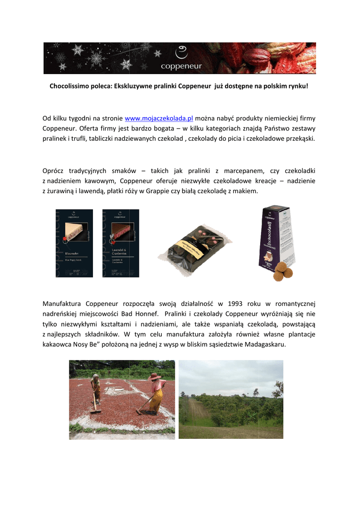 Chocolissimo poleca: Ekskluzywne pralinki Coppeneur już dostępne na polskim rynku! Od kilku tygodni na stronie www.mojaczekolada.pl można nabyć produkty niemieckiej firmy Coppeneur. Oferta firmy jest bardzo bogata – w kilku kategoriach znajdą Państwo zestawy pralinek i trufli, tabliczki nadziewanych czekolad , czekolady do picia i czekoladowe przekąski. Oprócz tradycyjnych smaków – takich jak pralinki z marcepanem, czy czekoladki z nadzieniem kawowym, Coppeneur Coppeneur oferuje niezwykłe czekoladowe kreacje – nadzienie z żurawiną i lawendą, płatki róży w Grappie czy białą czekoladę z makiem. Manufaktura Coppeneur rozpoczęła swoją działalność w 1993 roku w romantycznej nadreńskiej miejscowości Bad Honnef. Honnef. Pralinki i czekolady Coppeneur wyróżniają się nie tylko niezwykłymi kształtami i nadzieniami, ale także wspaniałą wspaniałą czekoladą, powstającą z najlepszych składników. W tym celu manufaktura założyła również własne plantacje kakaowca Nosy Be” położoną na jednej jednej z wysp w bliskim sąsiedztwie Madagaskaru. Wszystkie produkty Coppeneur wytwarzane są z ziaren kakaowca, wyhodowanych w ekologicznych plantacjach z dala od wielkich aglomeracji. Najważniejszym kryterium podczas wyboru plantacji współpracujących są warunki naturalne towarzyszące wzrostowi owoców kakao, tradycyjne, niezmienne od wielu pokoleń metody ich przetwarzania oraz oczywiście najwyższa jakość uzyskanych w efekcie końcowym ziaren kakao. Do produkcji swoich wyrobów Coppeneur używa stuprocentowego masła kakaowego oraz owoców i alkoholi najwyższej jakości wytwarzanych przez cenionych producentów. Zapraszamy do odwiedzenia nowej polskiej strony Coppeneur i życzymy niezwykłych doznań przy kosztowaniu ich czekoladowych specjałów! Kontakt dla mediów: Maria Sroka [email protected] Oraz [email protected]