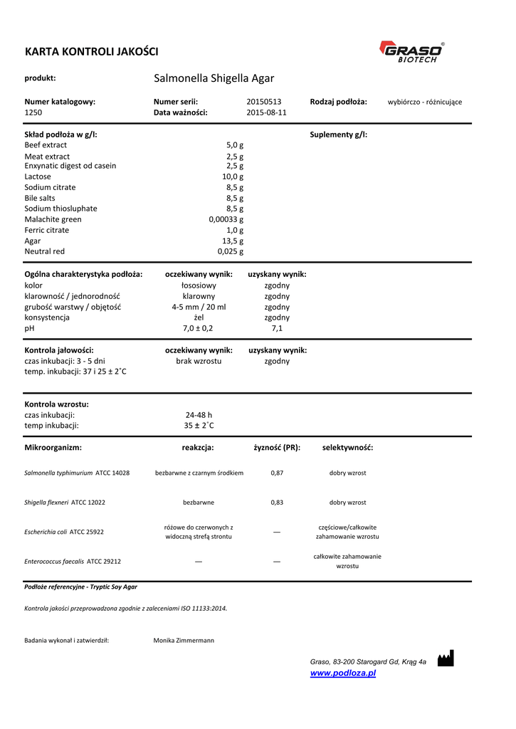 KARTA KONTROLI JAKOŚCI produkt: Salmonella Shigella Agar Numer katalogowy: 1250 Numer serii: Data ważności: Skład podłoża w g/l: Beef extract Meat extract Enxynatic digest od casein Lactose Sodium citrate Bile salts Sodium thiosluphate Malachite green Ferric citrate Agar Neutral red 20150513 2015-08-11 Rodzaj podłoża: Suplementy g/l: 5,0 g 2,5 g 2,5 g 10,0 g 8,5 g 8,5 g 8,5 g 0,00033 g 1,0 g 13,5 g 0,025 g Ogólna charakterystyka podłoża: kolor klarowność / jednorodność grubość warstwy / objętość konsystencja pH oczekiwany wynik: łososiowy klarowny 4-5 mm / 20 ml żel 7,0 ± 0,2 uzyskany wynik: zgodny zgodny zgodny zgodny 7,1 Kontrola jałowości: czas inkubacji: 3 - 5 dni temp. inkubacji: 37 i 25 ± 2˚C oczekiwany wynik: brak wzrostu uzyskany wynik: zgodny Kontrola wzrostu: czas inkubacji: temp inkubacji: 24-48 h 35 ± 2˚C Mikroorganizm: reakzcja: żyzność (PR): selektywność: bezbarwne z czarnym środkiem 0,87 dobry wzrost Shigella flexneri ATCC 12022 bezbarwne 0,83 dobry wzrost Escherichia coli ATCC 25922 różowe do czerwonych z widoczną strefą strontu — częściowe/całkowite zahamowanie wzrostu — — całkowite zahamowanie wzrostu Salmonella typhimurium ATCC 14028 Enterococcus faecalis ATCC 29212 wybiórczo - różnicujące Podłoże referencyjne - Tryptic Soy Agar Kontrola jakości przeprowadzona zgodnie z zaleceniami ISO 11133:2014. Badania wykonał i zatwierdził: Monika Zimmermann Graso, 83-200 Starogard Gd, Krąg 4a www.podloza.pl