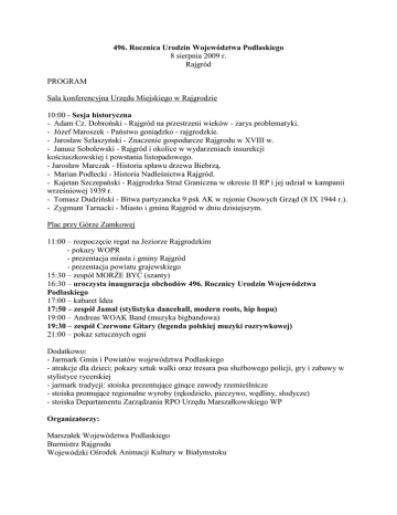 496. Rocznica Urodzin Województwa Podlaskiego 8 sierpnia 2009 r. Rajgród PROGRAM Sala konferencyjna Urzędu Miejskiego w Rajgrodzie 10:00 - Sesja historyczna - Adam Cz. Dobroński - Rajgród na przestrzeni wieków - zarys problematyki. - Józef Maroszek - Państwo goniądzko - rajgrodzkie. - Jarosław Szlaszyński - Znaczenie gospodarcze Rajgrodu w XVIII w. - Janusz Sobolewski - Rajgród i okolice w wydarzeniach insurekcji kościuszkowskiej i powstania listopadowego. - Jarosław Marczak - Historia spławu drzewa Biebrzą. - Marian Podlecki - Historia Nadleśnictwa Rajgród. - Kajetan Szczepański - Rajgrodzka StraŜ Graniczna w okresie II RP i jej udział w kampanii wrześniowej 1939 r. - Tomasz Dudziński - Bitwa partyzancka 9 psk AK w rejonie Osowych Grząd (8 IX 1944 r.). - Zygmunt Tarnacki - Miasto i gmina Rajgród w dniu dzisiejszym. Plac przy Górze Zamkowej 11:00 – rozpoczęcie regat na Jeziorze Rajgrodzkim - pokazy WOPR - prezentacja miasta i gminy Rajgród - prezentacja powiatu grajewskiego 15:30 – zespół MORśE BYĆ (szanty) 16:30 – uroczysta inauguracja obchodów 496. Rocznicy Urodzin Województwa Podlaskiego 17:00 – kabaret Idea 17:50 – zespół Jamal (stylistyka dancehall, modern roots, hip hopu) 19:00 – Andreas WOAK Band (muzyka bigbandowa) 19:30 – zespół Czerwone Gitary (legenda polskiej muzyki rozrywkowej) 21:00 – pokaz sztucznych ogni Dodatkowo: - Jarmark Gmin i Powiatów województwa Podlaskiego - atrakcje dla dzieci; pokazy sztuk walki oraz tresura psa słuŜbowego policji, gry i zabawy w stylistyce rycerskiej - jarmark tradycji: stoiska prezentujące ginące zawody rzemieślnicze - stoiska promujące regionalne wyroby (rękodzieło, pieczywo, wędliny, słodycze) - stoiska Departamentu Zarządzania RPO Urzędu Marszałkowskiego WP Organizatorzy: Marszałek Województwa Podlaskiego Burmistrz Rajgrodu Wojewódzki Ośrodek Animacji Kultury w Białymstoku Patronat medialny: portal Wrota Podlasia portal Białystok Online e- kultura.pl portal śycie Grajewa Polskie Radio Białystok TVP Białystok „Gazeta Współczesna” „Rajgrodzkie Echa” Sponsorzy: Browar ŁomŜa SKOK Stefczyka PUiR WARTA WyŜsza Szkoła Finansów i Zarządzania w Białymstoku Dworek Opartowo Jurajski Park Dinozaurów Dworek pod Lipami