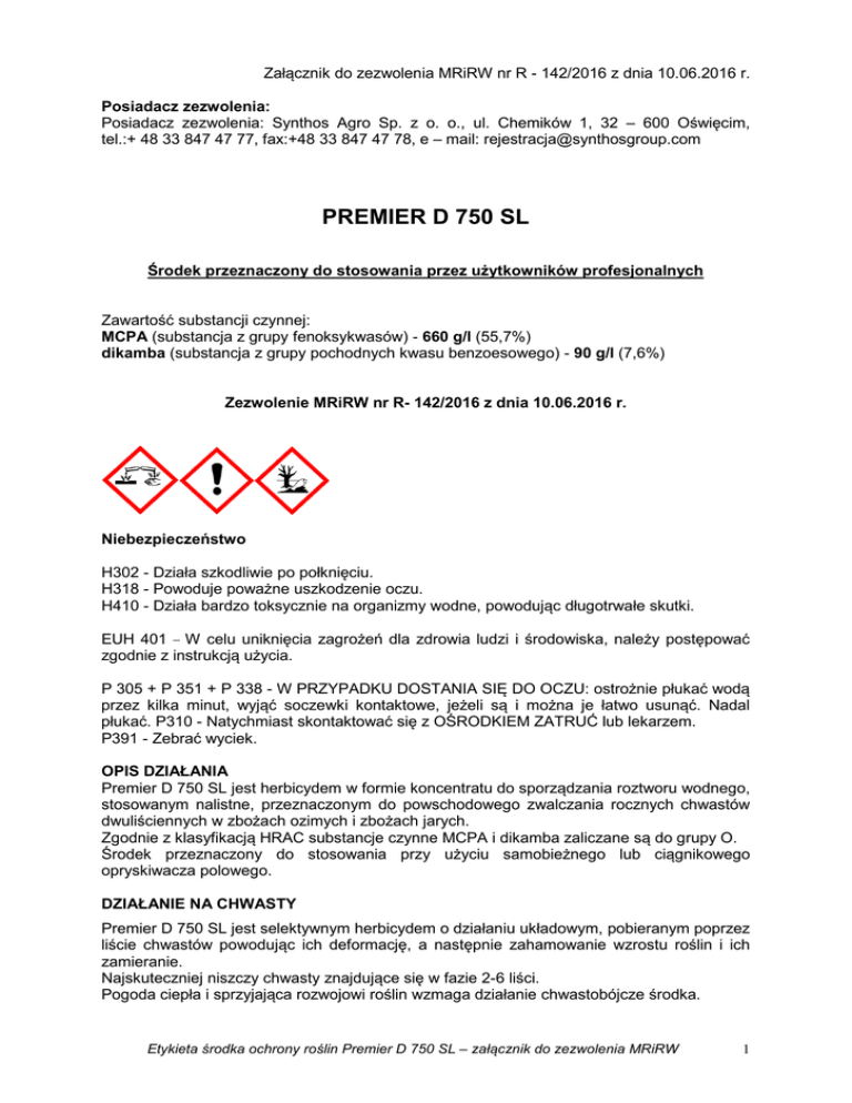 Załącznik do zezwolenia MRiRW nr R - 142/2016 z dnia 10.06.2016 r. Posiadacz zezwolenia: Posiadacz zezwolenia: Synthos Agro Sp. z o. o., ul. Chemików 1, 32 – 600 Oświęcim, tel.:+ 48 33 847 47 77, fax:+48 33 847 47 78, e – mail: [email protected] PREMIER D 750 SL Środek przeznaczony do stosowania przez użytkowników profesjonalnych Zawartość substancji czynnej: MCPA (substancja z grupy fenoksykwasów) - 660 g/l (55,7%) dikamba (substancja z grupy pochodnych kwasu benzoesowego) - 90 g/l (7,6%) Zezwolenie MRiRW nr R- 142/2016 z dnia 10.06.2016 r. Niebezpieczeństwo H302 - Działa szkodliwie po połknięciu. H318 - Powoduje poważne uszkodzenie oczu. H410 - Działa bardzo toksycznie na organizmy wodne, powodując długotrwałe skutki. EUH 401 W celu uniknięcia zagrożeń dla zdrowia ludzi i środowiska, należy postępować zgodnie z instrukcją użycia. P 305 + P 351 + P 338 - W PRZYPADKU DOSTANIA SIĘ DO OCZU: ostrożnie płukać wodą przez kilka minut, wyjąć soczewki kontaktowe, jeżeli są i można je łatwo usunąć. Nadal płukać. P310 - Natychmiast skontaktować się z OŚRODKIEM ZATRUĆ lub lekarzem. P391 - Zebrać wyciek. OPIS DZIAŁANIA Premier D 750 SL jest herbicydem w formie koncentratu do sporządzania roztworu wodnego, stosowanym nalistne, przeznaczonym do powschodowego zwalczania rocznych chwastów dwuliściennych w zbożach ozimych i zbożach jarych. Zgodnie z klasyfikacją HRAC substancje czynne MCPA i dikamba zaliczane są do grupy O. Środek przeznaczony do stosowania przy użyciu samobieżnego lub ciągnikowego opryskiwacza polowego. DZIAŁANIE NA CHWASTY Premier D 750 SL jest selektywnym herbicydem o działaniu układowym, pobieranym poprzez liście chwastów powodując ich deformację, a następnie zahamowanie wzrostu roślin i ich zamieranie. Najskuteczniej niszczy chwasty znajdujące się w fazie 2-6 liści. Pogoda ciepła i sprzyjająca rozwojowi roślin wzmaga działanie chwastobójcze środka. Etykieta środka ochrony roślin Premier D 750 SL – załącznik do zezwolenia MRiRW 1 Zboża jare: Dawka 1,0 l/ha Chwasty wrażliwe: chaber bławatek, fiołek polny, gorczyca polna, gwiazdnica pospolita, jasnota purpurowa, komosa biała, przytulia czepna, rumian polny, samosiewy rzepaku, szarłat szorstki, tasznik pospolity, tobołki polne. Chwasty średniowrażliwe: rdestówka powojowata (rdest powojowaty). Dawka 1,25 l/ha Chwasty wrażliwe: chaber bławatek, fiołek polny, gorczyca polna, gwiazdnica pospolita, jasnota purpurowa, komosa biała, przytulia czepna, rdestówka powojowata (rdest powojowaty), rumian polny, samosiewy rzepaku, szarłat szorstki, tasznik pospolity, tobołki polne. Zboża ozime: Dawka 1,0 l/ha Chwasty wrażliwe: chaber bławatek, gwiazdnica pospolita, iglica pospolita, jasnota purpurowa, mak polny, maruna bezwonna, niezapominajka polna, przytulia czepna, rumian polny, samosiewy rzepaku, tasznik pospolity, tobołki polne. Chwasty średniowrażliwe: bodziszek drobny, fiołek polny, przetacznik perski. Dawka 1,25 l/ha Chwasty wrażliwe: chaber bławatek, gwiazdnica pospolita, iglica pospolita, jasnota purpurowa, mak polny, maruna bezwonna, niezapominajka polna, przytulia czepna, rumian polny, samosiewy rzepaku, tasznik pospolity, tobołki polne. Chwasty średniowrażliwe: bodziszek drobny, fiołek polny, przetacznik perski. STOSOWANIE ŚRODKA Pszenica ozima, jęczmień ozimy, pszenżyto ozime, żyto Maksymalna dawka środka dla jednorazowego zastosowania: 1,25 l/ha. Zalecana dawka środka dla jednorazowego zastosowania: 1,0 - 1,25 l/ha. Termin stosowania: środek stosować wiosną, od początku fazy krzewienia zbóż do końca tej fazy (BBCH 21-29) Maksymalna liczba zabiegów w sezonie wegetacyjnym: 1. Zalecana ilość wody: 200 - 300 l/ha. Zalecane opryskiwanie: średniokropliste. Pszenica jara, jęczmień jary, pszenżyto jare, owies Maksymalna dawka środka dla jednorazowego zastosowania: 1,25 l/ha. Zalecana dawka środka dla jednorazowego zastosowania: 1,0 - 1,25 l/ha. Termin stosowania: środek stosować wiosną, od początku fazy krzewienia zbóż do końca tej fazy (BBCH 21-29) Maksymalna liczba zabiegów w sezonie wegetacyjnym: 1. Zalecana ilość wody: 200 - 300 l/ha. Zalecane opryskiwanie: średniokropliste. NASTĘPSTWO ROŚLIN W przypadku konieczności zaorania plantacji potraktowanej środkiem (w wyniku uszkodzenia roślin przez przymrozki, choroby lub szkodniki) po wykonaniu uprawy przedsiewnej można uprawiać wszystkie rośliny rolnicze. Etykieta środka ochrony roślin Premier D 750 SL – załącznik do zezwolenia MRiRW 2 ŚRODKI OSTROŻNOŚCI I ZALECENIA STOSOWANIA ZWIĄZANE Z DOBRĄ PRAKTYKĄ ROLNICZĄ 1. Środka nie stosować: − na rośliny chore, wylegnięte i uszkodzone, − w temperaturze powietrza poniżej 10°C i powyżej 25°C, − w okresie, gdy temperatura nocą jest niższa niż +5°C, − w okresie nadmiernej suszy lub zbliżających się deszczów. 2. Podczas stosowania środka nie dopuścić do: − znoszenia cieczy użytkowej na sąsiednie rośliny uprawne, − nakładania się cieczy użytkowej na stykach pasów zabiegowych i uwrociach. SPORZĄDZANIE CIECZY UŻYTKOWEJ Ciecz użytkową przygotować bezpośrednio przed zastosowaniem. Przed przystąpieniem do sporządzania cieczy użytkowej dokładnie ustalić potrzebną jej ilość. Odmierzoną ilość środka wlać do zbiornika opryskiwacza napełnionego do połowy wodą (z włączonym mieszadłem). Opróżnione opakowania przepłukać trzykrotnie wodą, a popłuczyny wlać do zbiornika opryskiwacza z cieczą użytkową, uzupełnić wodą do potrzebnej ilości i dokładnie wymieszać. Po wlaniu środka do zbiornika opryskiwacza nie wyposażonego w mieszadło hydrauliczne, ciecz mechanicznie wymieszać. W przypadku przerw w opryskiwaniu, przed ponownym przystąpieniem do pracy ciecz użytkową w zbiorniku opryskiwacza dokładnie wymieszać. POSTĘPOWANIE Z RESZTKAMI CIECZY UŻYTKOWEJ I MYCIE APARATURY Z resztkami cieczy użytkowej po zabiegu należy 