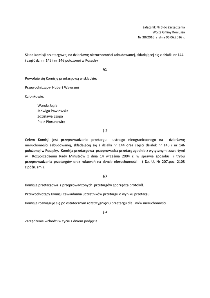 Załącznik Nr 3 do Zarządzenia Wójta Gminy Koniusza Nr 38/2016 z dnia 06.06.2016 r. Skład Komisji przetargowej na dzierżawę nieruchomości zabudowanej, składającej się z działki nr 144 i część dz. nr 145 i nr 146 położonej w Posadzy §1 Powołuje się Komisję przetargową w składzie: Przewodniczący- Hubert Wawrzeń Członkowie: Wanda Jagła Jadwiga Pawłowska Zdzisława Szopa Piotr Piorunowicz §2 Celem Komisji jest przeprowadzenie przetargu ustnego nieograniczonego na dzierżawę nieruchomości zabudowanej, składającej się z działki nr 144 oraz części działek nr 145 i nr 146 położonej w Posądzy. Komisja przetargowa przeprowadza przetarg zgodnie z wytycznymi zawartymi w Rozporządzeniu Rady Ministrów z dnia 14 września 2004 r. w sprawie sposobu i trybu przeprowadzania przetargów oraz rokowań na zbycie nieruchomości ( Dz. U. Nr 207,poz. 2108 z późn. zm.). §3 Komisja przetargowa z przeprowadzonych przetargów sporządza protokół. Przewodniczący Komisji zawiadamia uczestników przetargu o wyniku przetargu. Komisja rozwiązuje się po ostatecznym rozstrzygnięciu przetargu dla w/w nieruchomości. §4 Zarządzenie wchodzi w życie z dniem podjęcia.