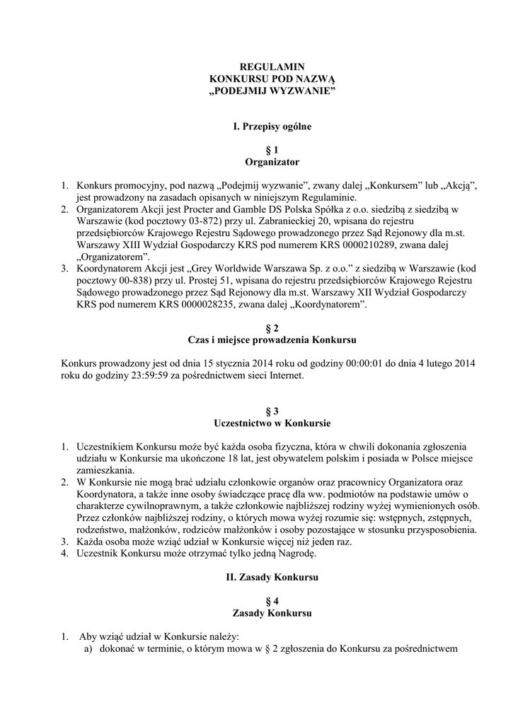 REGULAMIN KONKURSU POD NAZWĄ „PODEJMIJ WYZWANIE” I. Przepisy ogólne §1 Organizator 1. Konkurs promocyjny, pod nazwą „Podejmij wyzwanie”, zwany dalej „Konkursem” lub „Akcją”, jest prowadzony na zasadach opisanych w niniejszym Regulaminie. 2. Organizatorem Akcji jest Procter and Gamble DS Polska Spółka z o.o. siedzibą z siedzibą w Warszawie (kod pocztowy 03-872) przy ul. Zabranieckiej 20, wpisana do rejestru przedsiębiorców Krajowego Rejestru Sądowego prowadzonego przez Sąd Rejonowy dla m.st. Warszawy XIII Wydział Gospodarczy KRS pod numerem KRS 0000210289, zwana dalej „Organizatorem”. 3. Koordynatorem Akcji jest „Grey Worldwide Warszawa Sp. z o.o.” z siedzibą w Warszawie (kod pocztowy 00-838) przy ul. Prostej 51, wpisana do rejestru przedsiębiorców Krajowego Rejestru Sądowego prowadzonego przez Sąd Rejonowy dla m.st. Warszawy XII Wydział Gospodarczy KRS pod numerem KRS 0000028235, zwana dalej „Koordynatorem”. §2 Czas i miejsce prowadzenia Konkursu Konkurs prowadzony jest od dnia 15 stycznia 2014 roku od godziny 00:00:01 do dnia 4 lutego 2014 roku do godziny 23:59:59 za pośrednictwem sieci Internet. §3 Uczestnictwo w Konkursie 1. Uczestnikiem Konkursu może być każda osoba fizyczna, która w chwili dokonania zgłoszenia udziału w Konkursie ma ukończone 18 lat, jest obywatelem polskim i posiada w Polsce miejsce zamieszkania. 2. W Konkursie nie mogą brać udziału członkowie organów oraz pracownicy Organizatora oraz Koordynatora, a także inne osoby świadczące pracę dla ww. podmiotów na podstawie umów o charakterze cywilnoprawnym, a także członkowie najbliższej rodziny wyżej wymienionych osób. Przez członków najbliższej rodziny, o których mowa wyżej rozumie się: wstępnych, zstępnych, rodzeństwo, małżonków, rodziców małżonków i osoby pozostające w stosunku przysposobienia. 3. Każda osoba może wziąć udział w Konkursie więcej niż jeden raz. 4. Uczestnik Konkursu może otrzymać tylko jedną Nagrodę. II. Zasady Konkursu §4 Zasady Konkursu 1. Aby wziąć udział w Konkursie należy: a) dokonać w terminie, o którym mowa w § 2 zgłoszenia do Konkursu za pośrednictwem strony internetowej www.everydayme.pl/duracell (Zgłoszenie”) b) wykonać zadanie konkursowe polegające na zwięzłym opisaniu swojego celu, do realizacji którego brakuje Uczestnikowi odpowiedniego przygotowania lub środków finansowych, a który chciałby zrealizować przy pomocy trenera osobistego, („Cel”). 2. Aby dokonać zgłoszenia za pośrednictwem wskazanej powyżej strony internetowej Uczestnik musi: a) zalogować się na stronie Konkursu, b) dokonać rejestracji podając m.in. swoje imię i nazwisko, login (adres e-mail, którego jest właścicielem), datę urodzenia, hasło, c) wyrazić zgodę na przetwarzanie danych osobowych przez Organizatora oraz Koordynatora, d) wyrazić zgodę na publikację przez Organizatora oraz Koordynatora zgłoszonego do Konkursu Celu, w przypadku otrzymania nagrody w Konkursie, e) wyrazić zgodę na samodzielne wykonanie dokumentacji zdjęciowej i filmowej z realizacji nagrody, w przypadku otrzymania nagrody w Konkursie, f) wyrazić zgodę na korzystanie przez Organizatora oraz Koordynatora z danych osobowych Uczestnika i jego wizerunku oraz dokumentacji zdjęciowej i filmowej z realizacji nagrody, w przypadku otrzymania nagrody w Konkursie, g) złożyć deklarację, w której oświadczy, że zdaje sobie sprawę i jednocześnie godzi się na ryzyko wystąpienia uszczerbku w majątku jak i na osobie, w postaci szkody majątkowej i niemajątkowej, która może wyniknąć w związku z realizacją zaproponowanego przez siebie Celu, w przypadku otrzymania nagrody w Konkursie. h) Złożyć deklarację, że nie występują u niego przeciwwskazania natury zdrowotnej, które uniemożliwiałyby lub utrudniałyby mu zrealizowanie Celu. §5 Zakaz naruszeń 1. Propozycja Celu zgłoszona w ramach zadania konkursowego nie może: a. naruszać prawa, b. zawierać wulgaryzmów, c. zawierać szokujących treści, d. być obsceniczna, zawierać treści promujące agresję lub przemoc, e. zawierać treści pornograficzne lub nawiązujące do seksu, f. zawierać niestosowne treści, które mogą urazić kogokolwiek, w tym komisję lub Organizatora, g. zawierać treści obraźliwe dla Uczestnika lub jakiejkolwiek osoby trzeciej, h. zawierać dane osobowe jakiejkolwiek osoby trzeciej za wyjątkiem Uczestnika, i. zawierać znaków towarowych konkurentów lub produktów konkurentów, j. ukazywać innych marek lub produktów nie należących do Organizatora, k. zawierać lub sugerować działalność reklamową, l. odsyłać do innej strony internetowej, m. być chroniona przez jakiekolwiek prawa własności intelektualnej. 2. Propozycja Celu zgłoszona w ramach zadania konkursowego, naruszająca powyższe zasady nie będzie brana pod uwagę przy przyznawaniu nagród. III. Rozstrzygnięcie Konkursu. Nagrody §6 Nagrody w Konkursie 1. W Konkursie do wygrania są 3 (trzy) równorzędne Nagrody. 2. W rywalizacji o Nagrody biorą udział Uczestnicy, którzy dokonali prawidłowego zgłoszenia do Konkursu oraz wykonali zadanie konkursowe, odpowiadające warunkom Regulaminu. 3. Każda z Nagród składa się z: a) Pakietu obejmującego: Aparat fotograficzny Sony cyber-shot, z funkcją wykonywania filmów oraz kartą pamięci, o wartości 550 złotych brutto Usługę wsparcia Laureata w zrealizowaniu przez Laureata Celu polegającą na zakupie lub wynajęciu niezbędnego sprzętu, a w szczególności polegającą na zapewnieniu pomocy, wskazanego przez Organizatora, trenera personalnego (coaching), Wykupienie polisy ubezpieczeniowej NNW -ubezpieczenie następstw nieszczęśliwych wypadków - dla Laureata w związku z realizacją Celu. o łącznej wartości 12.000,00 złotych brutto; b) oraz dodatkowo kwota w wysokości 1.334,00 złote przeznaczona na pokrycie podatku od nagród. 4. W przypadku nie zrealizowania przez Laureata 