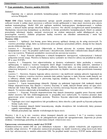 Tomasz Greszata - Koszalin 2013 - http://greszata.pl T: Typy protokołów. Warstwy modelu ISO/OSI. Zadanie1: Zapoznaj się z opisem protokołu komunikacyjnego i modelu ISO/OSI publikowanym na stronach serwisu Wikipedii. Model OSI (Open Systems Interconnection) opisuje sposób przepływu informacji między aplikacjami software’owymi w jednej stacji sieciowej a software’owymi aplikacjami w innej stacji sieciowej przy użyciu medium transmisyjnego. Model OSI jest ogólnym modelem koncepcyjnym, skomponowanym z siedmiu warstw, z których każda opisuje określone funkcje sieciowe. Nie określa szczegółowych metod komunikacji. Mechanizmy rzeczywistej komunikacji są określone w formie protokołów komunikacyjnych. Dzieli on zadanie przesyłania informacji między stacjami sieciowymi na siedem mniejszych zadań składających się na poszczególne warstwy. Zadanie przypisane każdej warstwie ma charakter autonomiczny i może być interpretowane niezależnie. Warstwy OSI: warstwa 7 – Aplikacji. Jest bramą, przez którą procesy aplikacji dostają się do usług sieciowych. Ta warstwa prezentuje usługi, które są realizowane przez aplikacje (przesyłanie plików, dostęp do baz danych, poczta elektroniczna itp.) warstwa 6 – Prezentacji danych. Odpowiada za format używany do wymiany danych pomiędzy komputerami w sieci. Na przykład szyfrowanie i deszyfrowanie, kodowanie i dekodowanie danych odbywa się w tej warstwie. Większość protokołów sieciowych nie zawiera tej warstwy. warstwa 5 – Sesji. Pozwala aplikacjom z różnych komputerów nawiązywać, wykorzystywać i kończyć połączenie (zwane sesją). Warstwa ta tłumaczy nazwy systemów na właściwe adresy (na przykład na adresy IP w sieci TCP/IP). warstwa 4 – Transportu. Jest odpowiedzialna za dostawę wiadomości, które pochodzą z warstwy aplikacyjnej. U nadawcy warstwa transportu dzieli długie wiadomości na kilka pakietów, natomiast u odbiorcy odtwarza je i wysyła potwierdzenie odbioru. Sprawdza także, czy dane zostały przekazane we właściwej kolejności i na czas. W przypadku pojawienia się błędów warstwa żąda powtórzenia transmisji danych. warstwa 3 – Sieciowa. Kojarzy logiczne adresy sieciowe i ma możliwość zamiany adresów logicznych na fizyczne. U nadawcy warstwa sieciowa zamienia duże pakiety logiczne w małe fizyczne ramki danych, zaś u odbiorcy składa ramki danych w pierwotną logiczną strukturę danych. Ta warstwa odpowiada za komunikację między sieciami. warstwa 2 – Łącza transmisyjnego (danych). Zajmuje się pakietami logicznymi (lub ramkami) danych. Pakuje nieprzetworzone bity danych z warstwy fizycznej w ramki, których format zależy od typu sieci: Ethernet lub Token Ring. Ramki używane przez tą warstwę zawierają fizyczne adresy nadawcy i odbiorcy danych. Ta warstwa odpowiada za komunikację wewnątrz sieci. warstwa 1 – Fizyczna. Przesyła nieprzetworzone bity danych (transmisja sygnału) przez fizyczny nośnik (kabel sieciowy lub fale elektromagnetyczne w przypadku sieci radiowych). Ta warstwa przenosi dane generowane przez wszystkie wyższe poziomy. Warstwa fizyczna odpowiada następującym składnikom fizycznym: • Topologia sieci (sieć magistralowa lub gwiazdkowa), która określa a jaki sposób są fizycznie połączone 4różne węzły sieci. • Nośnik transmisji danych (kabel koncentryczny, skrętka dwużyłowa lub światłowód), który przenosi sygnały reprezentujące dane. • Metoda przesyłania (np. metoda wielodostępu do łącza sieci). Warstwy 1 do 4 są to tzw. warstwy niższe (transport danych) zaś warstwy 5 do 7 to warstwy wyższe (aplikacje). Model OSI nie odnosi się do jakiegokolwiek sprzętu lub oprogramowania. Zapewnia po prostu strukturę i terminologię potrzebną do omawiania różnych właściwości sieci. Uproszczony czterowarstwowy model sieci TCP/IP Siedmiowarstwowy model OSI nie jest dokładnym wykazem – daje jedynie wskazówki, jak organizować wszystkie usługi sieciowe. W większości zastosowań przyjmuje się model warstwowy usług sieciowych, który może być odwzorowany w modelu odniesienia OSI. Na przykład model sieciowy TCP/IP można adekwatnie Tomasz Greszata - Koszalin 2013 - http://greszata.pl wyrazić przez uproszczony model odniesienia. Aplikacje sieciowe zazwyczaj zajmują się trzema najwyższymi warstwami (sesji, prezentacji i aplikacji) siedmiowarstwowego modelu odniesienia OSI. Stąd te trzy warstwy mogą być połączone w jedną zwaną warstwą aplikacyjną. Dwie najniższe warstwy modelu OSI (fizyczną i łącza transmisyjnego) także można połączyć w jedną warstwę. W efekcie otrzymujemy uproszczony czterowarstwowy model: warstwa 4 – Aplikacyjna – poczta, transmisja plików, telnet, warstwa 3 – Transportu – TCP (Transmission Control Protocol) – protokół sterujący transmisją, warstwa 2 – Sieciowa – IP (Internet Protocol) – protokół internetowy, warstwa 1 – Fizyczna – Ethernet (karta sieciowa i połączenia sieciowe). W każdej z tych warstw informacje są wymieniane przez jeden z wielu protokołów sieciowych. Protokół sieciowy wyjaśnia cały uprzedni uzgodniony przez nadawcę i odbiorcę proces wymiany danych na określonej warstwie modelu sieciowego. Dlatego możesz znaleźć następujące protokoły w uproszczonym czterowarstwowym modelu sieciowego: protokoły warstwy fizycznej – Ethernet, Token Ring i FDDI, protokoły warstwy sieciowej – protokół internetowy (IP), który jest częścią zestawu protokołów TCP/IP, protokoły warstwy transportu – protokół sterowania transmisją w sieci (TCP) i protokół datagramów użytkownika (UDP), które są częścią zestawu protokołów TCP/IP, protokoły warstwy aplikacyjnej – protokół przesyłania plików (FTP), Prost protokół przesyłania poczty (SMTP), usługi nazewnicze domen (DNS), Telnet, protokół przesyłania hipertekstu (HTTP), prosty protokół zarządzania siecią (SNMP), które są częścią z