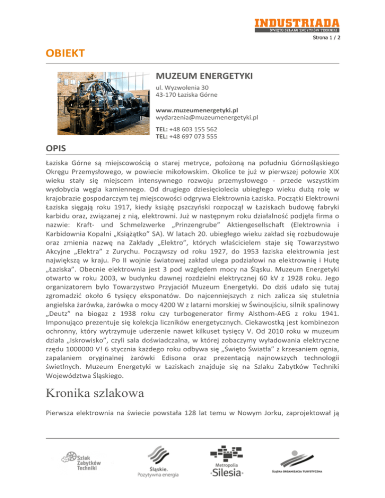 Strona 1 / 2 OBIEKT MUZEUM ENERGETYKI ul. Wyzwolenia 30 43-170 Łaziska Górne www.muzeumenergetyki.pl [email protected] TEL: +48 603 155 562 TEL: +48 697 073 555 OPIS Łaziska Górne są miejscowością o starej metryce, położoną na południu Górnośląskiego Okręgu Przemysłowego, w powiecie mikołowskim. Okolice te już w pierwszej połowie XIX wieku stały się miejscem intensywnego rozwoju przemysłowego - przede wszystkim wydobycia węgla kamiennego. Od drugiego dziesięciolecia ubiegłego wieku dużą rolę w krajobrazie gospodarczym tej miejscowości odgrywa Elektrownia Łaziska. Początki Elektrowni Łaziska sięgają roku 1917, kiedy książę pszczyński rozpoczął w Łaziskach budowę fabryki karbidu oraz, związanej z nią, elektrowni. Już w następnym roku działalność podjęła firma o nazwie: Kraft- und Schmelzwerke „Prinzengrube” Aktiengesellschaft (Elektrownia i Karbidownia Kopalni „Książątko” SA). W latach 20. ubiegłego wieku zakład się rozbudowuje oraz zmienia nazwę na Zakłady „Elektro”, których właścicielem staje się Towarzystwo Akcyjne „Elektra” z Zurychu. Począwszy od roku 1927, do 1953 łaziska elektrownia jest największą w kraju. Po II wojnie światowej zakład ulega podziałowi na elektrownię i Hutę „Łaziska”. Obecnie elektrownia jest 3 pod względem mocy na Śląsku. Muzeum Energetyki otwarto w roku 2003, w budynku dawnej rozdzielni elektrycznej 60 kV z 1928 roku. Jego organizatorem było Towarzystwo Przyjaciół Muzeum Energetyki. Do dziś udało się tutaj zgromadzić około 6 tysięcy eksponatów. Do najcenniejszych z nich zalicza się stuletnia angielska żarówka, żarówka o mocy 4200 W z latarni morskiej w Świnoujściu, silnik spalinowy „Deutz” na biogaz z 1938 roku czy turbogenerator firmy Alsthom-AEG z roku 1941. Imponująco prezentuje się kolekcja liczników energetycznych. Ciekawostką jest kombinezon ochronny, który wytrzymuje uderzenie nawet kilkuset tysięcy V. Od 2010 roku w muzeum działa „Iskrowisko”, czyli sala doświadczalna, w której zobaczymy wyładowania elektryczne rzędu 1000000 V! 6 stycznia każdego roku odbywa się „Święto Światła” z krzesaniem ognia, zapalaniem oryginalnej żarówki Edisona oraz prezentacją najnowszych technologii świetlnych. Muzeum Energetyki w Łaziskach znajduje się na Szlaku Zabytków Techniki Województwa Śląskiego. Kronika szlakowa Pierwsza elektrownia na świecie powstała 128 lat temu w Nowym Jorku, zaprojektował ją Strona 2 / 2 Thomas Edison. Z kolei w Łaziskach Górnych stale funkcjonuje elektrownia powstała 93 lata temu. W procesach produkcji energii elektrycznej w elektrowni wykorzystywane są wszystkie cztery żywioły występujące w naturze. Dzienne zużycie węgla w elektrowni w Łaziskach wynosi ponad 10 000 ton, czyli zawartość kilku składów kolejowych wypełnionych węglem. Do napędzania turbozespołów elektrownia potrzebuje tyle pary, że w ciągu doby musi zagotować i zamienić w parę ponad sto pełnowymiarowych basenów pełnych wody. Warto wspomnieć, że spośród wszystkich miast w Polsce aglomerację katowicką jako jedyną można zauważyć nocą z kosmosu. Wiąże się to z największą liczbą palących się lamp ulicznych. Oferta edukacyjna Zachęcamy do zapoznania się z ofertą zajęć dydaktycznych z chemii na rok szkolny 2014/2015. PROGRAM 11.06.2016 12:00 - 12:30 12:00 - 17:00 12:00 - 17:00 12:00 - 19:00 12:00 - 20:00 12:15 - 13:45 12:15 - 19:15 12:30 - 13:15 12:30 - 14:00 13:00 - 15:00 14:15 - 15:45 14:30 - 15:30 14:30 - 16:00 15:00 - 17:00 15:45 - 16:15 16:15 - 17:45 16:30 - 17:30 16:30 - 18:00 17:00 - 19:00 17:45 - 18:15 18:15 - 19:45 18:30 - 19:15 19:45 - 19:55 20:00 - 20:45 20:55 - 21:05 21:15 - 22:00 22:05 - 22:15 Orkiestra Dęta przy Elektrowni Łaziska – koncert Zabytkowych rowerów – wystawa Rajd i wystawa zabytkowych motocykli. HIT! Elektrowni Łaziska – zwiedzanie Praca nowoczesnej lokomotywy – pokaz RoboKids – warsztaty dla dzieci Muzeum Energetyki – zwiedzanie HIT! Rozprawa sądowa pomiędzy Teslą i Edisonem – przedstawienie Warsztaty z elektroniki Elektryfikacja – warsztat ceramiczny z Bogdanem Kosakiem RoboKids – warsztaty dla dzieci Odkrywcy i twórcy elektryczności w murach Muzeum Energetyki – pokazy i warsztaty Warsztaty z elektroniki Elektryfikacja – warsztat ceramiczny z Bogdanem Kosakiem Warsztaty gry na cewkach Tesli RoboKids – warsztaty dla dzieci Odkrywcy i twórcy elektryczności w murach Muzeum Energetyki – pokazy i warsztaty Warsztaty z elektroniki Elektryfikacja – warsztat ceramiczny z Bogdanem Kosakiem Warsztaty gry na cewkach Tesli RoboKids – warsztaty dla dzieci HIT! Rozprawa sądowa pomiędzy Teslą i Edisonem – przedstawienie Grupa Gromowładni – koncert na cewkach Tesli Coffee Experiment – koncert Grupa Gromowładni – koncert na cewkach Tesli Tom Sawyer – koncert Grupa Gromowładni – koncert na cewkach Tesli