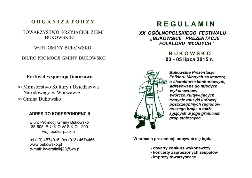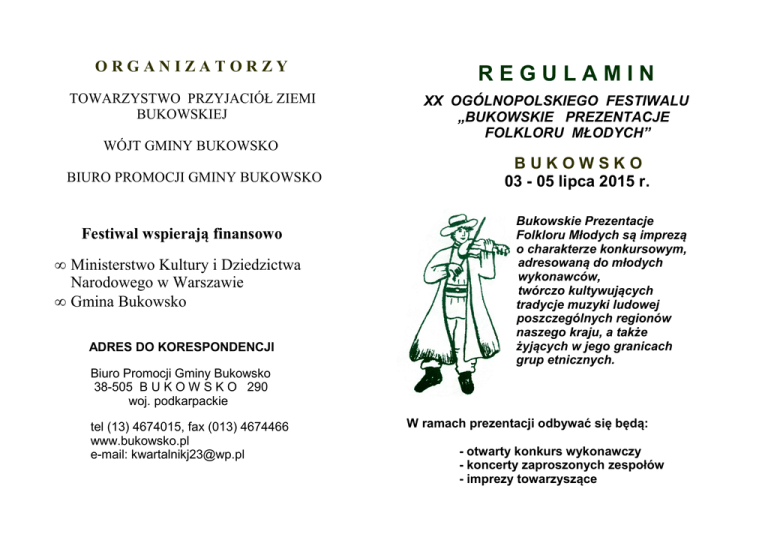 ORGANIZATORZY TOWARZYSTWO PRZYJACIÓŁ ZIEMI BUKOWSKIEJ WÓJT GMINY BUKOWSKO BIURO PROMOCJI GMINY BUKOWSKO Festiwal wspierają finansowo • Ministerstwo Kultury i Dziedzictwa Narodowego w Warszawie • Gmina Bukowsko ADRES DO KORESPONDENCJI REGULAMIN XX OGÓLNOPOLSKIEGO FESTIWALU „BUKOWSKIE PREZENTACJE FOLKLORU MŁODYCH” BUKOWSKO 03 - 05 lipca 2015 r. Bukowskie Prezentacje Folkloru Młodych są imprezą o charakterze konkursowym, adresowaną do młodych wykonawców, twórczo kultywujących tradycje muzyki ludowej poszczególnych regionów naszego kraju, a także żyjących w jego granicach grup etnicznych. Biuro Promocji Gminy Bukowsko 38-505 B U K O W S K O 290 woj. podkarpackie tel (13) 4674015, fax (013) 4674466 www.bukowsko.pl e-mail: [email protected] W ramach prezentacji odbywać się będą: - otwarty konkurs wykonawczy - koncerty zaproszonych zespołów - imprezy towarzyszące I. Celem konkursu jest: aktywizowanie twórczych zainteresowań młodego pokolenia tradycyjną muzyką ludową, podnoszenie poziomu artystycznego sztuki wykonawczej, popularyzacja kultury ludowej w społeczeństwie. II. Uczestnikami konkursu mogą być: 1. Kapele ludowe (do 8 osób): instrumentalne oraz instrumentalno-wokalne, których skład winien być zgodny z wzorami danego regionu. 2. Zespoły śpiewacze (do 10 osób) bez towarzyszenia instrumentalnego. 3. Soliści instrumentaliści, grający na tradycyjnych instrumentach; skrzypce, cymbały, klarnet, fujarka, piszczałki oraz innych lokalnych instrumentach ludowych (z wyłączeniem akordeonu). 4. Soliści śpiewacy (bez towarzyszenia instrumentalnego). 5. Dopuszcza się, aby jeden członek zespołu, kapeli, mógł wystąpić również jako solista. III. Uczestnicy nie mogą przekroczyć 20 roku życia. IV. Kwalifikacje do udziału w konkursie dokonane będą na podstawie karty zgłoszeniowej i płyty CD lub DVD (nie dotyczy uczestników poprzednich edycji festiwalu) przesłanych na adres organizatora, w terminie do 08 czerwca 2015 roku. V. Wybrani przez komisję uczestnicy konkursu, otrzymają zaproszenia oraz szczegółowy harmonogram VI. Do udziału w konkursie zostaną dopuszczone: • kapele i zespoły śpiewacze z programem zawierającym 3 utwory, których łączny czas trwania nie przekroczy 15 minut, • soliści, instrumentaliści i śpiewacy z programem zawierającym 2 utwory, których łączny czas prezentacji nie przekroczy 7 minut. VII. Prezentacje konkursowe oceniać będzie Jury powołane przez organizatorów. Decyzje Jury potwierdzone protokołem, są ostateczne. Jury szczególną uwagę będzie zwracać na: • • • • dobór repertuaru, poziom artystyczny i wykonawczy, strój zgodny z regionem, właściwe cechy gwarowe. VIII. Jury przyzna nagrody i wyróżnienia, a ich wysokość i forma uzależniona będzie od środków zgromadzonych przez organizatorów. IX. Organizatorzy zapewniają bezpłatne; wyżywienie i zakwaterowanie (po uzgodnieniu). Koszty przejazdu i ubezpieczenia, uczestnicy pokrywają we własnym zakresie. Szczegóły zawierać będzie e-mail lub telefon do wybranych uczestników konkursu.