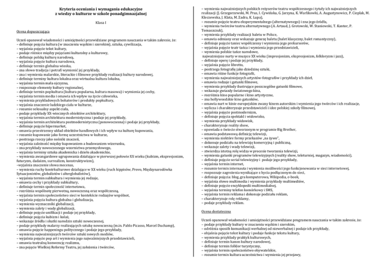 Kryteria oceniania i wymagania edukacyjne z wiedzy o kulturze w szkole ponadgimnazjalnej Klasa I Ocena dopuszczająca Uczeń opanował wiadomości i umiejętności przewidziane programem nauczania w takim zakresie, że: – definiuje pojęcia kultura (w znaczeniu wąskim i szerokim), sztuka, cywilizacja, – wyjaśnia pojęcie tekst kultury, – podaje różnice między pojęciami kulturalny a kulturowy, – definiuje polską kulturę narodową, – wyjaśnia pojęcie kultura narodowa, – definiuje termin globalna wioska, – zna słowo tradycja i potrafi wymienić jej przykłady, – zna i wymienia malarskie, literackie i filmowe przykłady realizacji kultury narodowej, – definiuje terminy kultura lokalna oraz wirtualna kultura lokalna, – wyjaśnia termin mała ojczyzna, – rozpoznaje elementy kultury regionalnej, – definiuje termin popkultura (kultura popularna, kultura masowa) i wymienia jej cechy, – wyjaśnia termin media i omawia ich wpływ na życie człowieka, – wymienia przykładowych bohaterów i produkty popkultury, – wyjaśnia znaczenie ludzkiego ciała w kulturze, – rozumie seksualny aspekt ciała, – podaje przykłady XX-wiecznych obiektów architektury, – wyjaśnia termin architektura modernistyczna i podaje jej przykłady, – wyjaśnia termin architektura postmodernistyczna (ponowoczesna) i podaje jej przykłady, – definiuje pojęcie hipermarket, – omawia przestrzenny układ obiektów handlowych i ich wpływ na kulturę kupowania, – rozumie kupowanie jako formę uczestnictwa w kulturze, – postrzega rzeczy jako nośniki znaczeń, – wyjaśnia zależność między kupowaniem a budowaniem wizerunku, – zna przykłady nowoczesnego wzornictwa przemysłowego, – wyjaśnia terminy sztuka akademicka i dzieło akademickie, – wymienia awangardowe ugrupowania działające w pierwszej połowie XX wieku (kubizm, ekspresjonizm, futuryzm, dadaizm, surrealizm, konstruktywizm), –wyjaśnia znaczenie słowa mecenas, – wymienia ruchy kontrkulturowe działające w XX wieku (ruch hippisów, Provo, Międzynarodówka Sytuacjonistów, globalistów i alterglobalistów), – wyjaśnia termin subkultura i wymienia jej rodzaje, – omawia cechy i przykłady subkultury, – definiuje termin społeczność internetowa, – rozróżnia wspólnotę pierwotną, nowoczesną oraz współczesną, – wyjaśnia termin społeczeństwo sieci w kontekście rodzajów wspólnot, – wyjaśnia pojęcia kultura globalna i globalizacja, – wymienia wyznaczniki globalizacji, – wymienia zalety i wady globalizacji, – definiuje pojęcie unifikacji i podaje jej przykłady, – definiuje pojęcia kubizm i kolaż, – wskazuje źródła i skutki narodzin sztuki nowoczesnej, – podaje przykłady malarzy realizujących sztukę nowoczesną (m.in. Pablo Picasso, Marcel Duchamp), – omawia pojęcie happeningu politycznego i podaje jego przykłady, – wymienia najważniejszych twórców sztuki nowych mediów, – wyjaśnia pojęcie pop art i wymienia jego najważniejszych przedstawicieli, – omawia teatralną konwencję realizmu, – zna pojęcie Wielkiej Reformy Teatru, jej założenia i twórców, – wymienia najważniejszych polskich reżyserów teatru współczesnego i tytuły ich najważniejszych realizacji (J. Grzegorzewski, M. Prus, I. Cywińska, G. Jarzyna, K. Warlikowki, A. Augustynowicz, P. Cieplak, M. Kleczewska, J. Klata, M. Zadra, K. Lupa), – rozumie pojęcie teatru eksperymentalnego (alternatywnego) i zna jego źródła, – wymienia twórców teatru alternatywnego (A. Artaud, J. Grotowski, W. Staniewski, T. Kantor, P. Tomaszczuk), – wymienia przykłady realizacji baletu w Polsce, – omawia odmiany oraz wskazuje genezę baletu (balet klasyczny, balet romantyczny), – definiuje pojęcie taniec współczesny i wymienia jego prekursorów, – wyjaśnia pojęcie teatr tańca i wymienia jego przedstawicieli, – wymienia polskie tańce narodowe, najważniejsze nurty w muzyce XX wieku (impresjonizm, ekspresjonizm, folkloryzm i jazz), – definiuje operę i podaje jej przykłady, – wyjaśnia pojęcie libretto, – postrzega fotografię jako dziedzinę sztuki, – omawia różne funkcje fotografii, – wymienia najważniejszych artystów-fotografów i przykłady ich dzieł, – omawia rodzaje i gatunki filmowe, – wymienia przykłady ilustrujące poszczególne gatunki filmowe, – wskazuje gwiazdy światowego kina, – rozróżnia kino popularne i kino artystyczne, – zna hollywoodzkie kino gatunków, – omawia nurt w kinie europejskim zwany kinem autorskim i wymienia jego twórców i ich realizacje, – wylicza i charakteryzuje przedstawicieli i idee polskiej szkoły filmowej, – wyjaśnia pojęcie postmodernizm, – definiuje pojęcia spektakl i widowisko, – wymienia przykłady widowisk, – charakteryzuje reality show, – opowiada o świecie stworzonym w programie Big Brother, – omawia podstawową definicję telewizji, – wymienia niektóre formy przekazów „na żywo”, – dokonuje podziału na telewizję komercyjną i publiczną, – wskazuje zalety i wady telewizji, – stwierdza istotną rolę widza w procesie tworzenia telewizji, – wymienia gatunki programów telewizyjnych (reality show, teleturniej, magazyn, wiadomości), – definiuje pojęcie serial telewizyjny i podaje jego przykłady, – wyjaśnia termin internet, – rozumie termin internauta i wymienia możliwości jego funkcjonowania w sieci internetowej, – rozpoznaje zagrożenia wynikające z bycia podłączonym do sieci, – definiuje pojęcia: blog, gra komputerowa, Wikipedia, e-book, – wyjaśnia słowo multimedia i wymienia przykłady multimediów, – definiuje pojęcie encyklopedii multimedialnej, – wyjaśnia terminy telefon komórkowy i SMS, – wyjaśnia termin reklama i dokonuje podziału reklam, – charakteryzuje rolę reklamy, – podaje przykłady reklam. Ocena dostateczna Uczeń opanował wiadomości i umiejętności przewidziane programem nauczania w takim zakresie, ż