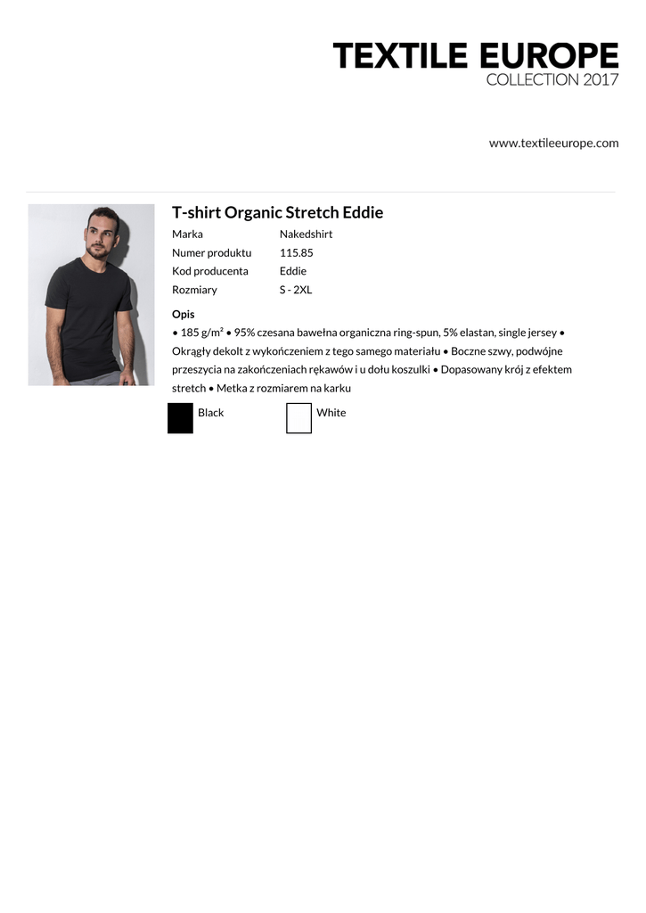 T-shirt Organic Stretch Eddie Marka Nakedshirt Numer produktu 115.85 Kod producenta Eddie Rozmiary S - 2XL Opis • 185 g/m² • 95% czesana bawełna organiczna ring-spun, 5% elastan, single jersey • Okrągły dekolt z wykończeniem z tego samego materiału • Boczne szwy, podwójne przeszycia na zakończeniach rękawów i u dołu koszulki • Dopasowany krój z efektem stretch • Metka z rozmiarem na karku Black White