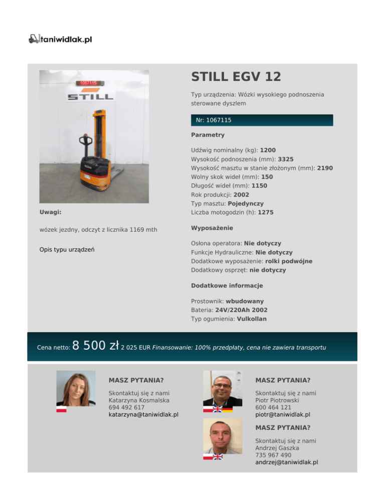 STILL EGV 12 Typ urządzenia: Wózki wysokiego podnoszenia sterowane dyszlem Nr: 1067115 Parametry Udźwig nominalny (kg): 1200 Wysokość podnoszenia (mm): 3325 Wysokość masztu w stanie złożonym (mm): 2190 Wolny skok wideł (mm): 150 Długość wideł (mm): 1150 Rok produkcji: 2002 Typ masztu: Pojedynczy Uwagi: Liczba motogodzin (h): 1275 wózek jezdny, odczyt z licznika 1169 mth Wyposażenie Osłona operatora: Nie dotyczy Opis typu urządzeń Funkcje Hydrauliczne: Nie dotyczy Dodatkowe wyposażenie: rolki podwójne Dodatkowy osprzęt: nie dotyczy Dodatkowe informacje Prostownik: wbudowany Bateria: 24V/220Ah 2002 Typ ogumienia: Vulkollan Cena netto: 8 500 zł 2 025 EUR Finansowanie: 100% przedpłaty, cena nie zawiera transportu MASZ PYTANIA? MASZ PYTANIA? Skontaktuj się z nami Katarzyna Kosmalska 694 492 617 [email protected] Skontaktuj się z nami Piotr Piotrowski 600 464 121 [email protected] MASZ PYTANIA? Skontaktuj się z nami Andrzej Gaszka 735 967 490 [email protected]