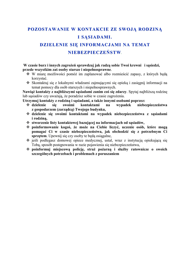 POZOSTAWANIE W KONTAKCIE ZE SWOJĄ RODZINĄ I SĄSIADAMI. DZIELENIE SIĘ INFORMACJAMI NA TEMAT NIEBEZPIEC ZEŃSTW. W czasie burz i innych zagrożeń sprawdzaj jak radzą sobie Twoi krewni i sąsiedzi, przede wszystkim zaś osoby starsze i niepełnosprawne. W miarę możliwości pomóż im zaplanować albo rozmieścić zapasy, z których będą korzystać. Skontaktuj się z lokalnymi władzami zajmującymi się opieką i zasięgnij informacji na temat pomocy dla osób starszych i niepełnosprawnych. Nawiąż kontakty z najbliższymi sąsiadami zanim coś się zdarzy. Spytaj najbliższą rodzinę lub sąsiadów czy uważają, że poradzisz sobie w czasie zagrożenia. Utrzymuj kontakty z rodziną i sąsiadami, a także innymi osobami poprzez: dzielenie się swoimi kontaktami na wypadek niebezpieczeństwa z gospodarzem (zarządcą) Twojego budynku, dzielenie się swoimi kontaktami na wypadek niebezpieczeństwa z sąsiadami i rodziną, stworzenie listy kontaktowej bazującej na informacjach od sąsiadów, poinformowanie kogoś, że może na Ciebie liczyć, uczenie osób, które mogą pomagać Ci w czasie niebezpieczeństwa, jak obchodzić się z potrzebnym Ci sprzętem. Upewnij się czy osoby te będą osiągalne, jeśli podlegasz domowej opiece medycznej, ustal, wraz z instytucją opiekującą się Tobą, sposób postępowania w razie pojawienia się niebezpieczeństwa, poinformuj miejscową policję, straż pożarną i służby ratownicze o swoich szczególnych potrzebach i problemach z poruszaniem