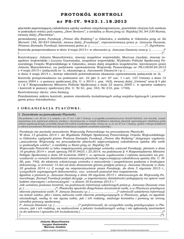 PROTOKÓŁ KONTROLI n r P S - I V . 9 4 2 3 . 1 . 1 8 .2013 placówki zapewniającej całodobową opiekę osobom niepełnosprawnym, przewlekle chorym lub osobom w podeszłym wieku pod nazwą „Dom Seniora”, z siedzibą w Rumi przy ul. Rajskiej 50, 84-230 Rumia, zwanej dalej „Placówką”, prowadzonej przez Fundację „Pomoc dla Rodziny” w Gdańsku, z siedzibą w Gdańsku przy ul. Za Murami 19A, 80-823 Gdańsk, zwaną dalej „Fundacją”, reprezentowaną przez p. Janusza Daszutę, Prezesa Zarządu Fundacji, kierowanej przez p. […………………………………………..…..]*, Dyrektora. Kontrolę przeprowadzono w dniu 6 maja 2015 r. w obecności p. Janusza Daszuty oraz p. [……….…]* [……………………………………………………………………………………………………………………….…]*. Kontrolujący: Jolanta Mazurkiewicz, starszy inspektor wojewódzki, Mariusz Jandzio, starszy inspektor wojewódzki i Lucyna Gostomska, inspektor wojewódzki, Wydziału Polityki Społecznej Pomorskiego Urzędu Wojewódzkiego w Gdańsku, zwani dalej zespołem inspektorów, kierowanym przez Jolantę Mazurkiewicz, na podstawie upoważnienia Wojewody Pomorskiego nr PS-I.0030.84.2015 z 4 maja 2015 r. (załącznik nr 1), okazanego p. Januszowi Daszucie i p. [……………………………..…]* w dniu 4 maja 2015 r., którzy odmówili poświadczenia okazania upoważnienia (załącznik nr 2). Kontrolę przeprowadzono na podstawie art. 22 pkt 3, art. 67 ust. 1 i art. 127 Ustawy z dnia 12 marca 2004 r. o pomocy społecznej (Dz. U. z 2015 r. poz. 163), zwanej dalej „Ustawą” oraz § 4 pkt 3 i § 7 Rozporządzenia Ministra Polityki Społecznej z dnia 23 marca 2005 r. w sprawie nadzoru i kontroli w pomocy społecznej (Dz. U. Nr 61, poz. 543, Nr 210, poz. 1750). Kontrolowany okres: stan bieżący. Przedmiotowy zakres kontroli: poziom standardu świadczonych usług socjalno-bytowych i przestrzeganie praw mieszkańców. I ORGANIZACJA PLACÓWKI. 1. Zezwolenie na prowadzenie Placówki. (Na podstawie z art. 69 ust. 1 w związku z art. 57 ust. 1 pkt 2 Ustawy, w przypadku prowadzenia przez Kościół Katolicki, inne kościoły, związki wyznaniowe oraz organizacje społeczne, fundacje i stowarzyszenia, w ramach działalności statutowej, placówek zapewniających całodobową opiekę osobom niepełnosprawnym, przewlekle chorym lub osobom w podeszłym wieku, stosuje się, m. in. art. 67 ust. 1 Ustawy, zgodnie z którym działalność w zakresie prowadzenia Placówki może być prowadzona po uzyskaniu zezwolenia wojewody.) Fundacja nie posiada zezwolenia Wojewody Pomorskiego na prowadzenie Placówki. W dniu 15 grudnia 2014 r. do Wydziału Polityki Społecznej Pomorskiego Urzędu Wojewódzkiego w Gdańsku wpłynęło pismo Prezesa Zarządu Fundacji „Pomoc dla Rodziny” dotyczące wydania „zezwolenia Wojewody na prowadzenie placówki zapewniającej całodobową opiekę dla osób w podeszłym wieku”, z siedzibą w Rumi przy ul. Rajskiej 50. Wojewoda Pomorski w toku rozpatrywania powyższego wniosku wezwał Fundację, pismem z dnia 16 grudnia 2014 r. znak sprawy PS-IV.9423.1.25.2014, na podstawie § 4 Rozporządzenia Ministra Polityki Społecznej z dnia 28 kwietnia 2005 r. w sprawie wydawania i cofania zezwoleń na prowadzenie w ramach działalności statutowej placówki zapewniającej całodobową opiekę (Dz. U. Nr 86, poz. 740), do złożenia właściwego wniosku o zezwolenie i uzupełnienia podania o brakujące dokumenty, w terminie 14 dni od dnia doręczenia (pismo podjęte przez p. Janusza Daszutę w dniu 22 grudnia 2014 r.). Z uwagi na nieprzestawienie przez Fundację, do dnia 5 stycznia 2015 r., wszystkich wymaganych dokumentów, ww. wniosek pozostał bez rozpatrzenia. Zgodnie z pismem p. Janusza Daszuty z dnia 28 stycznia 2015 r. skierowanym do Wojewody Pomorskiego, Zarząd Fundacji podjął decyzję „o zaprzestaniu działalności polegającej na opiece nad ludźmi starszymi i schorowanymi – z dniem 30 kwietnia 2015 r.”. Jak ustalono podczas kontroli, na podstawie informacji udzielonych przez p. Janusza Daszutę oraz p. [………………….………]*, Placówkę opuściło dotychczas dwanaście osób, a w Placówce przebywa obecnie piętnaście osób. P. Janusz Daszuta i p. […………………..….]* odmówili udzielenia informacji na temat wieku, płci i stanu zdrowia osób obecnie przebywających w Placówce, gdyż, co zgodnie oświadczyli, osoby te nie życzą sobie, jak i ich rodziny, żadnego kontaktu i pomocy ze strony ośrodka pomocy społecznej. P. Janusz Daszuta i p. [………………..….]* poinformowali, że wszystkie osoby przebywające w Placówce, jak i ich rodziny, są zadowolone z jakości świadczonych usług i nie zgłaszały zastrzeżeń co do zakresu i sposobu ich świadczenia […………………………………………………………...……..….]* […………………………………………………………………………………………………………………....….]*). Jolanta Mazurkiewicz Lucyna Gostomska Mariusz Jandzio ---------------------------------------------------------------------- podpisy zespołu inspektorów podpis kierownika kontrolowanej placówki 1 Protokół nr PS-IV.9423.1.18.2013 z przeprowadzonej w dniu 6 maja 2015 r. kontroli standardu świadczonych usług przez placówkę zapewniającą całodobową opiekę osobom niepełnosprawnym, przewlekle chorym lub osobom w podeszłym wieku pod nazwą „Dom Seniora”, z siedzibą Rumi przy ul. Rajskiej 50, 84-230 Rumia. 1. Zezwolenie na prowadzenie Placówki. (Na podstawie z art. 69 ust. 1 w związku z art. 57 ust. 1 pkt 2 Ustawy, w przypadku prowadzenia przez Kościół Katolicki, inne kościoły, związki wyznaniowe oraz organizacje społeczne, fundacje i stowarzyszenia, w ramach działalności statutowej, placówek zapewniających całodobową opiekę osobom niepełnosprawnym, przewlekle chorym lub osobom w pode