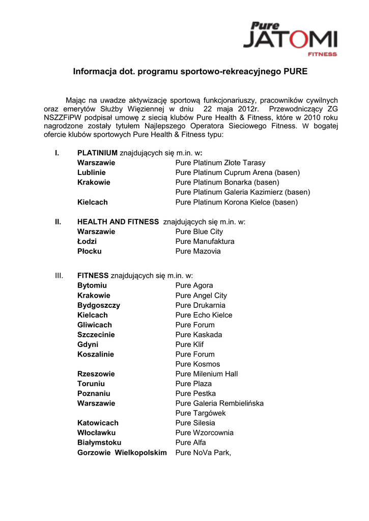 Informacja dot. programu sportowo-rekreacyjnego PURE Mając na uwadze aktywizację sportową funkcjonariuszy, pracowników cywilnych oraz emerytów Służby Więziennej w dniu 22 maja 2012r. Przewodniczący ZG NSZZFiPW podpisał umowę z siecią klubów Pure Health & Fitness, które w 2010 roku nagrodzone zostały tytułem Najlepszego Operatora Sieciowego Fitness. W bogatej ofercie klubów sportowych Pure Health & Fitness typu: I. PLATINIUM znajdujących się m.in. w: Warszawie Pure Platinum Złote Tarasy Lublinie Pure Platinum Cuprum Arena (basen) Krakowie Pure Platinum Bonarka (basen) Pure Platinum Galeria Kazimierz (basen) Kielcach Pure Platinum Korona Kielce (basen) II. HEALTH AND FITNESS znajdujących się m.in. w: Warszawie Pure Blue City Łodzi Pure Manufaktura Płocku Pure Mazovia III. FITNESS znajdujących się m.in. w: Bytomiu Pure Agora Krakowie Pure Angel City Bydgoszczy Pure Drukarnia Kielcach Pure Echo Kielce Gliwicach Pure Forum Szczecinie Pure Kaskada Gdyni Pure Klif Koszalinie Pure Forum Pure Kosmos Rzeszowie Pure Milenium Hall Toruniu Pure Plaza Poznaniu Pure Pestka Warszawie Pure Galeria Rembielińska Pure Targówek Katowicach Pure Silesia Włocławku Pure Wzorcownia Białymstoku Pure Alfa Gorzowie Wielkopolskim Pure NoVa Park, istnieje możliwość skorzystania z szerokiego zakresu nowoczesnego sprzętu do ćwiczeń siłowych, treningu cardio oraz nielimitowanej ilości zajęć sportowych stanowiących najnowsze formy ogólnodostępnych zajęć grupowych prowadzonych przez wykwalifikowaną kadrę trenerską. Poza tym istnieje także sposobność skorzystania z: kafejki internetowej, kawiarni, sauny fińskiej i pomieszczeń relaksacyjnych, bezpłatnej wypożyczalnie filmów DVD, Wi Fi, solarium, basenów (dot. wybranych obiektów typu Platinium), spotkań eventowych dla klubowiczów. Kwestie organizacyjne dot. przystąpienia do programu sportowo-rekreacyjnego PURE: osoby zainteresowane przystąpieniem do programu sportowo-rekreacyjnego PURE, winny złożyć w kadrach jednostki macierzystej stosowane oświadczenie (druk w zał.) będące jednocześnie deklaracją zgłoszeniową do programu. Kwestie dokonywania płatności za przynależność do programu PURE: środki finansowe wynikające z potrąceń dokonywanych na podstawie złożonych oświadczeń, będą w cyklu miesięcznym przekazywane na konto: Zarządu Głównego Niezależnego Samorządnego Związku Zawodowego Funkcjonariuszy i Pracowników Więziennictwa 02-520 Warszawa, ul. Wiśniowa 50, Nr rachunku bankowego: 20 1020 1068 0000 1902 0167 7954 PKO BP Oddz. 6 w Warszawie w przypadku emerytów Służby Więziennej brak wpływu środków finansowych na konto ZG NSZZFiPW, w terminie do 12 każdego miesiąca (poprzedzającego nowy okres rozliczeniowy) będzie podstawą do skreślenia z listy osób korzystających z pakietu Pure, przy pierwszej wizycie w Klubie wyrabiana będzie karta członkowska, za którą pobrana zostanie jednorazowa opłata depozytowa w wysokości 15 złotych, imienne karty osób przystępujących do programu Pure Health & Fitness, będą dostępne w obiekcie sportowym wskazanym do odbioru przez przystępującego do programu Pure, anulowanie członkostwa będzie możliwe przy zachowaniu jednomiesięcznego okresu wypowiedzenia. Dopuszcza się możliwość przeniesienia członkostwa na inne osoby. Aktualny cennik za korzystanie z pakietu sportowo-rekreacyjnego PURE: Klub Cena za osobę Białystok - Alfa 89 zł. Bydgoszcz - Drukarnia 59 zł. Bytom - Agora 79 zł. Gdynia - Klif 99 zł. Gdynia - Szperk 99 zł. Gliwice - Forum 89 zł. Gorzów Wlkp- Nova Park 79 zł. Katowice - Silesia 99 zł. Kielce - Echo 89 zł. Kielce - Korona 125 zł. Koszalin - Atrium 79 zł. Koszalin - Kosmos 79 zł. Kraków - Angel City 99 zł. Kraków - Bonarka 125 zł. Kraków - Galeria Kazimierz 125 zł. Lubin - Cuprum Arena 150 zł. Lublin - Lublin Plaza 99 zł. Łódź - Manufaktura 125 zł. Płock - Mazovia 79 zł. Płock - Mosty 79 zł. Poznań - Malta 99 zł. Poznań - Pestka 99 zł. Rzeszów - Millenium Hall 89 zł. Szczecin - Kaskada 99 zł. Toruń - Plaza 99 zł. Warszawa - Blue City 125 zł. Warszawa - Galeria Rembielińska 99 zł. Warszawa - Promenada 110 zł. Warszawa - Sadyba Best Mall 110 zł. Warszawa - Targówek 99 zł. Warszawa - Złote Tarasy 160 zł. Warszawa - Zodiak 150 zł Włocławek - Wzorcownia 89 zł. Wrocław - Pasaż Grunwaldzki 99 zł. Wrocław - Renoma 99 zł. Bliższych informacji udzielają służby kadrowe w jednostkach macierzystych.