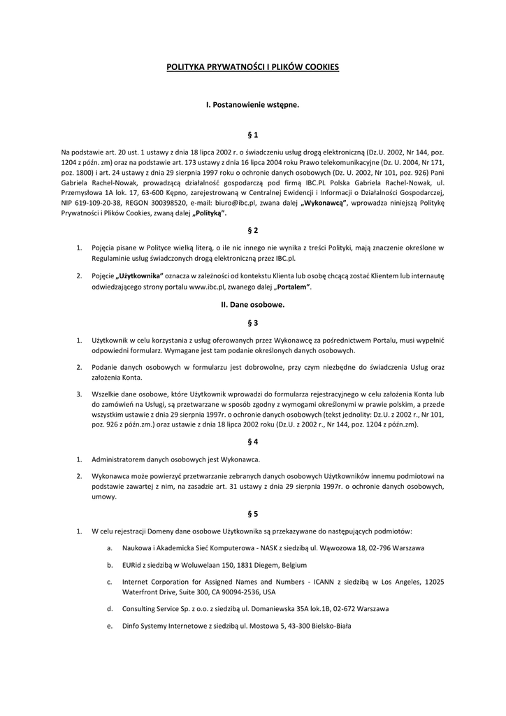 POLITYKA PRYWATNOŚCI I PLIKÓW COOKIES I. Postanowienie wstępne. §1 Na podstawie art. 20 ust. 1 ustawy z dnia 18 lipca 2002 r. o świadczeniu usług drogą elektroniczną (Dz.U. 2002, Nr 144, poz. 1204 z późn. zm) oraz na podstawie art. 173 ustawy z dnia 16 lipca 2004 roku Prawo telekomunikacyjne (Dz. U. 2004, Nr 171, poz. 1800) i art. 24 ustawy z dnia 29 sierpnia 1997 roku o ochronie danych osobowych (Dz. U. 2002, Nr 101, poz. 926) Pani Gabriela Rachel-Nowak, prowadzącą działalność gospodarczą pod firmą IBC.PL Polska Gabriela Rachel-Nowak, ul. Przemysłowa 1A lok. 17, 63-600 Kępno, zarejestrowaną w Centralnej Ewidencji i Informacji o Działalności Gospodarczej, NIP 619-109-20-38, REGON 300398520, e-mail: [email protected], zwana dalej „Wykonawcą”, wprowadza niniejszą Politykę Prywatności i Plików Cookies, zwaną dalej „Polityką”. §2 1. Pojęcia pisane w Polityce wielką literą, o ile nic innego nie wynika z treści Polityki, mają znaczenie określone w Regulaminie usług świadczonych drogą elektroniczną przez IBC.pl. 2. Pojęcie „Użytkownika” oznacza w zależności od kontekstu Klienta lub osobę chcącą zostać Klientem lub internautę odwiedzającego strony portalu www.ibc.pl, zwanego dalej „Portalem”. II. Dane osobowe. §3 1. Użytkownik w celu korzystania z usług oferowanych przez Wykonawcę za pośrednictwem Portalu, musi wypełnić odpowiedni formularz. Wymagane jest tam podanie określonych danych osobowych. 2. Podanie danych osobowych w formularzu jest dobrowolne, przy czym niezbędne do świadczenia Usług oraz założenia Konta. 3. Wszelkie dane osobowe, które Użytkownik wprowadzi do formularza rejestracyjnego w celu założenia Konta lub do zamówień na Usługi, są przetwarzane w sposób zgodny z wymogami określonymi w prawie polskim, a przede wszystkim ustawie z dnia 29 sierpnia 1997r. o ochronie danych osobowych (tekst jednolity: Dz.U. z 2002 r., Nr 101, poz. 926 z późn.zm.) oraz ustawie z dnia 18 lipca 2002 roku (Dz.U. z 2002 r., Nr 144, poz. 1204 z późn.zm). §4 1. Administratorem danych osobowych jest Wykonawca. 2. Wykonawca może powierzyć przetwarzanie zebranych danych osobowych Użytkowników innemu podmiotowi na podstawie zawartej z nim, na zasadzie art. 31 ustawy z dnia 29 sierpnia 1997r. o ochronie danych osobowych, umowy. §5 1. W celu rejestracji Domeny dane osobowe Użytkownika są przekazywane do następujących podmiotów: a. Naukowa i Akademicka Sieć Komputerowa - NASK z siedzibą ul. Wąwozowa 18, 02-796 Warszawa b. EURid z siedzibą w Woluwelaan 150, 1831 Diegem, Belgium c. Internet Corporation for Assigned Names and Numbers - ICANN z siedzibą w Los Angeles, 12025 Waterfront Drive, Suite 300, CA 90094-2536, USA d. Consulting Service Sp. z o.o. z siedzibą ul. Domaniewska 35A lok.1B, 02-672 Warszawa e. Dinfo Systemy Internetowe z siedzibą ul. Mostowa 5, 43-300 Bielsko-Biała 2. Z uwagi na wymogi Rejestratorów, wskazanych w postanowieniu ustępu powyższego oraz zgodnie z zasadami rejestracji Domen i z zastrzeżeniem zdania drugiego niniejszego ustępu, rejestracja Domeny przez Użytkownika jest związana z przekazaniem jego danych osobowych do bazy WHOIS. W przypadku Domen polskich, umieszczenie danych osobowych osoby fizycznej w bazie WHOIS NASK, nastąpić może wyłącznie za jej zgodą, która może być wyrażona w czasie rejestracji Domeny lub po jej zarejestrowaniu. 3. W celu uzyskania Certyfikatu SSL dane osobowe są przekazywane do następujących podmiotów: a. GeoTrust, Inc. z siedzibą 350 Ellis Street, Mountain View, CA 94043-2202, USA b. Certum - Powszechne Centrum Certyfikacji z siedzibą ul. Bajeczna 13, 71-838 Szczecin c. Trustico z siedzibą Rapeed House 106 Lower Addiscombe Road Croydon, Surrey, CR0 6AD, United Kingdom §6 Użytkownik ma prawo dostępu do swoich danych osobowych i może dokonać ich weryfikacji lub poprawienia, a także usunięcia, poprzez skierowanie odpowiedniego żądania do Wykonawcy. §7 1. Wykonawca przetwarza dane osobowe Użytkowników i wykorzystuje je w zakresie i w celu niezbędnym do realizacji Usług oraz prowadzenia Konta. 2. Na podstawie dodatkowej i opcjonalnej zgody, którą Użytkownik może wyrazić w osobnym oświadczeniu, Wykonawca może przetwarzać dane osobowe Użytkowników w celach marketingowych. Jeżeli Użytkownik udzieli takiej zgody, to może ją następnie w każdej chwili odwołać. §8 Na podstawie dodatkowej i opcjonalnej zgody, którą Użytkownik może wyrazić w osobnym oświadczeniu, Wykonawca może wysyłać do Użytkownika na podane adresy e-mail informacje handlowe. Zgoda, o której mowa w zdaniu poprzedzającym może zostać w każdej chwili odwołana przez Użytkownika. §9 Dane osobowe zebrane przez Wykonawcę mogą zostać przekazane upoważnionym, na podstawie obowiązujących przepisów prawa, organom państwowym. III. Pliki cookies. § 10 1. Wykonawca wykorzystuje pliki cookies (ciasteczka), czyli niewielkie informacje tekstowe, przechowywane na urządzeniu końcowym Użytkownika (np. komputerze, tablecie, smartfonie). Cookies mogą być odczytywane przez system teleinformatyczny Wykonawcy. 2. Wykonawca przechowuje pliki cookies na urządzeniu końcowym Użytkownika, a następnie uzyskuje dostęp do informacji w nich zawartych w celach: statystycznych oraz zapewnienia prawidłowego działania Portalu, a w szczególności utrzymania sesji po zalogowaniu. § 11 1. Wykonawca informuje także Użytkowników, że istnieje możliwość takiej konfiguracji przeglądarki internetowej, która uniemożliwia przechowywanie plików cookies na urządzeniu końcowym Użytkownika. 2. Wykonawca wskazuje także, że pliki cookies mogą być przez Użytkownika usunięte po ich zapisaniu przez Wykonawcę, poprzez: odpowiednie funkcje przeglądarki internetowej, programy służące w tym celu lub skorzystanie z odpowiednich narzędzi dostępnych w ramach systemu operacyjnego, z którego korzysta Użytkownik. 3. Pod tymi linkami zamiesz