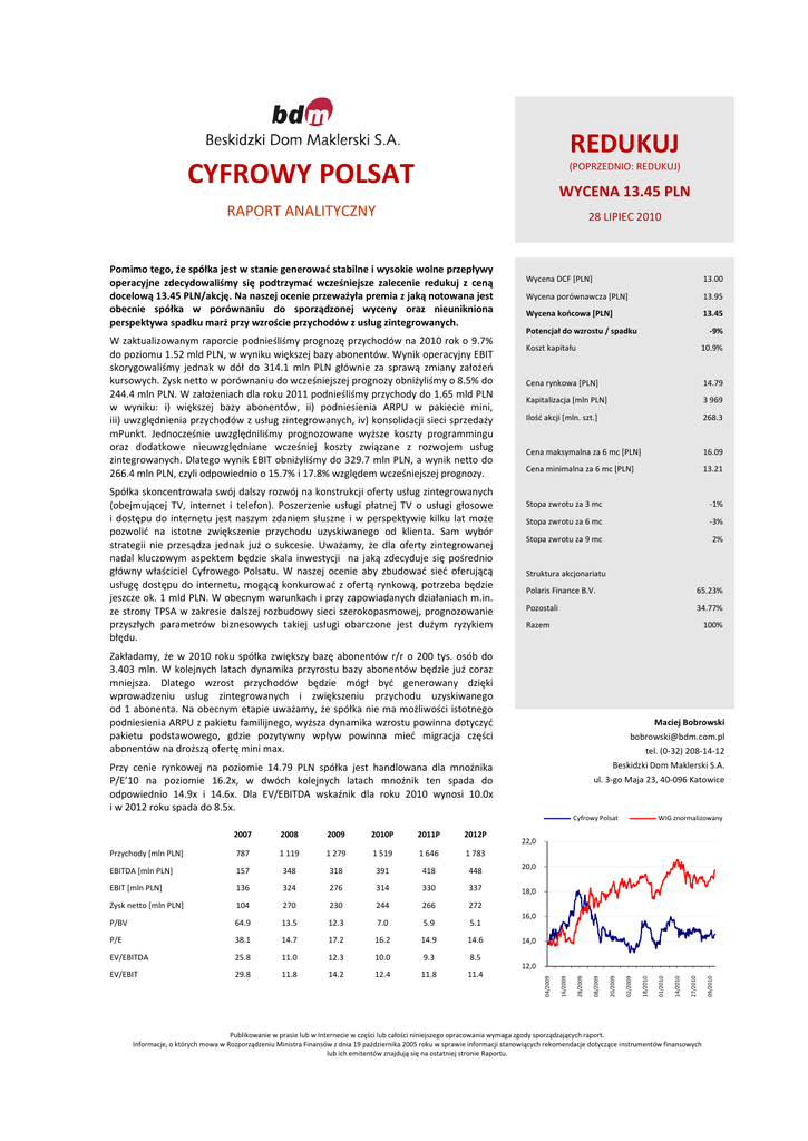 REDUKUJ CYFROWY POLSAT (POPRZEDNIO: REDUKUJ) WYCENA 13.45 PLN RAPORT ANALITYCZNY 28 LIPIEC 2010 Pomimo tego, że spółka jest w stanie generować stabilne i wysokie wolne przepływy operacyjne zdecydowaliśmy się podtrzymać wcześniejsze zalecenie redukuj z ceną docelową 13.45 PLN/akcję. Na naszej ocenie przeważyła premia z jaką notowana jest obecnie spółka w porównaniu do sporządzonej wyceny oraz nieunikniona perspektywa spadku marż przy wzroście przychodów z usług zintegrowanych. W zaktualizowanym raporcie podnieśliśmy prognozę przychodów na 2010 rok o 9.7% do poziomu 1.52 mld PLN, w wyniku większej bazy abonentów. Wynik operacyjny EBIT skorygowaliśmy jednak w dół do 314.1 mln PLN głównie za sprawą zmiany założeń kursowych. Zysk netto w porównaniu do wcześniejszej prognozy obniżyliśmy o 8.5% do 244.4 mln PLN. W założeniach dla roku 2011 podnieśliśmy przychody do 1.65 mld PLN w wyniku: i) większej bazy abonentów, ii) podniesienia ARPU w pakiecie mini, iii) uwzględnienia przychodów z usług zintegrowanych, iv) konsolidacji sieci sprzedaży mPunkt. Jednocześnie uwzględniliśmy prognozowane wyższe koszty programmingu oraz dodatkowe nieuwzględniane wcześniej koszty związane z rozwojem usług zintegrowanych. Dlatego wynik EBIT obniżyliśmy do 329.7 mln PLN, a wynik netto do 266.4 mln PLN, czyli odpowiednio o 15.7% i 17.8% względem wcześniejszej prognozy. Spółka skoncentrowała swój dalszy rozwój na konstrukcji oferty usług zintegrowanych (obejmującej TV, internet i telefon). Poszerzenie usługi płatnej TV o usługi głosowe i dostępu do internetu jest naszym zdaniem słuszne i w perspektywie kilku lat może pozwolić na istotne zwiększenie przychodu uzyskiwanego od klienta. Sam wybór strategii nie przesądza jednak już o sukcesie. Uważamy, że dla oferty zintegrowanej nadal kluczowym aspektem będzie skala inwestycji na jaką zdecyduje się pośrednio główny właściciel Cyfrowego Polsatu. W naszej ocenie aby zbudować sieć oferującą usługę dostępu do internetu, mogącą konkurować z ofertą rynkową, potrzeba będzie jeszcze ok. 1 mld PLN. W obecnym warunkach i przy zapowiadanych działaniach m.in. ze strony TPSA w zakresie dalszej rozbudowy sieci szerokopasmowej, prognozowanie przyszłych parametrów biznesowych takiej usługi obarczone jest dużym ryzykiem błędu. Wycena DCF [PLN] 13.00 Wycena porównawcza [PLN] 13.95 Wycena końcowa [PLN] 13.45 Potencjał do wzrostu / spadku -9% Koszt kapitału 10.9% Cena rynkowa [PLN] 14.79 Kapitalizacja [mln PLN] 3 969 Ilość akcji [mln. szt.] 268.3 Cena maksymalna za 6 mc [PLN] 16.09 Cena minimalna za 6 mc [PLN] 13.21 Stopa zwrotu za 3 mc -1% Stopa zwrotu za 6 mc -3% Stopa zwrotu za 9 mc 2% Struktura akcjonariatu Polaris Finance B.V. 65.23% Pozostali 34.77% Razem 100% Zakładamy, że w 2010 roku spółka zwiększy bazę abonentów r/r o 200 tys. osób do 3.403 mln. W kolejnych latach dynamika przyrostu bazy abonentów będzie już coraz mniejsza. Dlatego wzrost przychodów będzie mógł być generowany dzięki wprowadzeniu usług zintegrowanych i zwiększeniu przychodu uzyskiwanego od 1 abonenta. Na obecnym etapie uważamy, że spółka nie ma możliwości istotnego podniesienia ARPU z pakietu familijnego, wyższa dynamika wzrostu powinna dotyczyć pakietu podstawowego, gdzie pozytywny wpływ powinna mieć migracja części abonentów na droższą ofertę mini max. Maciej Bobrowski [email protected] tel. (0-32) 208-14-12 Beskidzki Dom Maklerski S.A. Przy cenie rynkowej na poziomie 14.79 PLN spółka jest handlowana dla mnożnika P/E’10 na poziomie 16.2x, w dwóch kolejnych latach mnożnik ten spada do odpowiednio 14.9x i 14.6x. Dla EV/EBITDA wskaźnik dla roku 2010 wynosi 10.0x i w 2012 roku spada do 8.5x. ul. 3-go Maja 23, 40-096 Katowice Cyfrowy Polsat 2007 2008 2009 2010P 2011P 2012P Przychody [mln PLN] 787 1 119 1 279 1 519 1 646 1 783 EBITDA [mln PLN] 157 348 318 391 418 448 EBIT [mln PLN] 136 324 276 314 330 337 Zysk netto [mln PLN] 104 270 230 244 266 272 P/BV 64.9 13.5 12.3 7.0 5.9 5.1 P/E 38.1 14.7 17.2 16.2 14.9 14.6 EV/EBITDA 25.8 11.0 12.3 10.0 9.3 8.5 EV/EBIT 29.8 11.8 14.2 12.4 11.8 11.4 WIG znormalizowany 22,0 20,0 18,0 16,0 14,0 Publikowanie w prasie lub w Internecie w części lub całości niniejszego opracowania wymaga zgody sporządzających raport. Informacje, o których mowa w Rozporządzeniu Ministra Finansów z dnia 19 października 2005 roku w sprawie informacji stanowiących rekomendacje dotyczące instrumentów finansowych lub ich emitentów znajdują się na ostatniej stronie Raportu. 07/09/2010 05/27/2010 04/14/2010 03/01/2010 01/18/2010 12/02/2009 10/20/2009 09/08/2009 07/28/2009 06/16/2009 05/04/2009 12,0 SPIS TREŚCI WYCENA I PODSUMOWANIE ............................................................................................................3 WYCENA DCF ....................................................................................................................................4 WYCENA PORÓWNAWCZA ...............................................................................................................7 WYNIKI FINANSOWE ZA 1Q’10 .........................................................................................................8 ZMIANY W PROGNOZIE WYNIKÓW ................................................................................................10 PROGNOZA WYNIKÓW ...................................................................................................................11 ROZWÓJ OFERTY USŁUG ZINTEGROWANYCH ................................................................................13 WZROST WARTOŚCI ZESTAWÓW ODBIORCZYCH I STOPNIOWA ZMIANA STRUKTURY KOSZTÓW RODZAJOWYCH ..............................................................................................................................14 DANE FINANSOWE I WSKAŹNIKI RYNKOWE ...................................................................