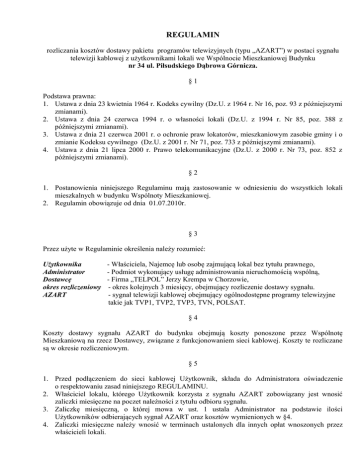 REGULAMIN rozliczania kosztów dostawy pakietu programów telewizyjnych (typu „AZART”) w postaci sygnału telewizji kablowej z użytkownikami lokali we Wspólnocie Mieszkaniowej Budynku nr 34 ul. Piłsudskiego Dąbrowa Górnicza. §1 Podstawa prawna: 1. Ustawa z dnia 23 kwietnia 1964 r. Kodeks cywilny (Dz.U. z 1964 r. Nr 16, poz. 93 z późniejszymi zmianami). 2. Ustawa z dnia 24 czerwca 1994 r. o własności lokali (Dz.U. z 1994 r. Nr 85, poz. 388 z późniejszymi zmianami). 3. Ustawa z dnia 21 czerwca 2001 r. o ochronie praw lokatorów, mieszkaniowym zasobie gminy i o zmianie Kodeksu cywilnego (Dz.U. z 2001 r. Nr 71, poz. 733 z późniejszymi zmianami). 4. Ustawa z dnia 21 lipca 2000 r. Prawo telekomunikacyjne (Dz.U. z 2000 r. Nr 73, poz. 852 z późniejszymi zmianami). §2 1. Postanowienia niniejszego Regulaminu mają zastosowanie w odniesieniu do wszystkich lokali mieszkalnych w budynku Wspólnoty Mieszkaniowej. 2. Regulamin obowiązuje od dnia 01.07.2010r. §3 Przez użyte w Regulaminie określenia należy rozumieć: Użytkownika Administrator Dostawcę okres rozliczeniowy AZART - Właściciela, Najemcę lub osobę zajmującą lokal bez tytułu prawnego, - Podmiot wykonujący usługę administrowania nieruchomością wspólną, - Firma „TELPOL” Jerzy Krempa w Chorzowie, - okres kolejnych 3 miesięcy, obejmujący rozliczenie dostawy sygnału. - sygnał telewizji kablowej obejmujący ogólnodostępne programy telewizyjne takie jak TVP1, TVP2, TVP3, TVN, POLSAT. §4 Koszty dostawy sygnału AZART do budynku obejmują koszty ponoszone przez Wspólnotę Mieszkaniową na rzecz Dostawcy, związane z funkcjonowaniem sieci kablowej. Koszty te rozliczane są w okresie rozliczeniowym. §5 1. Przed podłączeniem do sieci kablowej Użytkownik, składa do Administratora oświadczenie o respektowaniu zasad niniejszego REGULAMINU. 2. Właściciel lokalu, którego Użytkownik korzysta z sygnału AZART zobowiązany jest wnosić zaliczki miesięczne na poczet należności z tytułu odbioru sygnału. 3. Zaliczkę miesięczną, o której mowa w ust. 1 ustala Administrator na podstawie ilości Użytkowników odbierających sygnał AZART oraz kosztów wymienionych w §4. 4. Zaliczki miesięczne należy wnosić w terminach ustalonych dla innych opłat wnoszonych przez właścicieli lokali. 5. Przed odłączeniem od sieci kablowej, Użytkownik składa do Administratora oświadczenie, o rezygnacji z dostawy sygnału AZART ze skutkiem na ostatni dzień miesiąca. 6. W przypadku uszkodzenia instalacji AZART w mieszkaniu Użytkownika z jego winy, właściciel lokalu poniesie zryczałtowane koszty naprawy instalacji. Zryczałtowana kwota wynosi 70,00 zł i podlega wpłacie na konto Dostawcy w terminie 30 dni od daty wykonania naprawy potwierdzonej protokółem odbioru. 7. W przypadku zalegania właściciela z opłatami za koszty zarządu nieruchomością wspólną powyżej ich dwumiesięcznej wartości, Administrator wydaje polecenie Dostawcy odcięcia sygnału AZART. Ponowne podłączenie może nastąpić po uregulowaniu przez właściciela lokalu całości w/w zobowiązań . §6 1. Po zakończeniu okresu rozliczeniowego, Administrator dokonuje rozliczenia kosztów dostawy sygnału AZART. Koszt dostawy sygnału do jednego Użytkownika zostaje ustalony jako iloraz kosztów dostawy wymienionych w §4 oraz liczby Użytkowników odbierających sygnał. K 1= K L gdzie: K1 = koszt dostawy sygnału AZART do jednego Użytkownika, K = koszt dostawy sygnału AZART do budynku, L = liczba Użytkowników odbierających sygnał AZART. §7 1. Jeżeli w wyniku rozliczenia kosztów dostawy sygnału AZART nastąpi nadpłata, wysokość nadpłaty zostaje zaliczona na poczet zaległych lub bieżących opłat miesięcznych właściciela związanych z utrzymaniem jego lokalu. 2. Jeżeli suma zaliczek miesięcznych nie pokryje należności wynikającej z rozliczenia (niedopłata), właściciel lokalu zobowiązany jest dopłacić brakującą kwotę równocześnie z najbliższą wpłatą należności na opłaty związane z utrzymaniem jego lokalu. §8 Regulamin został zatwierdzony Uchwałą Zarządu Wspólnoty Mieszkaniowej nr 14/2010 z dnia 31.05.2010r