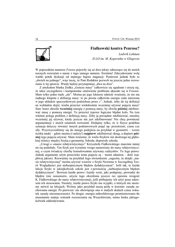 34 FOTON 124, Wiosna 2014 Fiałkowski kontra Penrose? Ludwik Lehman II LO im. M. Kopernika w Głogowie W poprzednim numerze Fotonu pojawiły się aż dwa teksty odnoszące się do moich nocnych rozważań o masie z tego samego numeru. Świetnie! Zdecydowanie wolę wartki potok dyskusji od mętnego bajora stagnacji. Ponieważ jednak było to „dwóch na jednego”, więc tuszę, że Pani Redaktor pozwoli na jeszcze jedne rozważania w tej sprawie. Wtedy będzie przynajmniej „dwa na dwa”. Z artykułem Marka Zrałka „Geneza masy” całkowicie się zgadzam i cieszę się, że takie szczegółowe i kompetentne omówienie problemu ukazało się w Fotonie. Mam tylko jedno małe „ale”. Można po jego lekturze odnieść wrażenie, że nie ma żadnego kłopotu z definicją masy: to po prostu całkowita energia ciała mierzona w jego układzie spoczynkowym podzielona przez c2. Jednak, żeby do tej definicji na wykładzie dojść, trzeba przecież wielokrotnie wcześniej używać pojęcia masy! Sam Autor określa wcześniej energię z pomocą masy, by chwilę później zdefiniować masę z pomocą energii. To przecież typowe logiczne błędne koło. Na tym właśnie polega problem z definicją masy. Żeby ją porządnie zdefiniować, musimy wcześniej jej używać, kiedy jeszcze nie jest zdefiniowana! Nie chcę powtarzać argumentacji z moich ostatnich rozważań. Dodajmy tylko, że w fizyce podobna sytuacja dotyczy również innych podstawowych pojęć np. przestrzeni, czasu czy siły. Przyzwyczailiśmy się do innego podejścia na przykład w geometrii – wzoru ścisłej nauki – gdzie można (i należy!) najpierw zdefiniować okręg, a dopiero później tego pojęcia używać. Mam wrażenie, że wielu fizyków nie dostrzega tej głębokiej różnicy między fizyką a geometrią. Szkoda, doprawdy szkoda. „Uwagi o »masie relatywistycznej«” Krzysztofa Fiałkowskiego znacznie mniej mi się podobały. Ten fizyk jest wyraźnie wrogo nastawiony do masy relatywistycznej, o czym świadczy choćby konsekwentnie używany cudzysłów. To Jego prawo. Jednak argumenty użyte przeciwko temu pojęciu są – moim zdaniem – dość wątpliwej jakości. Rozważmy na przykład Jego stwierdzenie „sugestia, że dzięki „masie relatywistycznej” można używać wzorów z fizyki Newtona w Szczególnej Teorii Względności jest niebezpiecznym błędem dydaktycznym”. Jeśli tak, to każda lekcja fizyki w jakiejkolwiek szkole jest z pewnością „niebezpiecznym błędem dydaktycznym”. Bowiem każde prawo i każdy wzór, jaki podajemy, prowadzi do błędów (nie nonsensów, użycie tego określenia jeszcze raz ujawnia wrogość K. Fiałkowskiego do masy relatywistycznej), jeśli próbujemy ich użyć poza zakresem ich stosowania. Niestety, każde prawo fizyki ma wyjątki, o których nie możemy mówić na lekcjach. Weźmy jako przykład naszą perłę w koronie: zasadę zachowania energii. Po pierwsze: nie obowiązuje ona w małych skalach czasu wskutek zasady nieoznaczoności. Po drugie: energia mikrofalowego promieniowania tła nieustannie maleje wskutek rozszerzania się Wszechświata, mimo braku jakiegokolwiek oddziaływania. FOTON 124, Wiosna 2014 35 Troska Krzysztofa Fiałkowskiego o możliwe nieporozumienia byłaby bardziej wiarygodna, gdyby nie był On współautorem podręcznika „Fizyka dla szkół ponadgimnazjalnych”, w którym do wyjaśnienia budowy atomu jest używany model Bohra, i tylko model Bohra. Chyba w gronie fizyków wszyscy się zgodzimy, że model Bohra „prowadzi do nonsensów”, i to znacznie większych, niż poczciwa masa relatywistyczna. To zresztą swoisty fenomen, żeby model sprzeczny z podstawowymi prawami fizyki, nigdy nie zaakceptowany przez ogół fizyków, do dziś był nauczany w szkołach, mimo, że zniknął już nareszcie z podstawy programowej! Parę lat temu udało mi się wywołać wielką dyskusję o jego wadach w nauczaniu, więc nie będę się powtarzał. Trochę dziwne, jeśli ktoś w jednym dziale fizyki domaga się wielkiej precyzji, a w innym sam propaguje „niebezpieczne błędy dydaktyczne” i przeróżne „nonsensy”. Wydaje mi się, że w tych nocnych rozmyślaniach bronię zwykłego umiaru i zdrowego rozsądku. A może tylko mi się tak wydaje? Weźmy jeszcze jeden przykład z „Uwag o..”. O pojęciu masy relatywistycznej Autor pisze: „we współczesnych podręcznikach autorzy wspominają o nim tylko po to, aby wyjaśnić, dlaczego nie należy go używać”. Owszem, prawie racja. Jednak „prawie” robi dużą różnicę. Polecam lekturę najbardziej współczesnego i wyrafinowanego matematycznie ujęcia fizyki teoretycznej (przynajmniej dostępnego w języku polskim). Myślę o „Drodze do rzeczywistości” Rogera Penrose’a. Czy Penrose używa pojęcia masy relatywistycznej? Nie. Jednak jej przeciwnikom to „nie” się nie spodoba. Przeczytajmy: „w sensie najzupełniej ścisłym masa i energia stają się sobie całkowicie równoważne”. Na tej samej stronie 415 wprowadza „masę całkowitą” układu jako jego całkowitą energię podzieloną przez c2. Na następnej stronie Penrose stwierdza, że „w teorii względności całkowita masa układu nie jest wielkością skalarną, a więc jej wartość zależy od układu odniesienia, w którym się ją mierzy”. I dalej: „w teorii względności istnieje jeszcze inne pojęcie tzw. masy spoczynkowej, której wielkość nie zależy od układu odniesienia”. Podsumujmy. Dla Rogera Penrose’a masa relatywistyczna to po prostu masa. Pomocniczym czy dodatkowym pojęciem jest natomiast masa spoczynkowa. Nie mnie decydować, którą wersję wolą fizycy wysokich energii, bo nie jestem specjalistą w tym dziale. Podobnie jednak oni nie powinni decydować o szczegółach nauczania fizyki, bo nie są od tego specjalistami. Ujęcie Penrose’a jest dydaktycznie znacznie bardziej atrakcyjne od ujęcia Fiałkowskiego. Na przykład dzięki niemu uczniowie mogą łatwo wyw