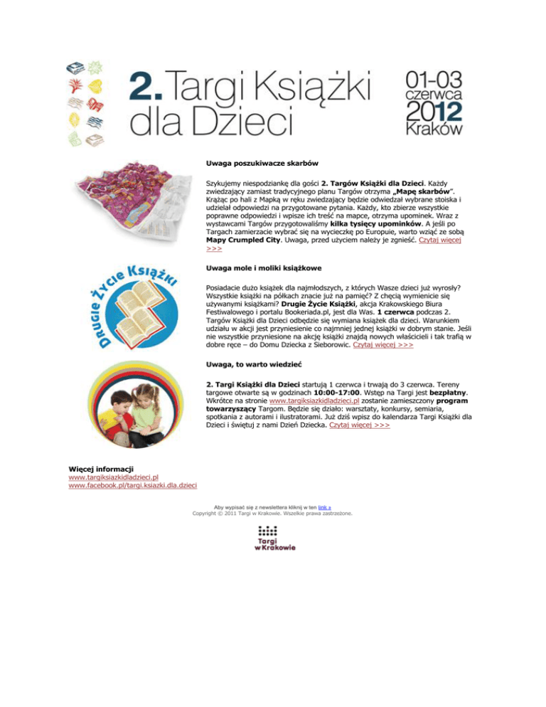 Uwaga poszukiwacze skarbów Szykujemy niespodziankę dla gości 2. Targów Książki dla Dzieci. Każdy zwiedzający zamiast tradycyjnego planu Targów otrzyma „Mapę skarbów”. Krążąc po hali z Mapką w ręku zwiedzający będzie odwiedzał wybrane stoiska i udzielał odpowiedzi na przygotowane pytania. Każdy, kto zbierze wszystkie poprawne odpowiedzi i wpisze ich treść na mapce, otrzyma upominek. Wraz z wystawcami Targów przygotowaliśmy kilka tysięcy upominków. A jeśli po Targach zamierzacie wybrać się na wycieczkę po Europuie, warto wziąć ze sobą Mapy Crumpled City. Uwaga, przed użyciem należy je zgnieść. Czytaj więcej >>> Uwaga mole i moliki książkowe Posiadacie dużo książek dla najmłodszych, z których Wasze dzieci już wyrosły? Wszystkie książki na półkach znacie już na pamięć? Z chęcią wymienicie się używanymi książkami? Drugie Życie Książki, akcja Krakowskiego Biura Festiwalowego i portalu Bookeriada.pl, jest dla Was. 1 czerwca podczas 2. Targów Książki dla Dzieci odbędzie się wymiana książek dla dzieci. Warunkiem udziału w akcji jest przyniesienie co najmniej jednej książki w dobrym stanie. Jeśli nie wszystkie przyniesione na akcję książki znajdą nowych właścicieli i tak trafią w dobre ręce – do Domu Dziecka z Sieborowic. Czytaj więcej >>> Uwaga, to warto wiedzieć 2. Targi Książki dla Dzieci startują 1 czerwca i trwają do 3 czerwca. Tereny targowe otwarte są w godzinach 10:00-17:00. Wstęp na Targi jest bezpłatny. Wkrótce na stronie www.targiksiazkidladzieci.pl zostanie zamieszczony program towarzyszący Targom. Będzie się działo: warsztaty, konkursy, semiaria, spotkania z autorami i ilustratorami. Już dziś wpisz do kalendarza Targi Książki dla Dzieci i świętuj z nami Dzień Dziecka. Czytaj więcej >>> Więcej informacji www.targiksiazkidladzieci.pl www.facebook.pl/targi.ksiazki.dla.dzieci Aby wypisać się z newslettera kliknij w ten link » Copyright © 2011 Targi w Krakowie. Wszelkie prawa zastrzeżone.
