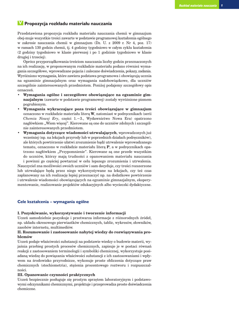 Rozkład materiału nauczania V Propozycja rozkładu materiału nauczania Przedstawiona propozycja rozkładu materiału nauczania chemii w gimnazjum obej-muje wszystkie treÊci zawarte w podstawie programowej kształcenia ogólnego w zakresie nauczania chemii w gimnazjum (Dz. U. z 2009 r. Nr 4, poz. 17) w ramach 130 godzin chemii, tj. 4 godziny tygodniowo w całym cyklu kształcenia (2 godziny tygodniowo w klasie pierwszej i po 1 godzinie tygodniowo w klasie drugiej i trzeciej). Oprócz przyporzàdkowania treÊciom nauczania liczby godzin przeznaczonych na ich realizacj´, w proponowanym rozkładzie materiału podano równie˝ wymagania szczegółowe, wprowadzane poj´cia i zalecane doÊwiadczenia, pokazy, zadania. Wyró˝niono wymagania, które zawiera podstawa programowa i obowiàzujà ucznia na egzaminie gimnazjalnym oraz wymagania nadobowiàzkowe, dla uczniów szczególnie zainteresowanych przedmiotem. Poni˝ej podajemy szczegółowy opis oznaczeƒ. • Wymagania ogólne i szczegółowe obowiàzujàce na egzaminie gimnazjalnym (zawarte w podstawie programowej) zostały wyró˝nione pismem pogrubionym. • Wymagania wykraczajàce poza treÊci obowiàzujàce w gimnazjum oznaczono w rozkładzie materiału literà W, natomiast w podr´cznikach (serii Chemia Nowej Ery, cz´Êci 1.−3., Wydawnictwo Nowa Era) opatrzono nagłówkiem „Wiem wi´cej”. Kierowane sà one do uczniów zdolnych i szczególnie zainteresowanych przedmiotem. • Wymagania dotyczàce wiadomoÊci utrwalajàcych, wprowadzonych ju˝ wczeÊniej (np. na lekcjach przyrody lub w poprzednich działach podr´czników), ale których powtórzenie ułatwi zrozumienie bàdê utrwalenie wprowadzanego tematu, oznaczono w rozkładzie materiału literà P, a w podr´cznikach opatrzono nagłówkiem „Przypomnienie”. Kierowane sà one przede wszystkim do uczniów, którzy majà trudnoÊci z opanowaniem materiału nauczania i powinni go cz´Êciej powtarzaç w celu lepszego zrozumienia i utrwalenia. Nauczyciel zna mo˝liwoÊci swoich uczniów i sam decyduje, czy treÊci rozszerzone lub utrwalajàce b´dà przez niego wykorzystywane na lekcjach, czy te˝ czas zaplanowany na ich realizacj´ lepiej przeznaczyç np. na dodatkowe powtórzenie i utrwalenie wiadomoÊci obowiàzujàcych na egzaminie gimnazjalnym, eksperymentowanie, realizowanie projektów edukacyjnych albo wycieczki dydaktyczne. Cele kształcenia – wymagania ogólne I. Pozyskiwanie, wykorzystywanie i tworzenie informacji Uczeƒ samodzielnie pozyskuje i przetwarza informacje z ró˝norodnych êródeł, np. układu okresowego pierwiastków chemicznych, tablic, wykresów, słowników, zasobów internetu, multimediów. II. Rozumowanie i zastosowanie nabytej wiedzy do rozwiàzywania problemów Uczeƒ podaje właÊciwoÊci substancji na podstawie wiedzy o budowie materii, wyjaÊnia przebieg prostych procesów chemicznych, zapisuje je w postaci równaƒ reakcji z zastosowaniem terminologii i symboliki chemicznej, wykorzystuje posiadanà wiedz´ do powiàzania właÊciwoÊci substancji z ich zastosowaniami i wpływem na Êrodowisko przyrodnicze, wykonuje proste obliczenia dotyczàce praw chemicznych (stechiometria), st´˝enia procentowego roztworu i rozpuszczalnoÊci. III. Opanowanie czynnoÊci praktycznych Uczeƒ bezpiecznie posługuje si´ prostym sprz´tem laboratoryjnym i podstawowymi odczynnikami chemicznymi, projektuje i przeprowadza proste doÊwiadczenia chemiczne. 1 TreÊci nauczania (temat lekcji) Pracownia chemiczna – podstawowe szkło i sprz´t laboratoryjny. Przepisy BHP i regulamin pracowni chemicznej WłaÊciwoÊci substancji Zjawisko fizyczne a reakcja chemiczna Mieszaniny substancji 1. 2. 3. 4. 2 1 1 1 Liczba godzin na realizacj´ Substancje i ich przemiany (24 godziny lekcyjne) Lp. DoÊwiadczenia/pokazy/ przykłady/zadania – opisuje cechy mieszanin jednorodnych i niejednorodnych – opisuje proste metody rozdzielania mieszanin na składniki – wskazuje ró˝nice mi´dzy właÊciwoÊciami fizycznymi składników mieszaniny, które umo˝liwiajà jej rozdzielenie – sporzàdza mieszaniny: wody i piasku, wody i soli kamiennej, kredy i soli kamiennej, siarki i opiłków ˝elaza, wody i oleju jadalnego, wody i atramentu; rozdziela je na składniki – projektuje doÊwiadczenie z zastosowaniem metody chromatografiiW – opisuje zasady rozdziału chromatograficznegoW – opisuje ró˝nice w przebiegu zjawiska fizycznego i reakcji chemicznej – podaje przykłady zjawisk fizycznych i reakcji chemicznych zachodzàcych w otoczeniu człowieka – projektuje i wykonuje doÊwiadczenia ilustrujàce zjawisko fizyczne i reakcj´ chemicznà – opisuje właÊciwoÊci substancji b´dàcych głównymi składnikami stosowanych na co dzieƒ produktów, np.: soli kamiennej, cukru, màki, wody, miedzi, ˝elaza – wykonuje doÊwiadczenia, w których bada właÊciwoÊci wybranych substancji – wymienia stany skupienia substancji na przykładzie wodyP – wymienia nazwy procesów zachodzàcych podczas zmian stanów skupieniaP – przeprowadza obliczenia z wykorzystaniem poj´ç: masa, g´stoÊç, obj´toÊç – przelicza jednostki obj´toÊci i masyP – opisuje sposób pomiaru g´stoÊci cieczyW DoÊwiadczenie 4. Sporzàdzanie mieszanin i rozdzielanie ich na składniki DoÊwiadczenie 5. Rozdzielanie składników tuszuW DoÊwiadczenie 3. Na czym polega ró˝nica mi´dzy zjawiskiem fizycznym a reakcjà chemicznà? DoÊwiadczenie 1. Badanie właÊciwoÊci wybranych substancji (miedzi, ˝elaza, soli kuchennej, màki, wody, chloru) DoÊwiadczenie 2. Porównanie g´stoÊci wody i oleju Przykład 1. Obliczanie g´stoÊci – kwalifikuje chemi´ do nauk przyrodniczych Pokaz szkła i sprz´tu – opisuje znaczenie chemii dla rozwoju cywilizacji laboratoryjnego – podaje przykłady zastosowaƒ chemii w ˝yciu codziennym – nazywa wybrane szkło i sprz´t laboratoryjny oraz okreÊla jego przeznaczenie – stosuje zasady bezpieczeƒstwa obowiàzujàce w pracowni chemicznej – zna wymaga