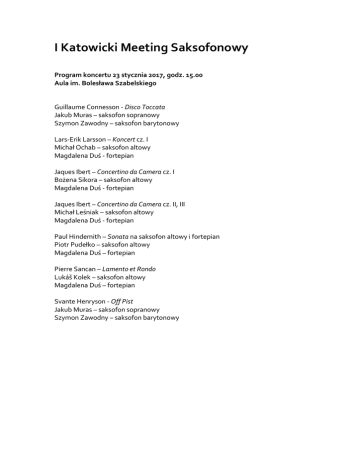 I Katowicki Meeting Saksofonowy Program koncertu 23 stycznia 2017, godz. 15.00 Aula im. Bolesława Szabelskiego Guillaume Connesson - Disco Toccata Jakub Muras – saksofon sopranowy Szymon Zawodny – saksofon barytonowy Lars-Erik Larsson – Koncert cz. I Michał Ochab – saksofon altowy Magdalena Duś - fortepian Jaques Ibert – Concertino da Camera cz. I Bożena Sikora – saksofon altowy Magdalena Duś - fortepian Jaques Ibert – Concertino da Camera cz. II, III Michał Leśniak – saksofon altowy Magdalena Duś - fortepian Paul Hindemith – Sonata na saksofon altowy i fortepian Piotr Pudełko – saksofon altowy Magdalena Duś – fortepian Pierre Sancan – Lamento et Rondo Lukáš Kolek – saksofon altowy Magdalena Duś – fortepian Svante Henryson - Off Pist Jakub Muras – saksofon sopranowy Szymon Zawodny – saksofon barytonowy