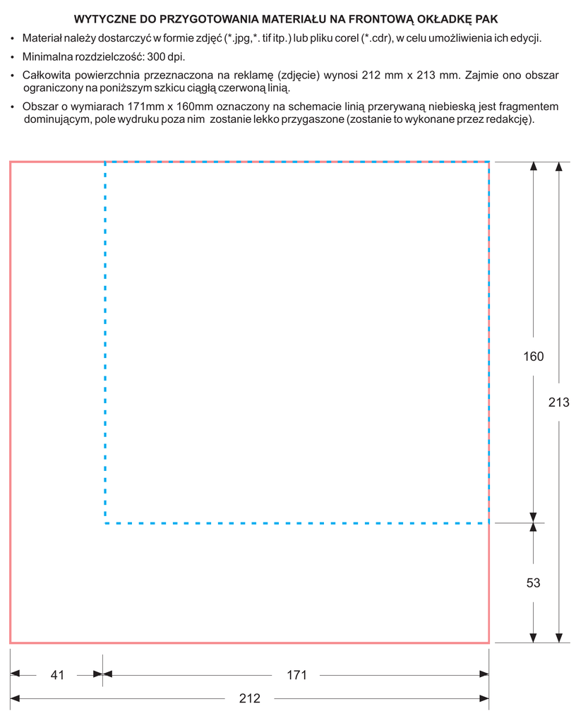 WYTYCZNE DO PRZYGOTOWANIA MATERIA£U NA FRONTOW¥ OK£ADKÊ PAK ? Materia³ nale¿y dostarczyæ w formie zdjêæ (*.jpg,*. tif itp.) lub pliku corel (*.cdr), w celu umo¿liwienia ich edycji. ? Minimalna rozdzielczoœæ: 300 dpi. ? Ca³kowita powierzchnia przeznaczona na reklamê (zdjêcie) wynosi 212 mm x 213 mm. Zajmie ono obszar ograniczony na poni¿szym szkicu ci¹g³¹ czerwon¹ lini¹. ? Obszar o wymiarach 171mm x 160mm oznaczony na schemacie lini¹ przerywan¹ niebiesk¹ jest fragmentem dominuj¹cym, pole wydruku poza nim zostanie lekko przygaszone (zostanie to wykonane przez redakcjê). 160 213 53 41 171 212 WYTYCZNE DO PRZYGOTOWANIA MATERIA£U NA OK£ADKI PAK - WEWNÊTRZNE ORAZ TYLN¥ ? Materia³ nale¿y dostarczyæ w formie zdjêæ (*.jpg,*. tif itp.) lub pliku corel (*.cdr), w celu umo¿liwienia ich edycji. ? Minimalna rozdzielczoœæ: 300 dpi. ? Ca³kowita powierzchnia przeznaczona na reklamê (zdjêcie) wynosi 212 mm x 301 mm. ? Nale¿y nie umieszczaæ wa¿nych informacji w odleg³oœci 5 mm od brzegów.