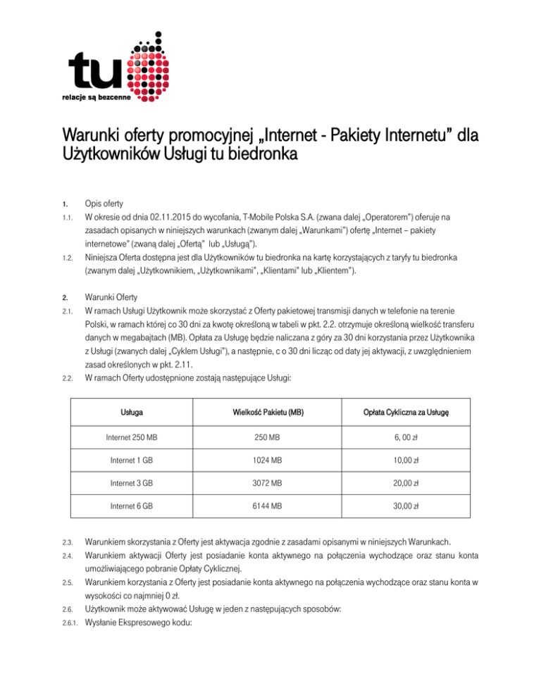 Warunki oferty promocyjnej „Internet - Pakiety Internetu” dla Użytkowników Usługi tu biedronka 1. 1.1. 1.2. 2. 2.1. 2.2. 2.3. 2.4. 2.5. 2.6. 2.6.1. Opis oferty W okresie od dnia 02.11.2015 do wycofania, T-Mobile Polska S.A. (zwana dalej „Operatorem”) oferuje na zasadach opisanych w niniejszych warunkach (zwanym dalej „Warunkami”) ofertę „Internet – pakiety internetowe” (zwaną dalej „Ofertą” lub „Usługą”). Niniejsza Oferta dostępna jest dla Użytkowników tu biedronka na kartę korzystających z taryfy tu biedronka (zwanym dalej „Użytkownikiem, „Użytkownikami”, „Klientami” lub „Klientem”). Warunki Oferty W ramach Usługi Użytkownik może skorzystać z Oferty pakietowej transmisji danych w telefonie na terenie Polski, w ramach której co 30 dni za kwotę określoną w tabeli w pkt. 2.2. otrzymuje określoną wielkość transferu danych w megabajtach (MB). Opłata za Usługę będzie naliczana z góry za 30 dni korzystania przez Użytkownika z Usługi (zwanych dalej „Cyklem Usługi”), a następnie, c o 30 dni licząc od daty jej aktywacji, z uwzględnieniem zasad określonych w pkt. 2.11. W ramach Oferty udostępnione zostają następujące Usługi: Usługa Wielkość Pakietu (MB) Opłata Cykliczna za Usługę Internet 250 MB 250 MB 6, 00 zł Internet 1 GB 1024 MB 10,00 zł Internet 3 GB 3072 MB 20,00 zł Internet 6 GB 6144 MB 30,00 zł Warunkiem skorzystania z Oferty jest aktywacja zgodnie z zasadami opisanymi w niniejszych Warunkach. Warunkiem aktywacji Oferty jest posiadanie konta aktywnego na połączenia wychodzące oraz stanu konta umożliwiającego pobranie Opłaty Cyklicznej. Warunkiem korzystania z Oferty jest posiadanie konta aktywnego na połączenia wychodzące oraz stanu konta w wysokości co najmniej 0 zł. Użytkownik może aktywować Usługę w jeden z następujących sposobów: Wysłanie Ekspresowego kodu: 2.6.1.1. 2.6.1.2. 2.6.1.3. 2.6.1.4. 2.6.2. 2.6.2.1. 2.6.2.2. 2.6.2.3. 2.6.2.4. 2.6.3. 2.7. 2.8. 2.9. 2.10. 2.10.1. 2.10.2. 2.10.3. 2.11. 2.12. 2.13. 2.14. 2.15. 2.16. 2.17. 2.17.1. *140*721# dla Usługi „Internet 250 MB” *140*722# dla Usługi „Internet 1 GB” *140*723# dla Usługi „Internet 3 GB” *140*724# dla Usługi „Internet 6 GB” Wysłanie pod bezpłatny numer 455 SMS-a o treści: TAK250 dla Usługi „Internet 250 MB” TAK1 dla Usługi „Internet 1 GB” TAK2 dla Usługi „Internet 3 GB” TAK3 dla Usługi „Internet 6 GB” w Biurze Obsługi Użytkownika, Aktywacja Oferty nastąpi w ciągu 72 godzin od momentu zarejestrowania przez Operatora zlecenia aktywacji i zostanie potwierdzona wiadomością SMS. W ramach Oferty Operator zastrzega sobie prawo do ograniczenia maksymalnej dostępnej prędkości transmisji danych po przekroczeniu przez Użytkownika w danym Cyklu Usługi maksymalnej dostępnej ilości MB w taki sposób, że nie będzie ono wyższe niż 16 kb/s. W każdym momencie Klient może aktywować nowy Pakiet. Zlecenie przez Klienta aktywacji innego płatnego lub kolejny raz tego samego pakietu „Pakiet Internetu”, gdy klient ma już na koncie jeden aktywny, spowoduje dodanie do subkonta jednostek z nowego pakietu. Data ważności subkonta oraz cykl rozliczeniowy są ustawione zgodnie z datą najdłużej obowiązującego pakietu. Klient może bezpłatnie sprawdzić status Usługi w jeden z następujących sposobów: wysłanie pod bezpłatny numer 455 SMS-a o treści SMS-a o treści: STAN wysłanie Ekspresowego kodu *140*728# w Biurze Obsługi Użytkownika, Opłata Cykliczna będzie naliczana z góry za okres 30 dni korzystania przez Użytkownika z Oferty a następnie co 30 dni licząc od daty jej aktywacji, z uwzględnieniem pkt. 2.12. Opłata Cykliczna pobierana jest bez względu na to czy konto jest aktywne na połączenia wychodzące. W przypadku braku środków wystarczających na pobranie Opłaty Cyklicznej za Ofertę, Oferta zostanie automatycznie dezaktywowana. Jednostki niewykorzystane w danym cyklu rozliczeniowym nie przechodzą na kolejny 30-dniowy cykl i nie są sumowane z jednostkami z kolejnego cyklu. Dezaktywacja Oferty nastąpi w ciągu 72 godzin od momentu zarejestrowania przez Operatora zlecenia dezaktywacji i zostanie potwierdzona wiadomością SMS. Dezaktywacja Oferty powoduje usunięcie niewykorzystanych jednostek przyznanych w ramach Oferty, a poniesione opłaty za Ofertę nie podlegają zwrotowi. Dezaktywacja Usługi powoduje powrót do naliczania opłat za przesyłane dane zgodnie z cennikiem posiadanej taryfą oraz powrót do standardowych parametrów technicznych świadczenia usługi transmisji danych. Dezaktywacja Usługi nie powoduje dezaktywacji pakietowej transmisji danych ani zwrotu poniesionej opłaty za Usługę. Użytkownik ma prawo do dezaktywacji Usługi w jeden z następujących sposobów: wysłanie pod bezpłatny numer 455 SMS-a o treści SMS-a o treści: DEZ 2.17.2. 2.17.3. 2.18. 2.19. 2.20. 2.21. 2.22. 3. 3.1. 3.1.1. 3.1.2. 3.2. 3.3. 3.4. 3.5. 3.6. 3.7. 3.8. wysłanie Ekspresowego kodu *140*729# w Biurze Obsługi Użytkownika, w ramach Usługi transmisja danych będzie naliczana za każde rozpoczęte 100kB, oddzielnie za dane wysłane i odebrane na poziomie protokołu internetowego(IP); 1kB – 1024B. po zakończeniu sesji dane są zaokrąglane w górę do pełnej jednostki taryfowej 100kB. Po wykorzystaniu przez Klient pakietu danych Klient nie będzie mógł korzystać z pakietowej transmisji danych w ramach Warunków. Pakiet Internetu umożliwia mobilny dostęp do Internetu w ramach pakietowej transmisji danych w zasięgu sieci Operatora na terenie Polski, realizowany w technologiach mobilnych 2G/3G (w zależności od wykorzystywanego urządzenia , dostępności danej technologii w danym terenie oraz usług aktywnych dla danej karty SIM). Brak posiadania konta ważnego na połączenia wychodzące w trakcie korzystania z Oferty, nie powoduje przedłużenia ważności Oferty. Jednostki w ramach Oferty są wykorzystywane w pierwszej kolejnośc