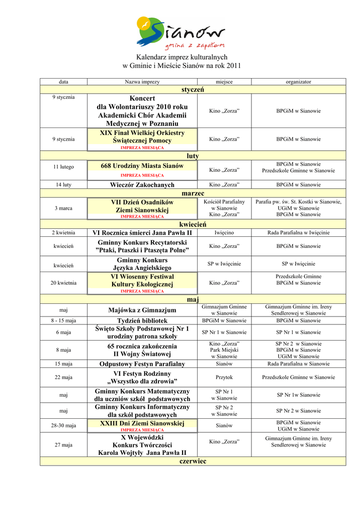 Kalendarz imprez kulturalnych w Gminie i Mieście Sianów na rok 2011 data Nazwa imprezy miejsce organizator Koncert dla Wolontariuszy 2010 roku Akademicki Chór Akademii Medycznej w Poznaniu Kino „Zorza” BPGiM w Sianowie XIX Finał Wielkiej Orkiestry Świątecznej Pomocy Kino „Zorza” BPGiM w Sianowie Kino „Zorza” BPGiM w Sianowie Przedszkole Gminne w Sianowie Kino „Zorza” BPGiM w Sianowie Kościół Parafialny w Sianowie Kino „Zorza” Parafia pw. św. St. Kostki w Sianowie, UGiM w Sianowie BPGiM w Sianowie styczeń 9 stycznia 9 stycznia IMPREZA MIESIĄCA luty 11 lutego 668 Urodziny Miasta Sianów IMPREZA MIESIĄCA 14 luty Wieczór Zakochanych marzec 3 marca VII Dzień Osadników Ziemi Sianowskiej IMPREZA MIESIĄCA kwiecień 2 kwietnia kwiecień kwiecień 20 kwietnia VI Rocznica śmierci Jana Pawła II Gminny Konkurs Recytatorski ”Ptaki, Ptaszki i Ptaszęta Polne” Gminny Konkurs Języka Angielskiego VI Wiosenny Festiwal Kultury Ekologicznej Iwięcino Rada Parafialna w Iwięcinie Kino „Zorza” BPGiM w Sianowie SP w Iwięcinie SP w Iwięcinie Kino „Zorza” Przedszkole Gminne BPGiM w Sianowie Gimnazjum Gminne w Sianowie BPGiM w Sianowie Gimnazjum Gminne im. Ireny Sendlerowej w Sianowie BPGiM w Sianowie SP Nr 1 w Sianowie SP Nr 1 w Sianowie Kino „Zorza” Park Miejski w Sianowie Sianów SP Nr 2 w Sianowie BPGiM w Sianowie UGiM w Sianowie Rada Parafialna w Sianowie Przytok Przedszkole Gminne w Sianowie SP Nr 1 w Sianowie SP Nr 1w Sianowie SP Nr 2 w Sianowie SP Nr 2 w Sianowie Sianów BPGiM w Sianowie UGiM w Sianowie Kino „Zorza” Gimnazjum Gminne im. Ireny Sendlerowej w Sianowie IMPREZA MIESIĄCA maj maj Majówka z Gimnazjum 8 - 15 maja Tydzień bibliotek Święto Szkoły Podstawowej Nr 1 urodziny patrona szkoły 65 rocznica zakończenia II Wojny Światowej Odpustowy Festyn Parafialny VI Festyn Rodzinny „Wszystko dla zdrowia” Gminny Konkurs Matematyczny dla uczniów szkół podstawowych Gminny Konkurs Informatyczny dla szkół podstawowych XXIII Dni Ziemi Sianowskiej 6 maja 8 maja 15 maja 22 maja maj maj 28-30 maja IMPREZA MIESIĄCA 27 maja X Wojewódzki Konkurs Twórczości Karola Wojtyły Jana Pawła II czerwiec czerwiec 7 czerwca czerwiec 18 czerwca XX Ogólnopolski Bieg Uliczny im. Ryszarda Targaszewskiego połączony z festynem z okazji Dnia Dziecka X Gminny Sejmik Ekologiczny III Festyn Rodzinny IV Proekologiczny Jarmark u Podnóża Góry Chełmskiej w Kędzierzynie Sianów BPGiM w Sianowie UGiM w Sianowie SP w Iwięcinie Sucha Koszalińska SP w Iwięcinie SP w Suchej Koszalińskiej Gospodarstwo Agroturystyczne „Zaścianek” UGiM Sianów, Gospodarstwo Agroturystyczne „Zaścianek” Węgorzewo Rada Sołecka w Węgorzewie IMPREZA MIESIĄCA 26 czerwca V Odpustowy Festyn św. Piotra i Pawła lipiec lipiec Rozpoczęcie lata Park Miejski w Sianowie BPGiM w Sianowie 3 lipca III Targ Cysterski w Iwięcinie Iwięcino Stowarzyszenie na Rzecz Rozwoju Wsi Iwięcino Iwięcino Klub sportowy „Wanta” IMPREZA MIESIĄCA lipiec Wakacje na wodzie sierpień sierpień IV Jarmark Sianowski 6 sierpnia XII Jarmark w Wiosce Hobbitów IMPREZA MIESIĄCA „Orlik 2012” w Sianowie Wioska Hobbitów Sierakowo Sł. Radni Rady Miejskiej w Sianowie Stowarzyszenie Hobbiton wrzesień 1 września wrzesień 17 września 10 września 72 rocznica wybuchu II wojny światowej XIX Europejskie Dni Dziedzictwa w Polsce 72 rocznica napaści sowietów na Polskę Gimnazjum Gminne w Sianowie Park Miejski w Sianowie Gimnazjum Gminne im. Ireny Sendlerowej w Sianowie Sianów UGiM w Sianowie SP Nr 1 w Sianowie SP Nr 1 w Sianowie Grabówko BPGiM w Sianowie, UGiM Sianów Kino „Zorza” BPGiM w Sianowie Kościół Parafialny pw. św. St. Kostki. w Sianowie Parafialny Oddział Akcji Katolickiej w Sianowie XIV Dożynki Gminne IMPREZA MIESIĄCA październik październik 16 października Gminny konkurs „Mistrzowie Pięknego Czytania” XI Dzień Papieski IMPREZA MIESIĄCA listopad 11 listopada listopad 13 listopada Park Miejski w Sianowie SP Nr 1 w Sianowie Gimnazjum Gminne w Sianowie Gimnazjum Gminne im. Ireny Sendlerowej w Sianowie Obchody Dnia Niepodległości VIII Kropla Ciepła od Ciebie warsztaty artystyczne dla nauczycieli i mieszkańców gminy V Imieniny Miasta Kino „Zorza” BPGiM w Sianowie IMPREZA MIESIĄCA 22 listopada Dzień Lwowiaka SP w Szczeglinie SP w Szczeglinie grudzień grudzień 22 - 23 grudnia X Świąteczne Spotkanie z Gimnazjum VI Dziewczynki z Zapałkami IMPREZA MIESIĄCA Gimnazjum Gminne w Sianowie Gimnazjum Gminne im. Ireny Sendlerowej w Sianowie Kino „Zorza”, Miasto Sianów BPGiM w Sianowie
