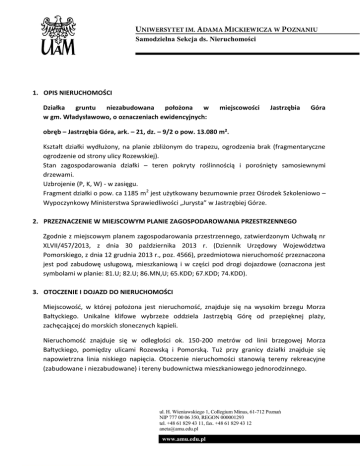 Samodzielna Sekcja ds. Nieruchomości 1. OPIS NIERUCHOMOŚCI Działka gruntu niezabudowana położona w w gm. Władysławowo, o oznaczeniach ewidencyjnych: miejscowości Jastrzębia Góra obręb – Jastrzębia Góra, ark. – 21, dz. – 9/2 o pow. 13.080 m². Kształt działki wydłużony, na planie zbliżonym do trapezu, ogrodzenia brak (fragmentaryczne ogrodzenie od strony ulicy Rozewskiej). Stan zagospodarowania działki – teren pokryty roślinnością i porośnięty samosiewnymi drzewami. Uzbrojenie (P, K, W) - w zasięgu. Fragment działki o pow. ca 1185 m2 jest użytkowany bezumownie przez Ośrodek Szkoleniowo – Wypoczynkowy Ministerstwa Sprawiedliwości „Jurysta” w Jastrzębiej Górze. 2. PRZEZNACZENIE W MIEJSCOWYM PLANIE ZAGOSPODAROWANIA PRZESTRZENNEGO Zgodnie z miejscowym planem zagospodarowania przestrzennego, zatwierdzonym Uchwałą nr XLVII/457/2013, z dnia 30 października 2013 r. (Dziennik Urzędowy Województwa Pomorskiego, z dnia 12 grudnia 2013 r., poz. 4566), przedmiotowa nieruchomość przeznaczona jest pod zabudowę usługową, mieszkaniową i w części pod drogi dojazdowe (oznaczona jest symbolami w planie: 81.U; 82.U; 86.MN,U; 65.KDD; 67.KDD; 74.KDD). 3. OTOCZENIE I DOJAZD DO NIERUCHOMOŚCI Miejscowość, w której położona jest nieruchomość, znajduje się na wysokim brzegu Morza Bałtyckiego. Unikalne klifowe wybrzeże oddziela Jastrzębią Górę od przepięknej plaży, zachęcającej do morskich słonecznych kąpieli. Nieruchomość znajduje się w odległości ok. 150-200 metrów od linii brzegowej Morza Bałtyckiego, pomiędzy ulicami Rozewską i Pomorską. Tuż przy granicy działki znajduje się napowietrzna linia niskiego napięcia. Otoczenie nieruchomości stanowią tereny rekreacyjne (zabudowane i niezabudowane) i tereny budownictwa mieszkaniowego jednorodzinnego. ul. H. Wieniawskiego 1, Collegium Minus, 61-712 Poznań NIP 777 00 06 350, REGON 000001293 tel. +48 61 829 43 11, fax. +48 61 829 43 12 [email protected] www.amu.edu.pl Samodzielna Sekcja ds. Nieruchomości Dojazd do działki drogą nieutwardzoną. Zgodnie z ww. decyzją o ustaleniu warunków zabudowy – obsługa komunikacyjna ma się odbywać od ul. Krańcowej. 4. STAN PRAWNY NIERUCHOMOŚCI Stan prawny nieruchomości uregulowany jest w księdze wieczystej nr 173 Tupadły prowadzonej przez Sąd Rejonowy w Wejherowie Wydział V Ksiąg Wieczystych Zamiejscowy w Pucku. Nieruchomość stanowi własność Uniwersytetu im. A. Mickiewicza w Poznaniu. ul. H. Wieniawskiego 1, Collegium Minus, 61-712 Poznań NIP 777 00 06 350, REGON 000001293 tel. +48 61 829 43 11, fax. +48 61 829 43 12 [email protected] www.amu.edu.pl