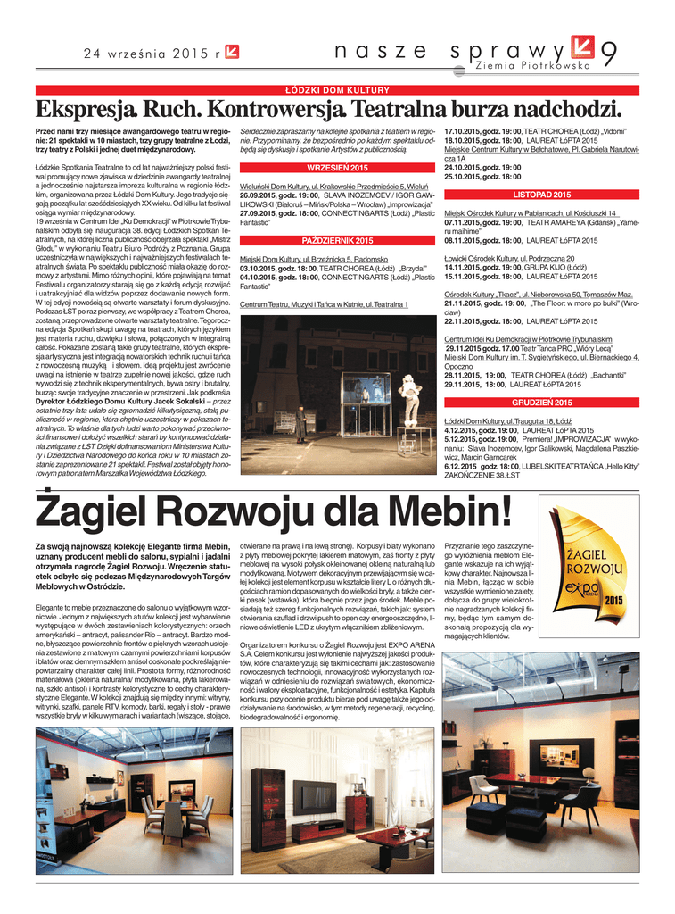 24 września 2015 r nasze sprawy Ziemia Piotrkowska 9 ŁÓDZKI DOM KULTURY Ekspresja. Ruch. Kontrowersja. Teatralna burza nadchodzi. Przed nami trzy miesiące awangardowego teatru w regionie: 21 spektakli w 10 miastach, trzy grupy teatralne z Łodzi, trzy teatry z Polski i jednej duet międzynarodowy. Serdecznie zapraszamy na kolejne spotkania z teatrem w regionie. Przypominamy, że bezpośrednio po każdym spektaklu odbędą się dyskusje i spotkanie Artystów z publicznością. Łódzkie Spotkania Teatralne to od lat najważniejszy polski festiwal promujący nowe zjawiska w dziedzinie awangardy teatralnej a jednocześnie najstarsza impreza kulturalna w regionie łódzkim, organizowana przez Łódzki Dom Kultury. Jego tradycje sięgają początku lat sześćdziesiątych XX wieku.Od kilku lat festiwal osiąga wymiar międzynarodowy. 19 września w Centrum Idei „Ku Demokracji” w Piotrkowie Trybunalskim odbyła się inauguracja 38. edycji Łódzkich Spotkań Teatralnych, na której liczna publiczność obejrzała spektakl „Mistrz Głodu” w wykonaniu Teatru Biuro Podróży z Poznania. Grupa uczestniczyła w największych i najważniejszych festiwalach teatralnych świata. Po spektaklu publiczność miała okazję do rozmowy z artystami. Mimo różnych opinii, które pojawiają na temat Festiwalu organizatorzy starają się go z każdą edycją rozwijać i uatrakcyjniać dla widzów poprzez dodawanie nowych form. W tej edycji nowością są otwarte warsztaty i forum dyskusyjne. Podczas ŁST po raz pierwszy, we współpracy zTeatrem Chorea, zostaną przeprowadzone otwarte warsztaty teatralne.Tegoroczna edycja Spotkań skupi uwagę na teatrach, których językiem jest materia ruchu, dźwięku i słowa, połączonych w integralną całość. Pokazane zostaną takie grupy teatralne, których ekspresja artystyczna jest integracją nowatorskich technik ruchu i tańca z nowoczesną muzyką i słowem. Ideą projektu jest zwrócenie uwagi na istnienie w teatrze zupełnie nowej jakości, gdzie ruch wywodzi się z technik eksperymentalnych, bywa ostry i brutalny, burząc swoje tradycyjne znaczenie w przestrzeni. Jak podkreśla Dyrektor Łódzkiego Domu Kultury Jacek Sokalski – przez ostatnie trzy lata udało się zgromadzić kilkutysięczną, stałą publiczność w regionie, która chętnie uczestniczy w pokazach teatralnych.To właśnie dla tych ludzi warto pokonywać przeciwności finansowe i dołożyć wszelkich starań by kontynuować działania związane z ŁST.Dzięki dofinansowaniom Ministerstwa Kultury i Dziedzictwa Narodowego do końca roku w 10 miastach zostanie zaprezentowane 21 spektakli.Festiwal został objęty honorowym patronatem Marszałka Województwa Łódzkiego. WRZESIEŃ 2015 Wieluński Dom Kultury, ul. Krakowskie Przedmieście 5, Wieluń 26.09.2015, godz. 19: 00, SLAVA INOZEMCEV / IGOR GAWLIKOWSKI (Białoruś – Mińsk/Polska – Wrocław) „Improwizacja” 27.09.2015, godz. 18: 00, CONNECTINGARTS (Łódź) „Plastic Fantastic” PAŹDZIERNIK 2015 Miejski Dom Kultury, ul. Brzeźnicka 5, Radomsko 03.10.2015, godz. 18: 00, TEATR CHOREA (Łódź) „Brzydal” 04.10.2015, godz. 18: 00, CONNECTINGARTS (Łódź) „Plastic Fantastic” Centrum Teatru, Muzyki i Tańca w Kutnie, ul.Teatralna 1 17.10.2015, godz. 19: 00, TEATR CHOREA (Łódź) „Vidomi” 18.10.2015, godz. 18: 00, LAUREAT ŁóPTA 2015 Miejskie Centrum Kultury w Bełchatowie, Pl. Gabriela Narutowicza 1A 24.10.2015, godz. 19: 00 25.10.2015, godz. 18: 00 LISTOPAD 2015 Miejski Ośrodek Kultury w Pabianicach, ul.Kościuszki 14 07.11.2015, godz. 19: 00, TEATR AMAREYA (Gdańsk) „Yameru maihime” 08.11.2015, godz. 18: 00, LAUREAT ŁóPTA 2015 Łowicki Ośrodek Kultury, ul. Podrzeczna 20 14.11.2015, godz. 19: 00, GRUPA KIJO (Łódź) 15.11.2015, godz. 18: 00, LAUREAT ŁóPTA 2015 Ośrodek Kultury „Tkacz”, ul.Nieborowska 50, Tomaszów Maz. 21.11.2015, godz. 19: 00, „The Floor: w moro po bułki” (Wrocław) 22.11.2015, godz. 18: 00, LAUREAT ŁóPTA 2015 Centrum Idei Ku Demokracji w Piotrkowie Trybunalskim 29.11.2015 godz. 17.00 Teatr Tańca PRO „Wióry Lecą” Miejski Dom Kultury im. T. Sygietyńskiego, ul. Biernackiego 4, Opoczno 28.11.2015, 19: 00, TEATR CHOREA (Łódź) „Bachantki” 29.11.2015, 18: 00, LAUREAT ŁóPTA 2015 GRUDZIEŃ 2015 Łódzki Dom Kultury, ul.Traugutta 18, Łódź 4.12.2015, godz. 19: 00, LAUREAT ŁóPTA 2015 5.12.2015,godz.19:00, Premiera! „IMPROWIZACJA” w wykonaniu: Slava Inozemcev, Igor Galikowski, Magdalena Paszkiewicz, Marcin Garncarek 6.12. 2015 godz. 18: 00, LUBELSKI TEATR TAŃCA „Hello Kitty” ZAKOŃCZENIE 38. ŁST Żagiel Rozwoju dla Mebin! Za swoją najnowszą kolekcję Elegante firma Mebin, uznany producent mebli do salonu, sypialni i jadalni otrzymała nagrodę Żagiel Rozwoju. Wręczenie statuetek odbyło się podczas Międzynarodowych Targów Meblowych w Ostródzie. Elegante to meble przeznaczone do salonu o wyjątkowym wzornictwie. Jednym z największych atutów kolekcji jest wybarwienie występujące w dwóch zestawieniach kolorystycznych: orzech amerykański – antracyt, palisander Rio – antracyt. Bardzo modne, błyszczące powierzchnie frontów o pięknych wzorach usłojenia zestawione z matowymi czarnymi powierzchniami korpusów i blatów oraz ciemnym szkłem antisol doskonale podkreślają niepowtarzalny charakter całej linii. Prostota formy, różnorodność materiałowa (okleina naturalna/ modyfikowana, płyta lakierowana, szkło antisol) i kontrasty kolorystyczne to cechy charakterystyczne Elegante.W kolekcji znajdują się między innymi: witryny, witrynki, szafki, panele RTV, komody, barki, regały i stoły - prawie wszystkie bryły w kilku wymiarach i wariantach (wiszące, stojące, otwierane na prawą i na lewą stronę). Korpusy i blaty wykonano z płyty meblowej pokrytej lakierem matowym, zaś fronty z płyty meblowej na wysoki połysk okleinowanej okleiną naturalną lub modyfikowaną.Motywem dekoracyjnym przewijającym się w całej kolekcj