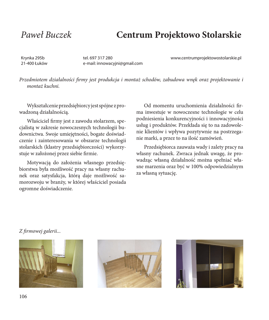 Paweł Buczek Krynka 295b 21-400 Łuków Centrum Projektowo Stolarskie tel. 697 317 280 e-mail: [email protected] www.centrumprojektowostolarskie.pl Przedmiotem działalności firmy jest produkcja i montaż schodów, zabudowa wnęk oraz projektowanie i montaż kuchni. Wykształcenie przedsiębiorcy jest spójne z prowadzoną działalnością. Właściciel firmy jest z zawodu stolarzem, specjalistą w zakresie nowoczesnych technologii budownictwa. Swoje umiejętności, bogate doświadczenie i zainteresowania w obszarze technologii stolarskich (klastry przedsiębiorczości) wykorzystuje w założonej przez siebie firmie. Motywacją do założenia własnego przedsiębiorstwa była możliwość pracy na własny rachunek oraz satysfakcja, którą daje możliwość samorozwoju w branży, w której właściciel posiada ogromne doświadczenie. Z firmowej galerii... 106 Od momentu uruchomienia działalności firma inwestuje w nowoczesne technologie w celu podniesienia konkurencyjności i innowacyjności usług i produktów. Przekłada się to na zadowolenie klientów i wpływa pozytywnie na postrzeganie marki, a przez to na ilość zamówień. Przedsiębiorca zauważa wady i zalety pracy na własny rachunek. Zwraca jednak uwagę, że prowadząc własną działalność można spełniać własne marzenia oraz być w 100% odpowiedzialnym za własną sytuację.