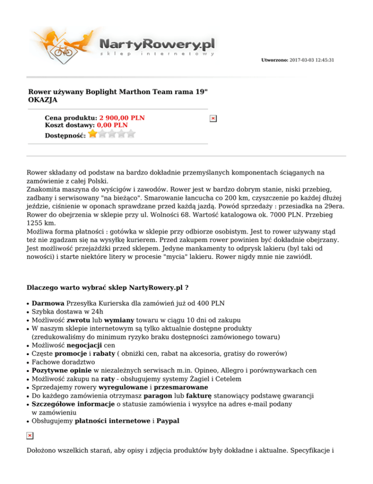 Utworzono: 2017-03-03 12:45:31 Rower używany Boplight Marthon Team rama 19" OKAZJA Cena produktu: 2 900,00 PLN Koszt dostawy: 0,00 PLN Dostępność: Rower składany od podstaw na bardzo dokładnie przemyślanych komponentach ściąganych na zamówienie z całej Polski. Znakomita maszyna do wyścigów i zawodów. Rower jest w bardzo dobrym stanie, niski przebieg, zadbany i serwisowany "na bieżąco". Smarowanie łancucha co 200 km, czyszczenie po każdej dłużej jeździe, ciśnienie w oponach sprawdzane przed każdą jazdą. Powód sprzedaży : przesiadka na 29era. Rower do obejrzenia w sklepie przy ul. Wolności 68. Wartość katalogowa ok. 7000 PLN. Przebieg 1255 km. Możliwa forma płatności : gotówka w sklepie przy odbiorze osobistym. Jest to rower używany stąd też nie zgadzam się na wysyłkę kurierem. Przed zakupem rower powinien być dokładnie obejrzany. Jest możliwość przejażdżki przed sklepem. Jedyne mankamenty to odprysk lakieru (byl taki od nowości) i starte niektóre litery w procesie "mycia" lakieru. Rower nigdy mnie nie zawiódł. Dlaczego warto wybrać sklep NartyRowery.pl ? ● ● ● ● ● ● ● ● ● ● ● ● ● Darmowa Przesyłka Kurierska dla zamówień już od 400 PLN Szybka dostawa w 24h Możliwość zwrotu lub wymiany towaru w ciągu 10 dni od zakupu W naszym sklepie internetowym są tylko aktualnie dostępne produkty (zredukowaliśmy do minimum ryzyko braku dostępności zamówionego towaru) Możliwość negocjacji cen Częste promocje i rabaty ( obniżki cen, rabat na akcesoria, gratisy do rowerów) Fachowe doradztwo Pozytywne opinie w niezależnych serwisach m.in. Opineo, Allegro i porównywarkach cen Możliwość zakupu na raty - obsługujemy systemy Żagiel i Cetelem Sprzedajemy rowery wyregulowane i przesmarowane Do każdego zamówienia otrzymasz paragon lub fakturę stanowiący podstawę gwarancji Szczegółowe informacje o statusie zamówienia i wysyłce na adres e-mail podany w zamówieniu Obsługujemy płatności internetowe i Paypal Dołożono wszelkich starań, aby opisy i zdjęcia produktów były dokładne i aktualne. Specyfikacje i ceny mogą ulec zmianie bez uprzedzenia Płeć Męski Przeznaczenie Górski / MTB Widelec/ amortyzator Manitou Skareb Com 80 mm Manetki Shimano Deore LX 3x9 Przerzutka przód Shmiano Deore XT Przerzutka tył Shmiano Deore XTR Kaseta/ wolnobieg Shimano Deore LX Korbowód Shmiano Deore XT Pedały Hamulce zwykłe Hayes MX 2 160 mm / 160 mm Piasta przód DT Swiss Cerit łożyska maszynowe Piasta tył DT Swiss Cerit łożyska maszynowe Obręcze Alexrims FD16 Szprychy DT Swiss Competition Kolekcja - Opony Tioga Factory XC Slick Stery Tioga Mostek Ritchey WCS Kierownica Ritchey WCS Chwyty pianka Siodło San Marcon SKN Sztyca Ritchey WCS 350 m (aktualnie zamontowana Boplight 400 mm) Waga ok. 10,3 kg Rama Boplight Team Marathon AN6 19" Hamulce Tarczowe mechaniczne Damper nie Pegi nie Łańcuch Gwarancja Ilość biegów Adres: http://nartyrowery.pl/ Shimano XTR brak 27 Telefon: 34 365 66 09, 793 61 04 29 Email: [email protected] Gadu-Gadu: Skype: