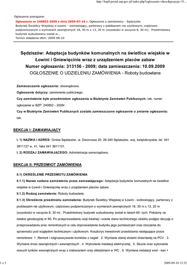 1z3 http://bzp0.portal.uzp.gov.pl/index.php?ogloszenie=show&pozycja=31... Ogłoszenie powiązane: Ogłoszenie nr 240852-2009 z dnia 2009-07-16 r. Ogłoszenie o zamówieniu - Sędziszów Budynek Świetlicy Wiejskiej w Łowini - wolnostojący, parterowy z poddaszem nie użytkowym, częściowo podpiwniczonym o wymiarach zewnętrznych 18, 30 m x 13, 20 m (wysokości w szczycie 8, 30 m) . Przedmiotowy budynek wybudowany został w... Termin składania ofert: 2009-08-10 Sędziszów: Adaptacja budynków komunalnych na świetlice wiejskie w Łowini i Gniewięcinie wraz z urządzeniem placów zabaw Numer ogłoszenia: 313156 - 2009; data zamieszczenia: 10.09.2009 OGŁOSZENIE O UDZIELENIU ZAMÓWIENIA - Roboty budowlane Zamieszczanie ogłoszenia: obowiązkowe. Ogłoszenie dotyczy: zamówienia publicznego. Czy zamówienie było przedmiotem ogłoszenia w Biuletynie Zamówień Publicznych: tak, numer ogłoszenia w BZP: 240852 - 2009r. Czy w Biuletynie Zamówień Publicznych zostało zamieszczone ogłoszenie o zmianie ogłoszenia: tak. SEKCJA I: ZAMAWIAJĄCY I. 1) NAZW A I ADRES: Gmina Sędziszów, ul. Dworcowa 20, 28-340 Sędziszów, woj. świętokrzyskie, tel. 041 3811127 w. 41, faks 041 3811131. I. 2) RODZAJ ZAMAW IAJĄCEGO: Administracja samorządowa. SEKCJA II: PRZEDMIOT ZAMÓWIENIA II.1) OKREŚLENIE PRZEDMOTU ZAMÓW IENIA II.1.1) Nazwa nadana zamówieniu przez zamawiającego: Adaptacja budynków komunalnych na świetlice wiejskie w Łowini i Gniewięcinie wraz z urządzeniem placów zabaw. II.1.2) Rodzaj zamówienia: Roboty budowlane. II.1.3) Określenie przedmiotu zamówienia: Budynek Świetlicy Wiejskiej w Łowini - wolnostojący, parterowy z poddaszem nie użytkowym, częściowo podpiwniczonym o wymiarach zewnętrznych 18, 30 m x 13, 20 m (wysokości w szczycie 8, 30 m) . Przedmiotowy budynek wybudowany został w latach 60- tych. Położony na działce geodezyjnej nr 60. Po przeprowadzeniu wizji lokalnej i ocenie stanu technicznego obiektu podjęto decyzję o przeprowadzeniu prac remontowych w celu doprowadzenia budynku jego pomieszczeń oraz otoczenia do sprawności pod względem technicznym i użytkowym. Kosztorys inwestorski przedstawia następujące prace remontowe: 1. Remont i odgruzowywanie kominów z cegieł . 2. Wymiana starej stolarki drewnianej na PCV . 3. Wymiana drzwi zewnętrznych i wewnętrznych . 4. Wykonanie instalacji elektrycznej . 5. Skucie oraz wykonanie nowych tynków wewnętrznych wraz z malowaniem oraz okładzinami w WC . 6. Wymiana instalacji wod - kan + 2009-09-10 13:32 http://bzp0.portal.uzp.gov.pl/index.php?ogloszenie=show&pozycja=31... biały montaż . 7. Skucie i wykonanie nowych posadzek. 8. Wykonanie ocieplenia budynku metoda lekko - mokrą, styropian gr. 8 cm. 9. Montaż nowych parapetów i daszków zewnętrznych nad wejściem. 10. Wykonanie podjazdu dla niepełnosprawnych ( ściany fundamentowe żelbetowe, nad poziomem terenu ścianki murowane z cegły klinkierowej, wykończenie podjazdu kostką . 11. Zagospodarowanie terenu przez wykonanie alejek ( chodników z kostki ) spacerowych montaż urządzeń placów zabaw. 12. Wyposażenie budynku ( szafki, kosze, stół do tenisa, zestaw gier planszowych). 13. Montaż systemu dystrybucji gorącego powietrza z kominkiem o mocy 18 kW wraz z obudową marmurowa i rozporządzeniem rurarzem po pomieszczeniach budynku . 14. Ogrodzenie terenu z siatki na słupkach stalowych + 2 bramy z furtkami. Budynek Świetlicy Wiejskiej w Gniewięcinie - wolnostojący, parterowy z , poddaszem nie użytkowym, częściowo podpiwniczonym o wymiarach zewnętrznych 20, 00 m x 13, 20 m ( wysokość w szczycie10, 70 m ) . Przedmiotowy budynek wybudowany został w latach 60 - tych. Położony na działce geod. nr 177 i 170/2. Po przeprowadzeniu prac remontowych w celu doprowadzenia budynku jego pomieszczeń oraz otoczenia do sprawności pod względem technicznym i użytkowym. Kosztorys inwestorski przedstawia następujące prace remontowe: 1. Wymiana starej stolarki drewnianej na PCV. 2. Wymiana drzwi zewnętrznych i wewnętrznych . 3. Rozebranie starej boazerii z płyt pilśniowych . 4. Wymiana opraw oświetleniowych. 5. Uzupełnienie tynków wewnętrznych wraz z murowaniem ścianek działowych oraz okładzinami w WC. 6. Wymiana instalacji wod - kan + biały montaż. 7. Wykonanie nowych posadzek. 8. Wykonanie sufitu podwieszanego w korytarzu . 9. Malowanie tynków wewnętrznych . 10. Wykonanie nowej boazerii z paneli. 11. Malowanie tynków zewnętrznych . 12. Montaż systemu dystrybucji gorącego powietrza z kominkiem o mocy 18 kW wraz z obudowa marmurowa i rozprowadzeniem rurarzem po pomieszczeniach budynku . 13. Wykonanie podjazdu dla niepełnosprawnych ( ściany fundamentowe żelbetowe, nad poziomem terenu ścianki murowane otynkowane, wykończenie podjazdu kostką.. 14. Zagospodarowanie terenu przez wykonanie alejek ( chodników z kostki ) spacerowych, montaż urządzeń placu zabaw. 15. Wyposażenie budynku ( szafki, kosze, stół do tenisa, zestaw gier planszowych ). 16. Ogrodzenie terenu z siatki na słupkach stalowych + 2 bramy z furtkami. 17. Sadzenie drzew. Uwaga: Szczegółowy opis przedmiotu zamówienia zawiera: dokumentacja projektowa, specyfikacja techniczna wykonania i odbioru robót.. II.1.4) W spólny Słownik Zamówień (CPV): 45.00.00.00-7, 45.41.00.00-4, 45.42.11.31-1, 45.42.11.32-8, 45.42.11.00-8. II.1.5) Całkowita końcowa wartość zamówienia (bez VAT) obejmująca wszystkie zamówienia i części: 655737.69 PLN. SEKCJA IV: PROCEDURA IV.1) TRYB UDZIELENIA ZAMÓW IENIA: Przetarg nieograniczony IV.2) INFORMACJE ADMINISTRACYJNE Zamówienie dotyczy projektu/programu finansowanego ze środków Unii Europejskiej: tak, projekt/program: PROW 2007-2013 Odnowa i rozwój wsi. SEKCJA V: UDZIELENIE ZAMÓWIENIA 2z3 2009-09-10 13:32 http://bzp0.portal.uzp.gov.pl/index.php?ogloszenie=show&pozycja=31... V.1) DATA UDZIELENIA ZAMÓW IENIA: 10.09.2009. V.2) LICZBA OTRZYMANYCH OFERT: 5. V.3) NAZW A I ADRES W YKONAW CY, KTÓREMU UDZIELONO ZAMÓ